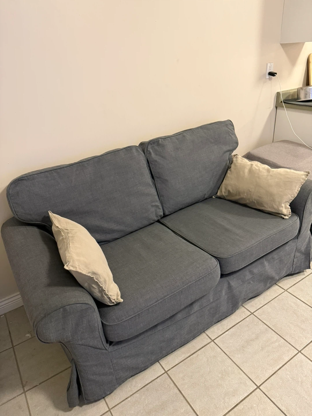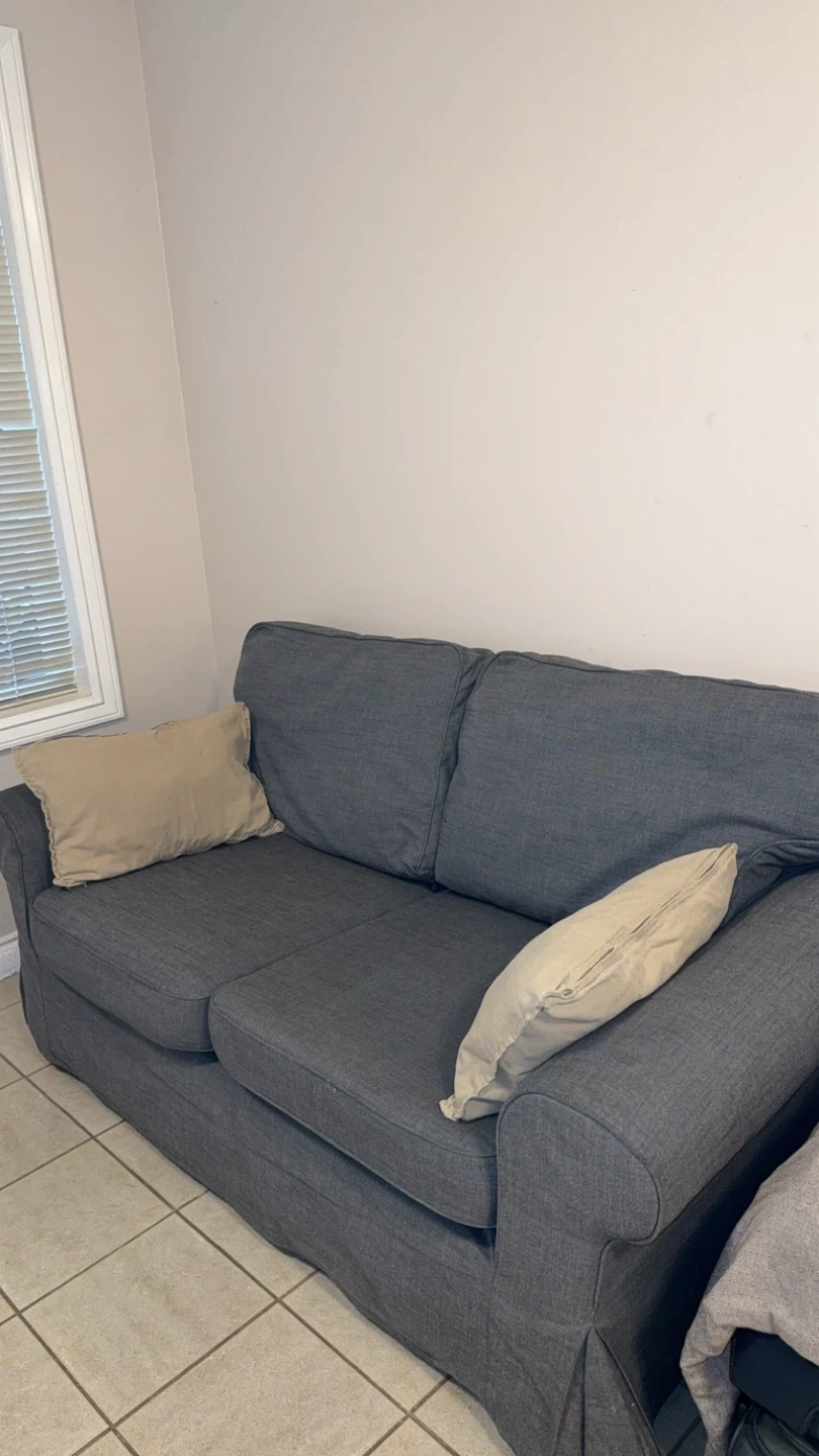 Selling a comfy grey loveseat sofa from IKEA. It's in good condition and perfect for a small space. A great addition to any living room or den!