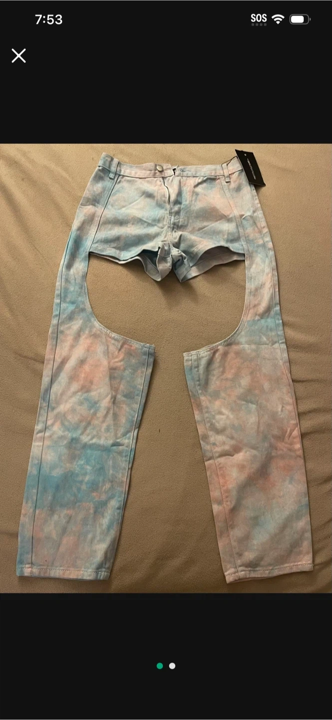 These are a pair of tie-dye denim chaps from PrettyLittleThing. They're a unique and stylish piece to add to your wardrobe!