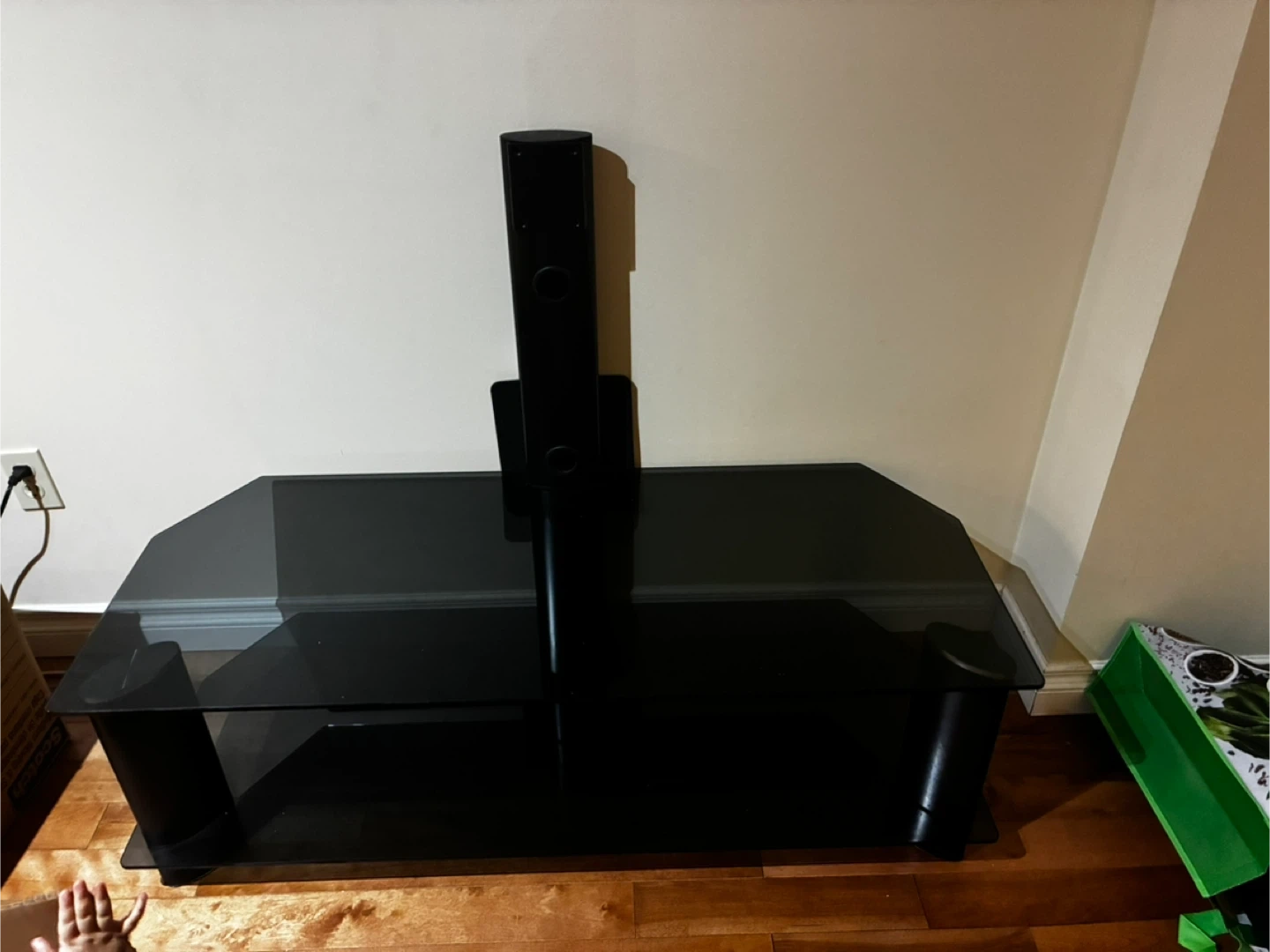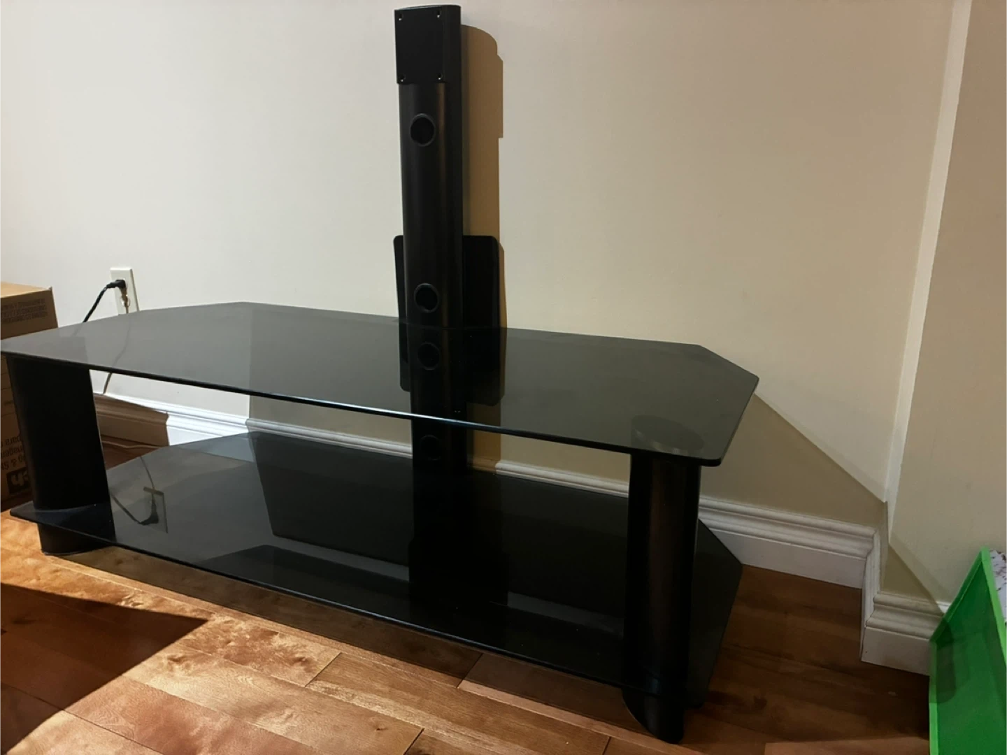 Selling a sleek black glass TV stand. It's in great shape and ready to hold your television and media devices. It features a sturdy design and a modern look that will fit well in any living room