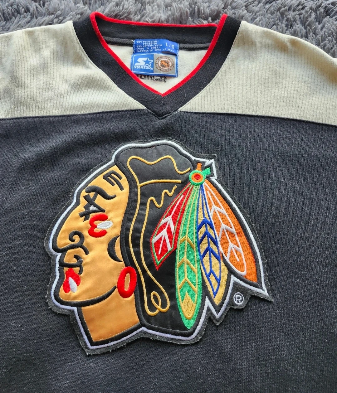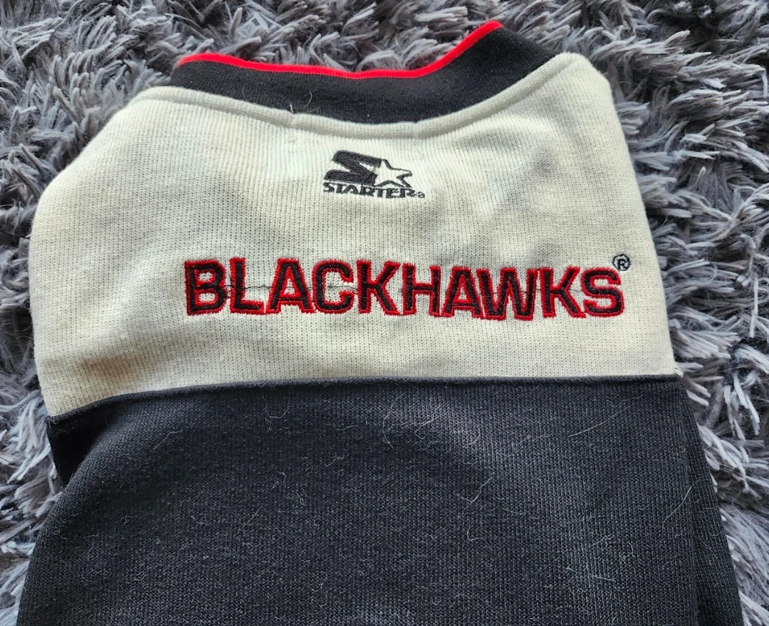 Selling a Starter Blackhawks jersey, size L. The jersey features Blackhawks logo on the front and "BLACKHAWKS" embroidered on the back. Polyester/Cotton knit. In great condition.