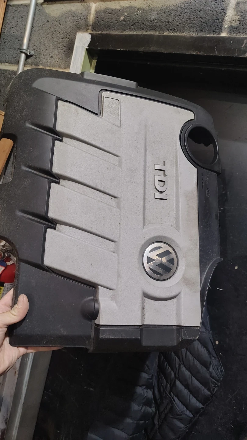 Selling a used Volkswagen TDI engine cover. It has some wear and tear, but is in overall good condition and ready to use!