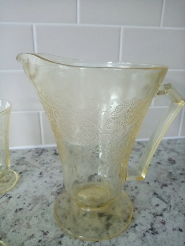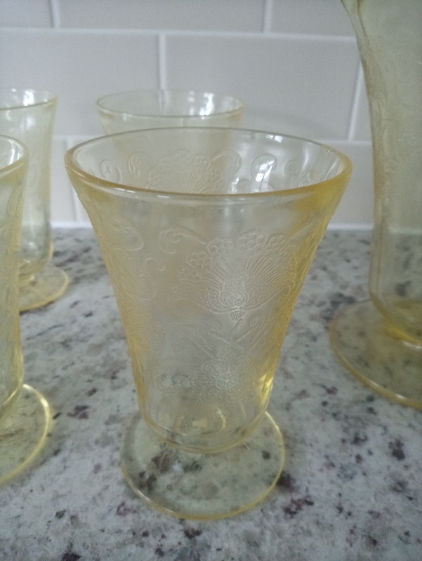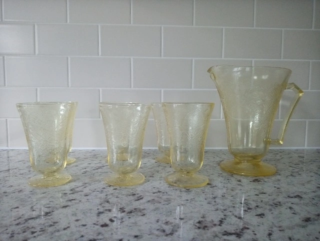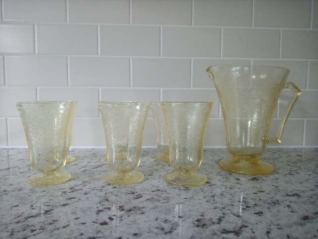 Hazel Atlas pitcher and 6 footed tumblers in the Florentine/Poppy No. 2 pattern. In excellent condition. No cracks, chips or any defects. Have been displayed in family china cabinet for years but never used. Not willing to seperate (selling the set). Pickup in Newmarket (Leslie & St John Siderd)