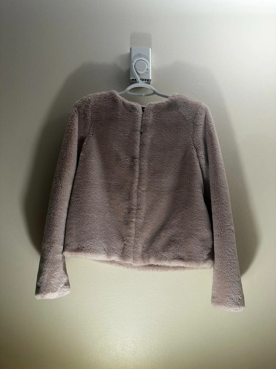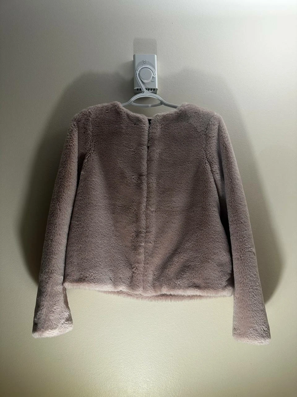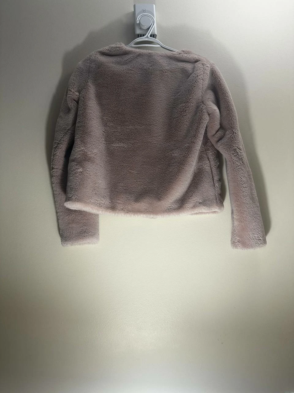 Selling a cozy faux fur jacket! It's a size extra small and comes in a lovely light pink colour. Perfect for adding a touch of warmth and style to any outfit.