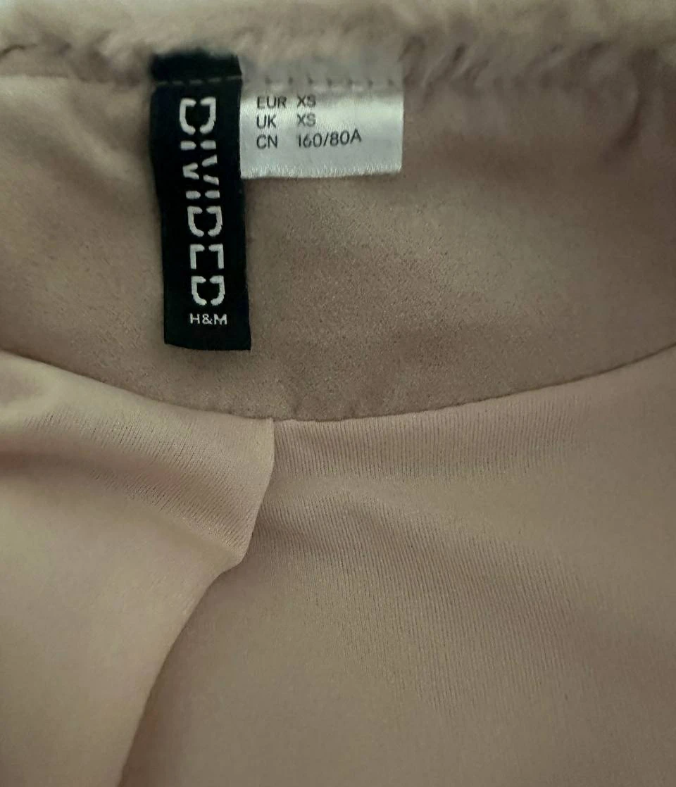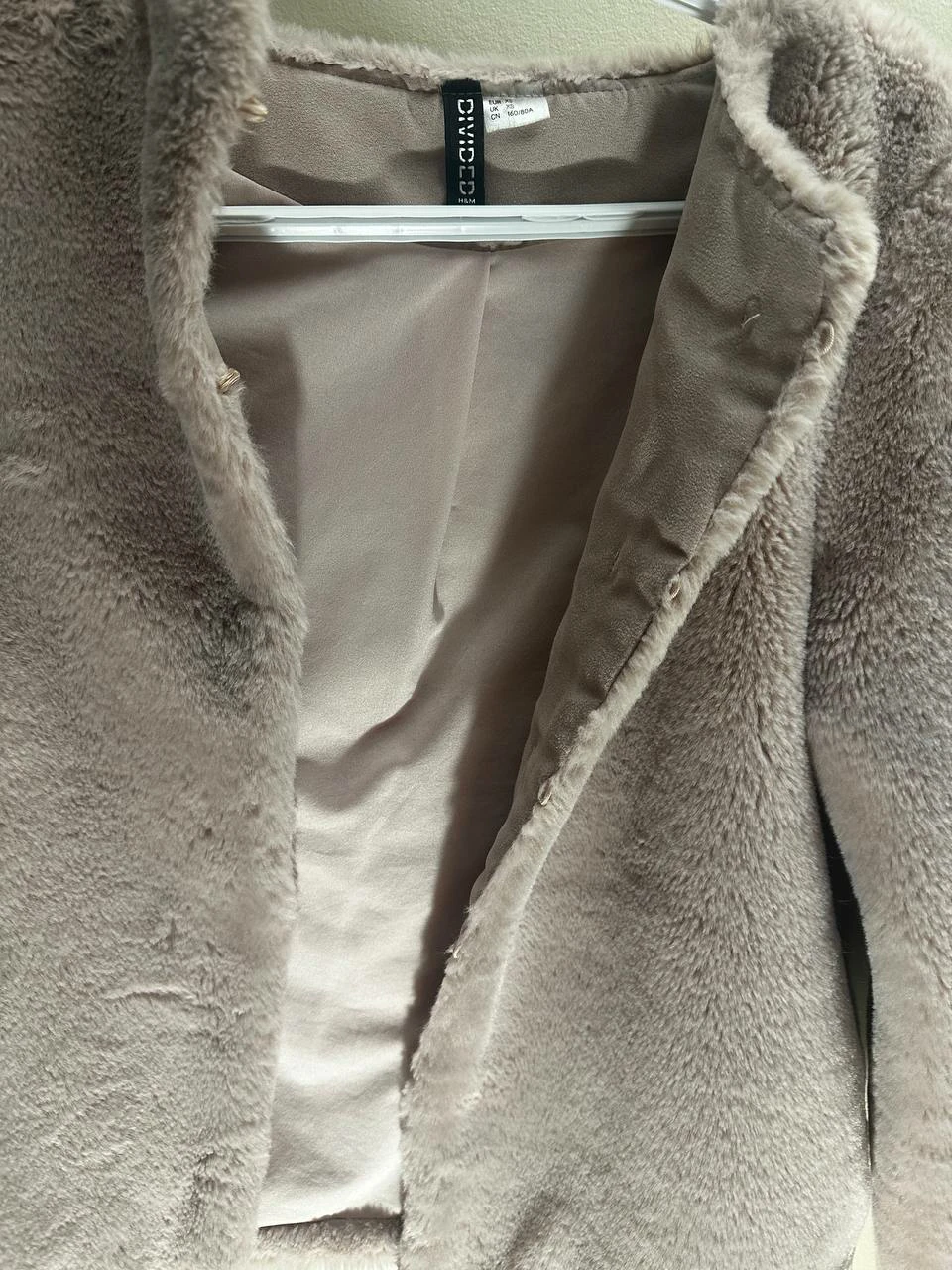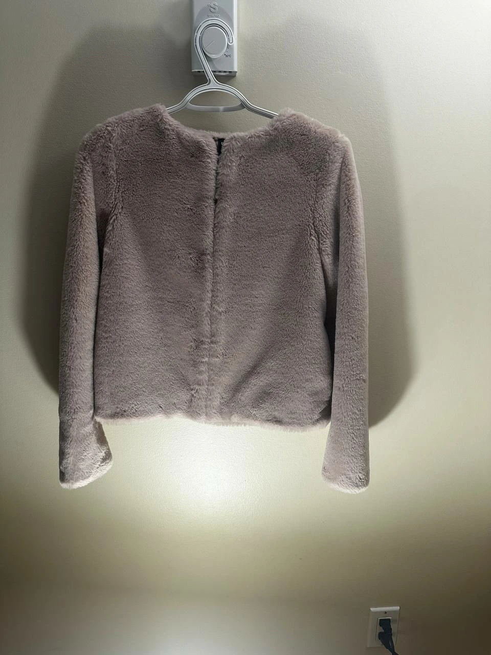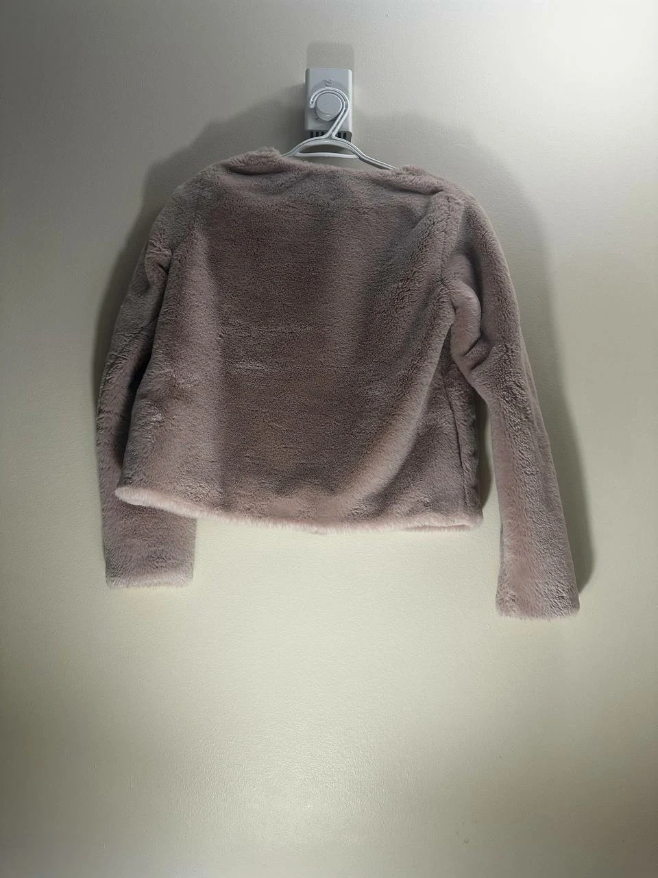 Selling a cozy faux fur jacket! It's a size extra small and comes in a lovely light pink colour. Perfect for adding a touch of warmth and style to any outfit.