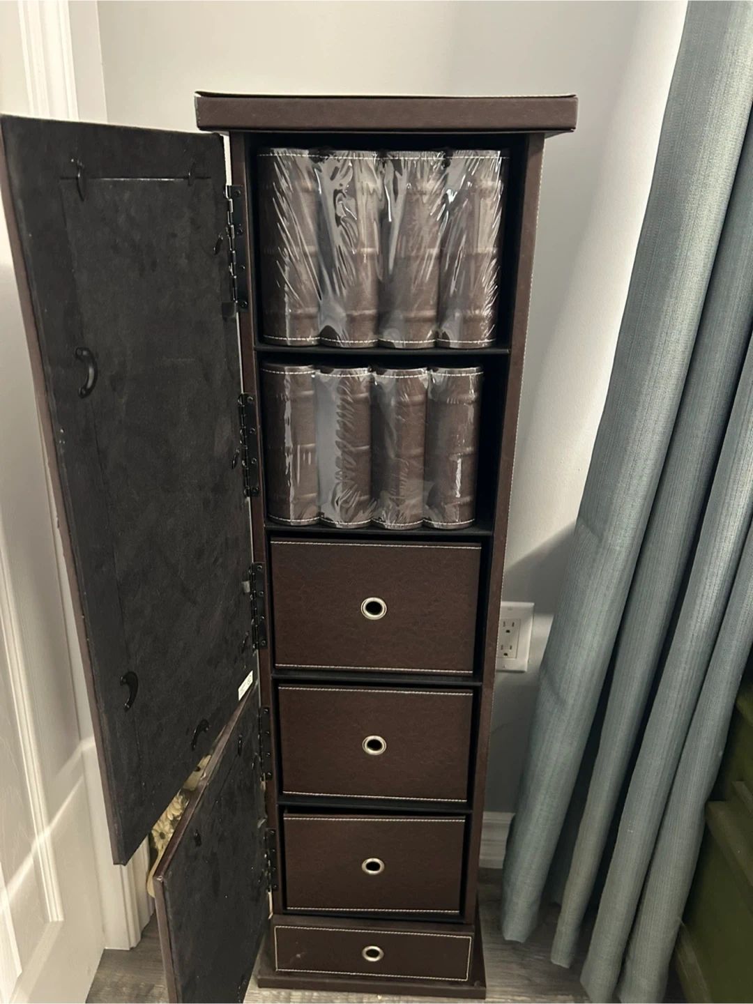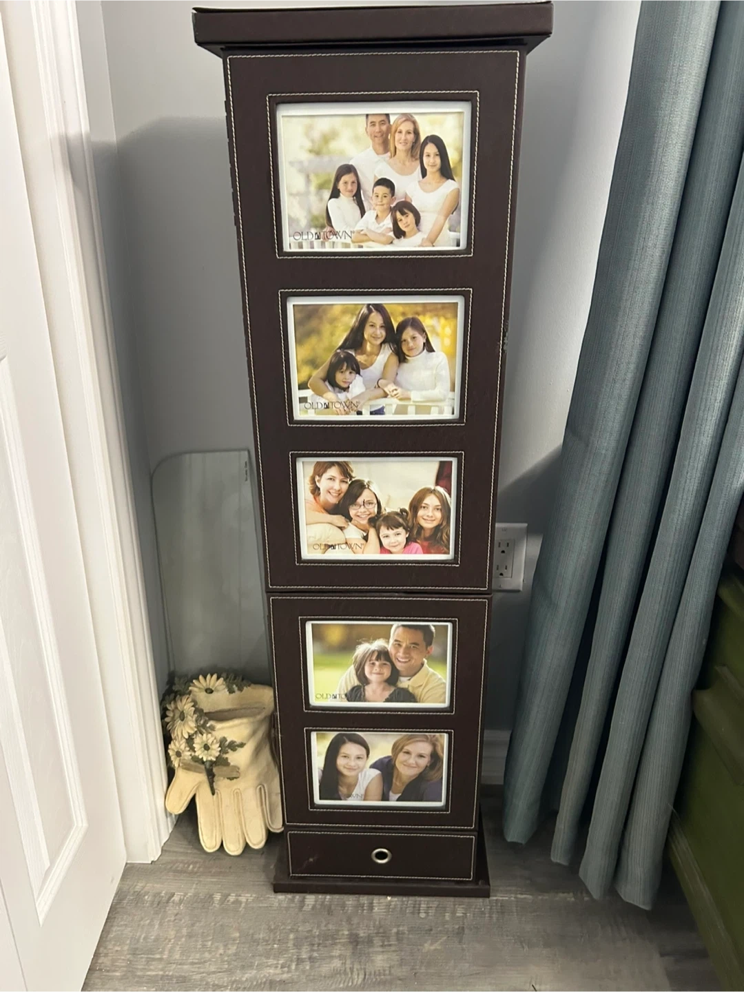 This is a lovely brown photo frame tower! It has space for multiple photos and also includes storage drawers. It's a great way to display your favourite memories and keep things organized at the same time
