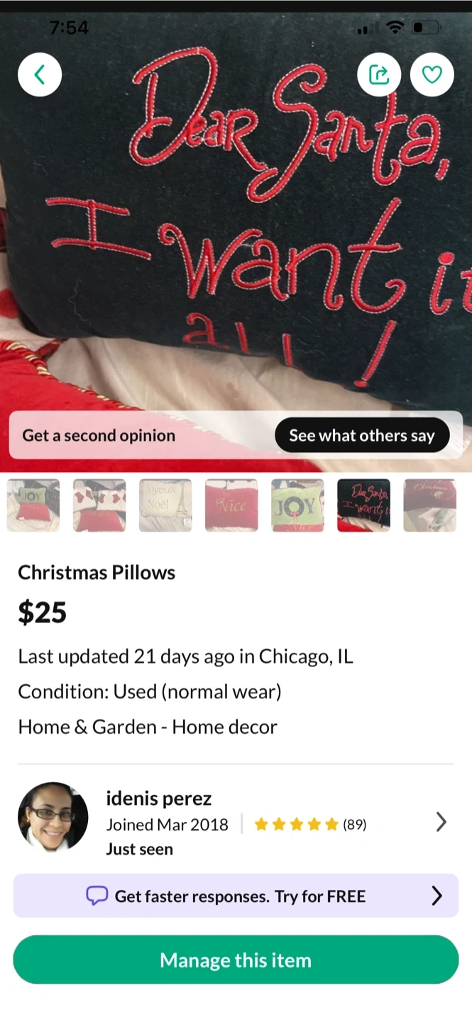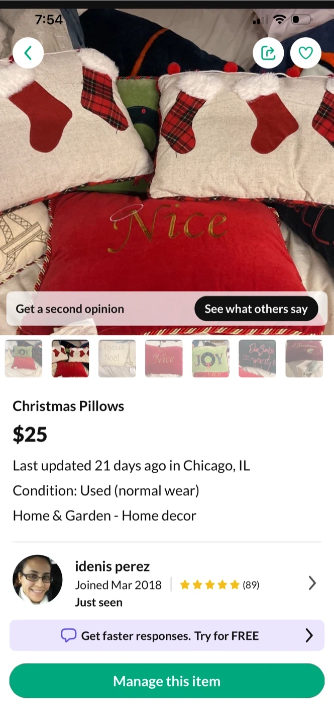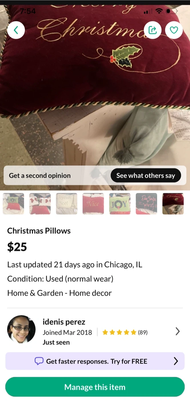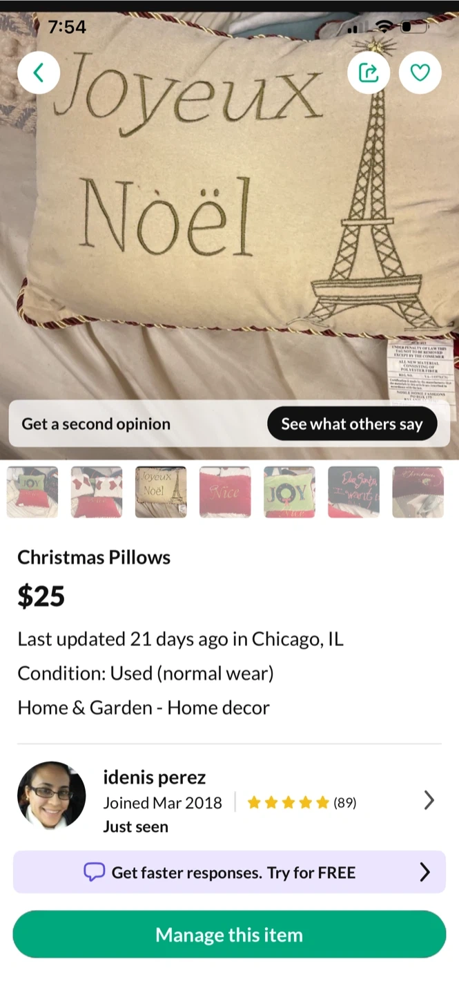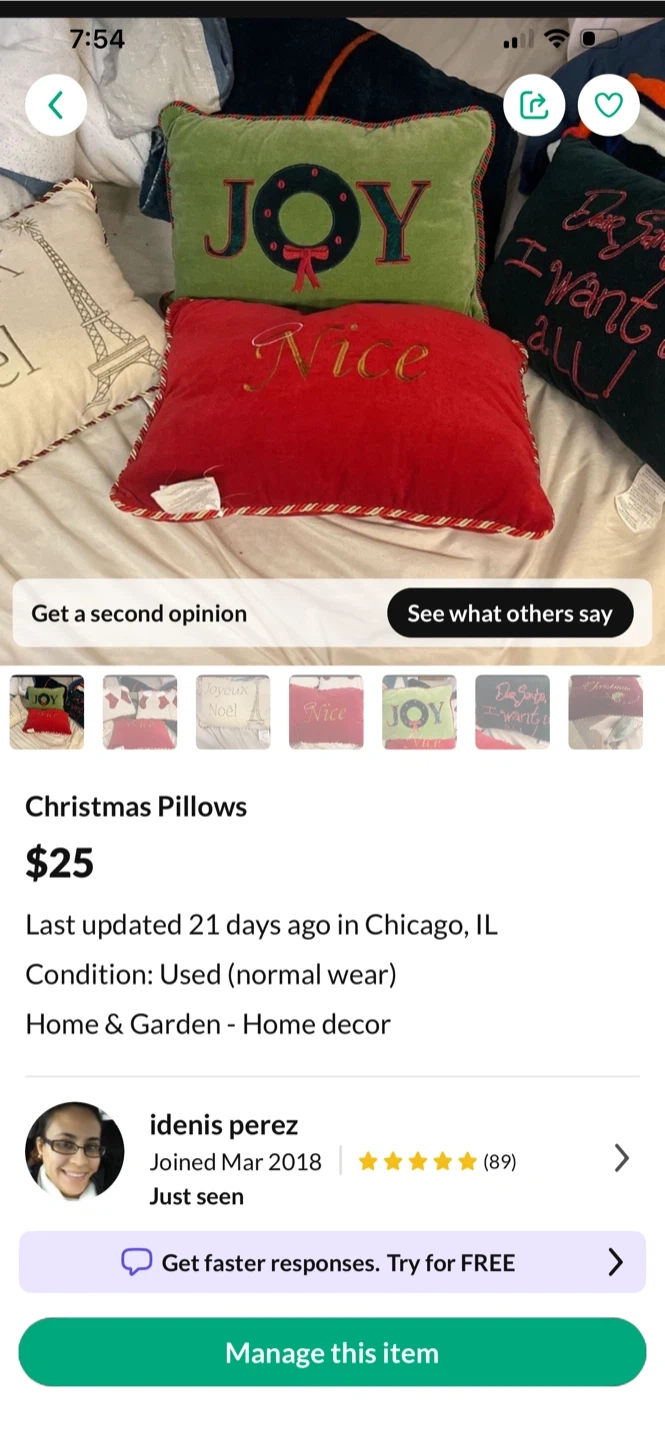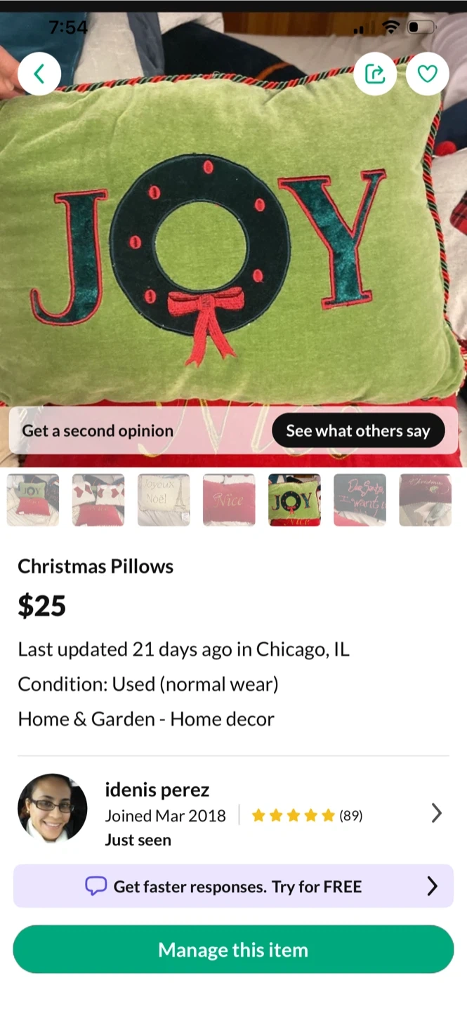 Buy & SellChristmas Decorative PillowsChristmas Decorative Pillows$25Get into the holiday spirit with these festive Christmas pillows! They add a touch of cheer to any room. The pillows are in used condition with normal wear.ConditionGoodWHERE TO MEET60639View MapSELLERverifiedIdenisBelmont Cragin19611 reviews0 chats·0 favorites·11 viewsSEND CHAT TO SELLERHi Idenis! I’m interested in your listing.Hi Idenis! I’m interested in your listing.Get the Karrot app to chatSign In to chat