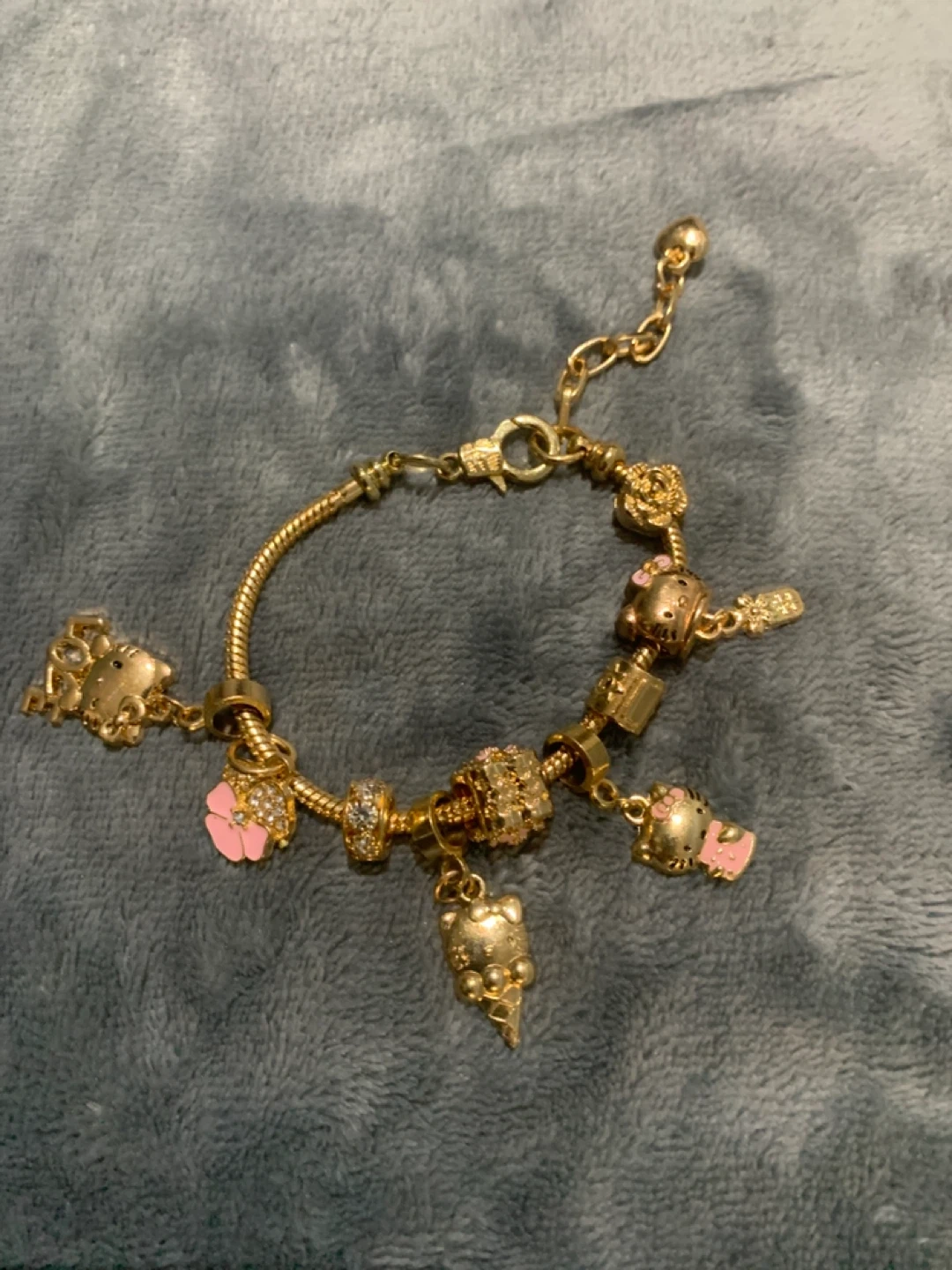 Selling a cute gold charm bracelet featuring Hello Kitty and flower charms! It's in great condition and would be a sweet addition to any jewellery collection