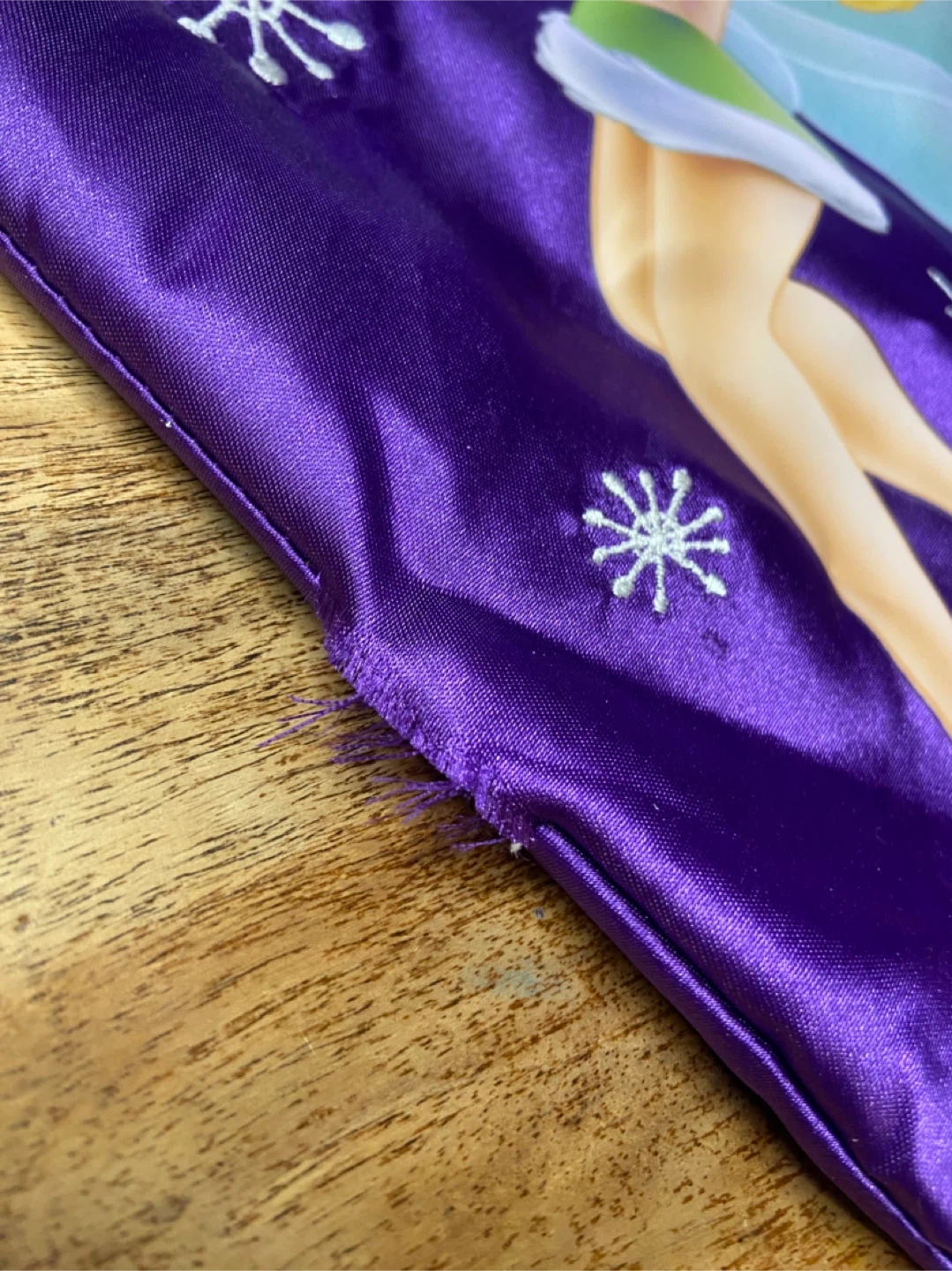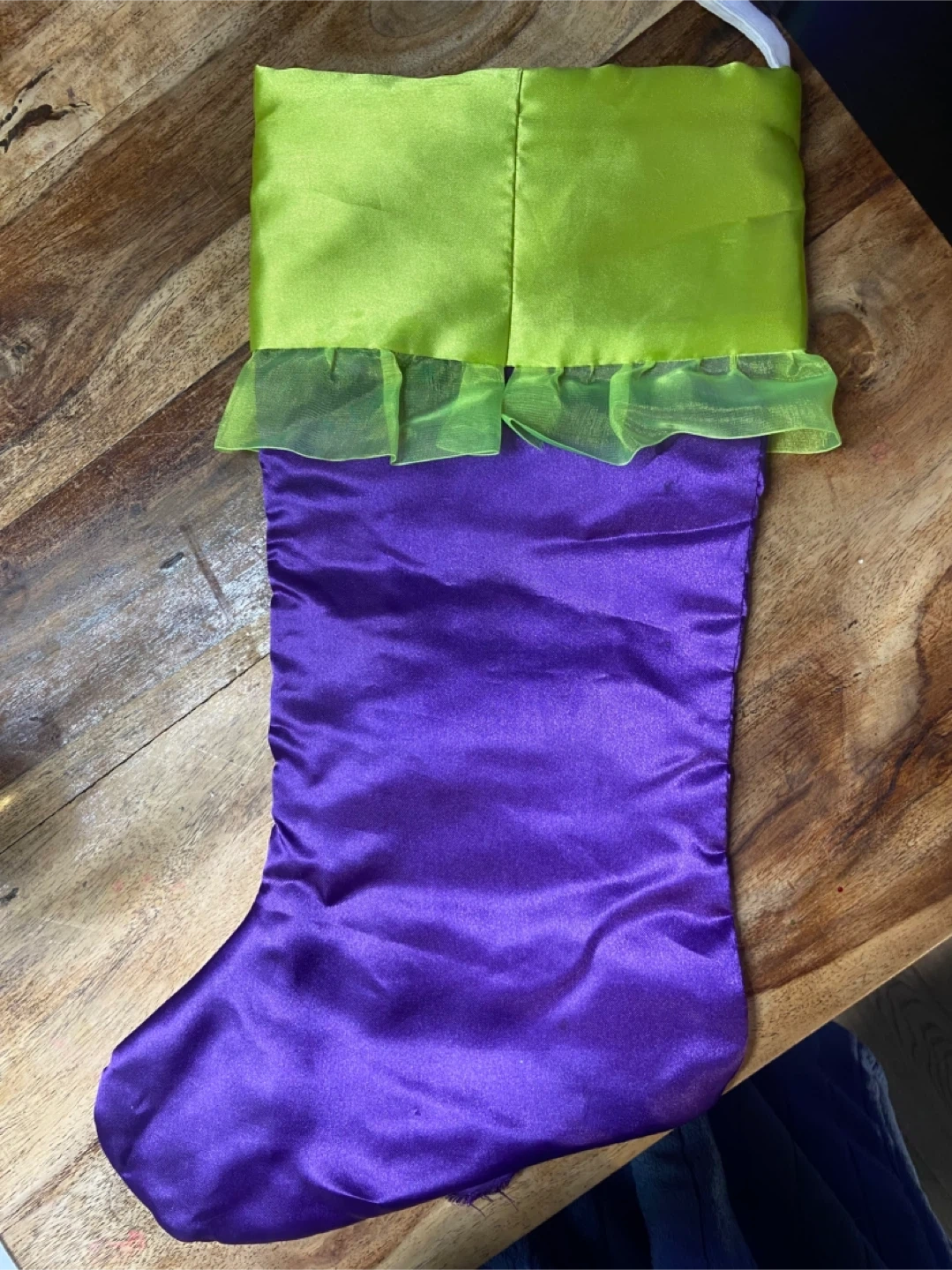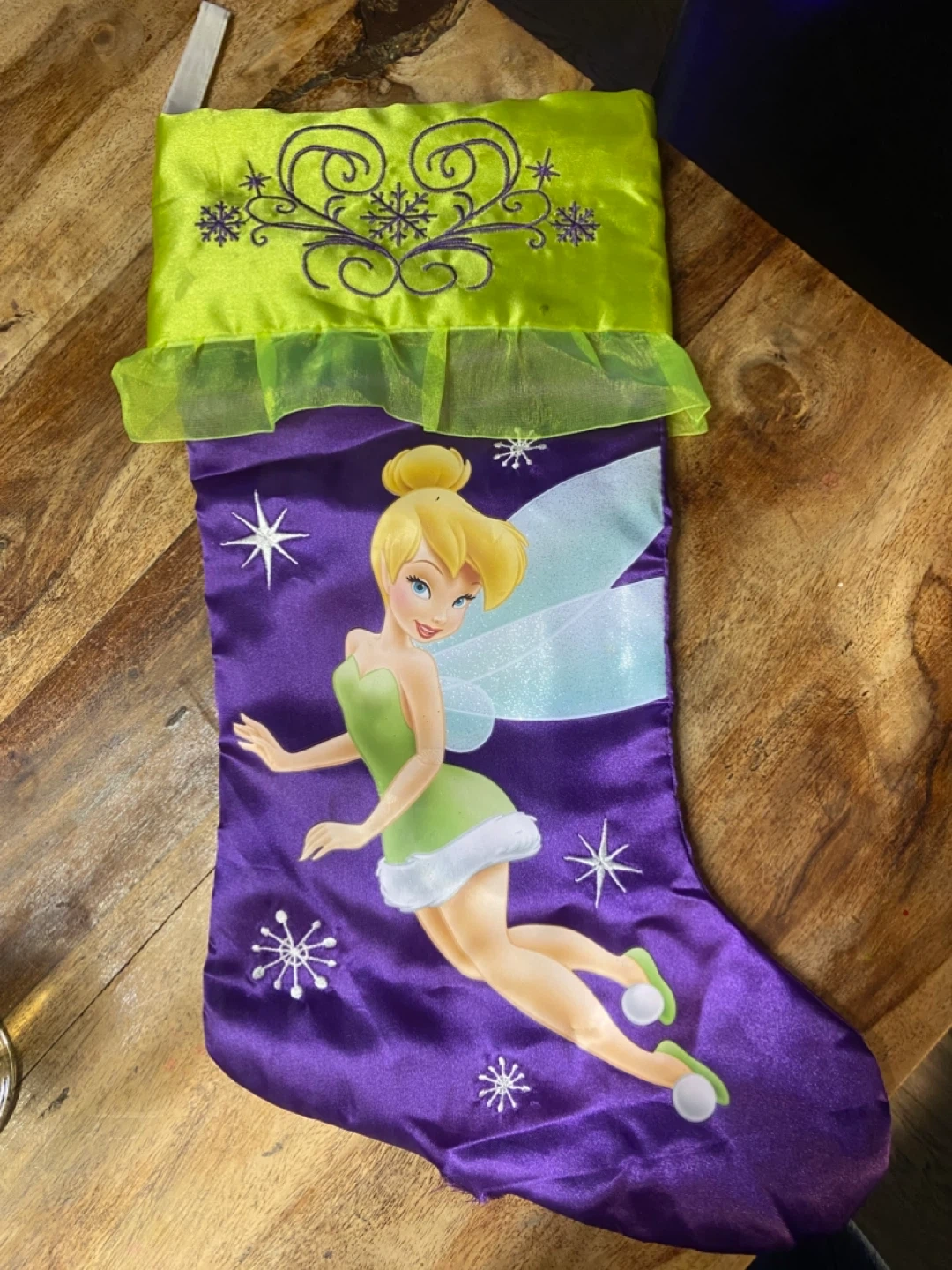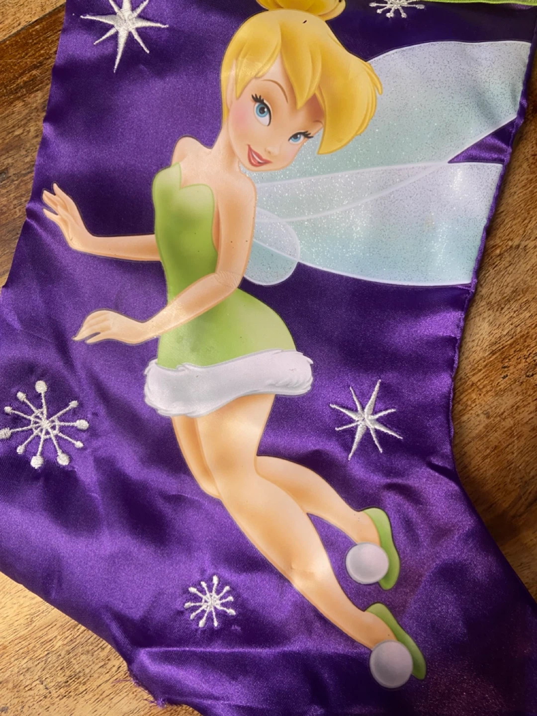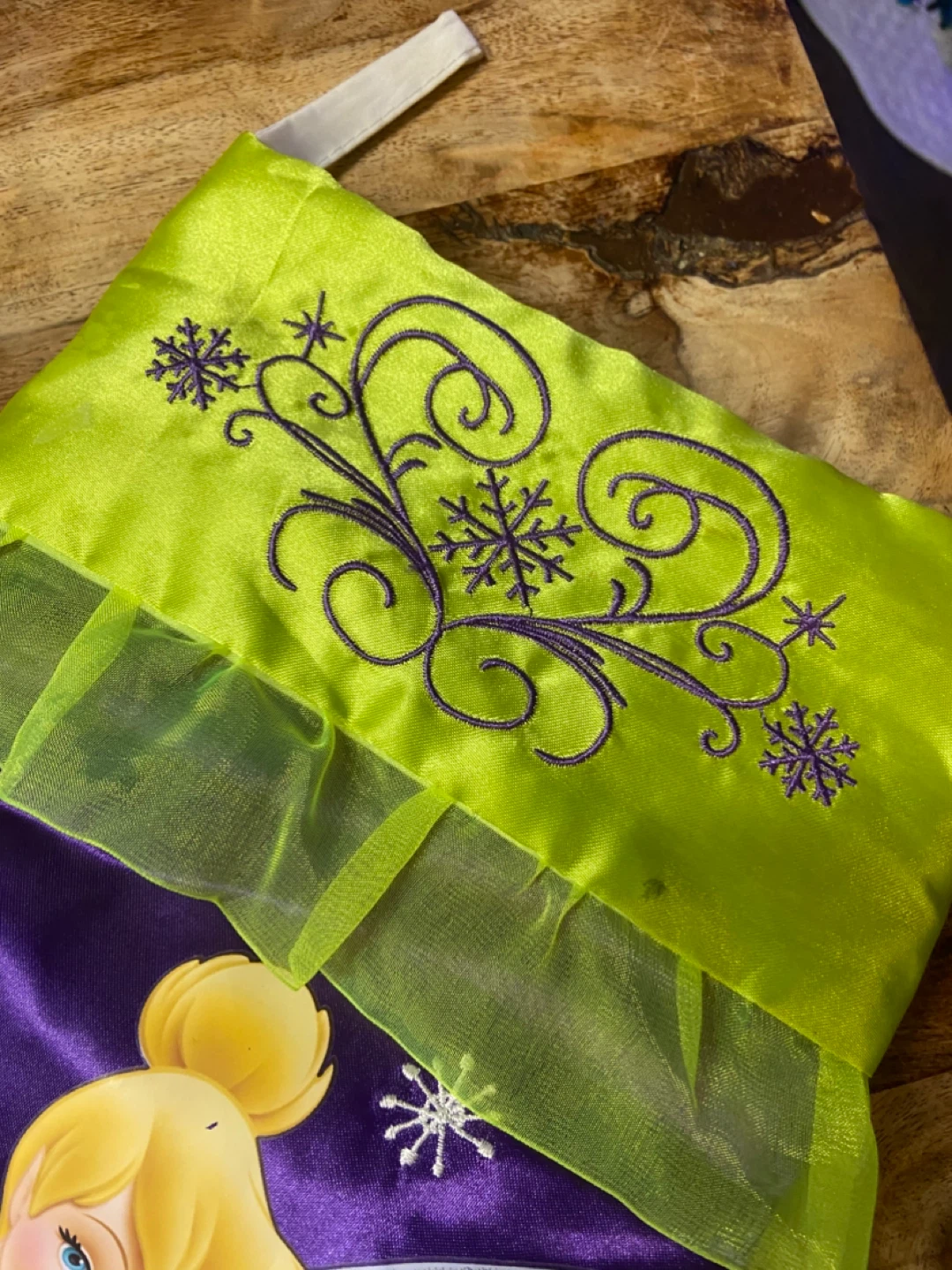 Here's a cute Disney Tinkerbell Christmas stocking! It's purple and green with a picture of Tinkerbell and snowflake embroidery. Perfect for the holidays!