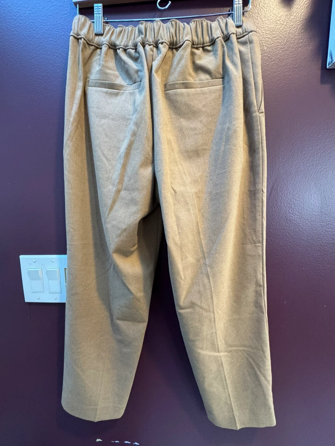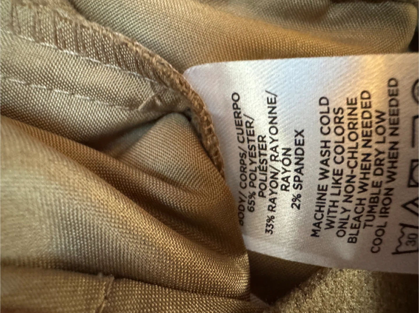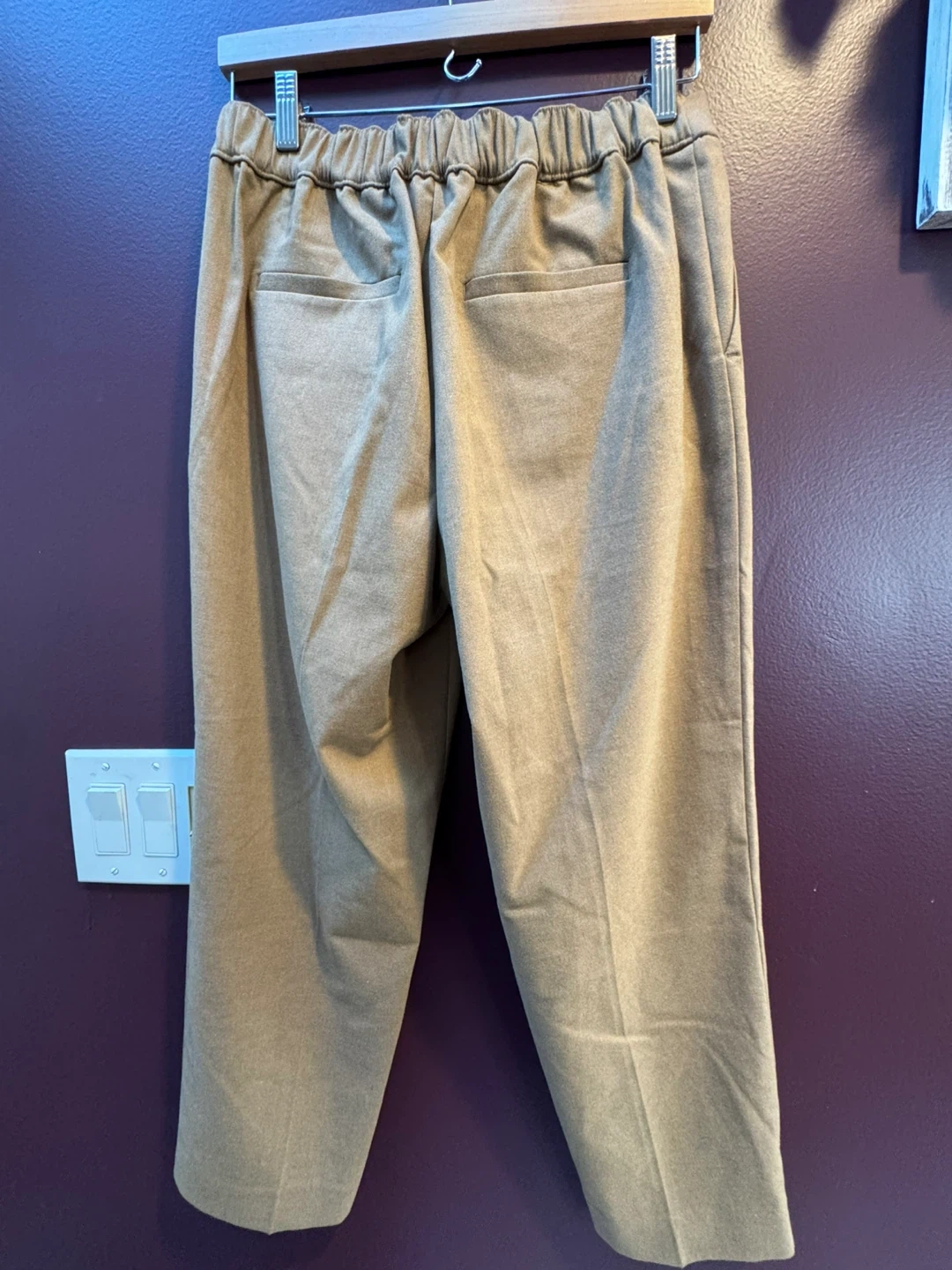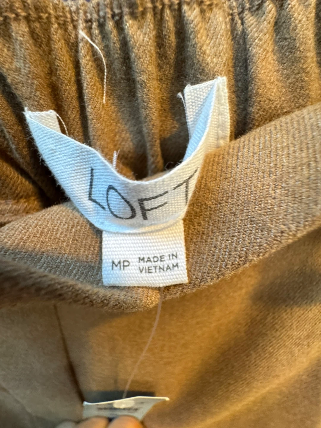 These are a pair of Loft pants in size MP. They are beige and made of 65% polyester, 33% rayon, and 2% spandex with elastic waistband, front pockets