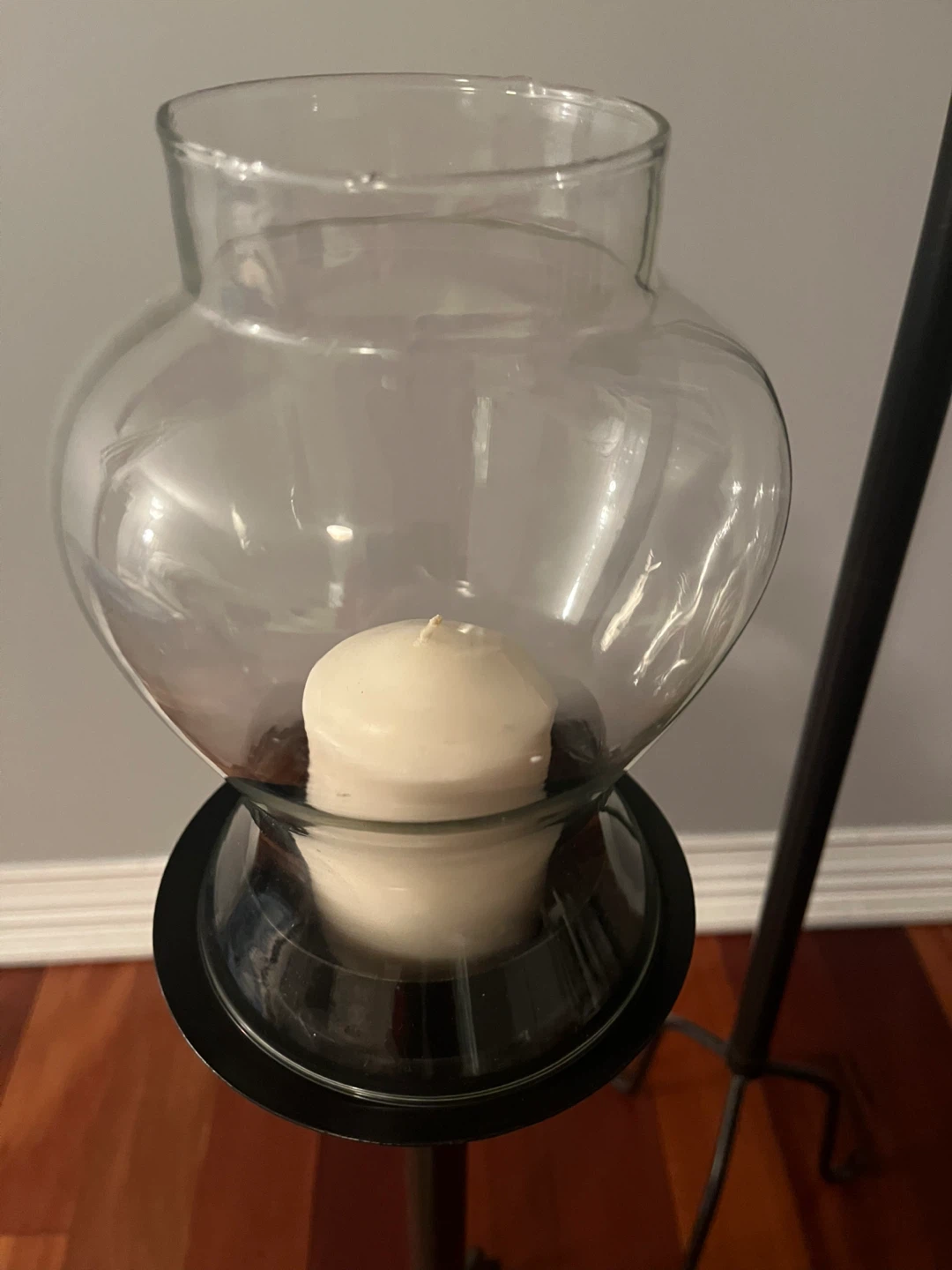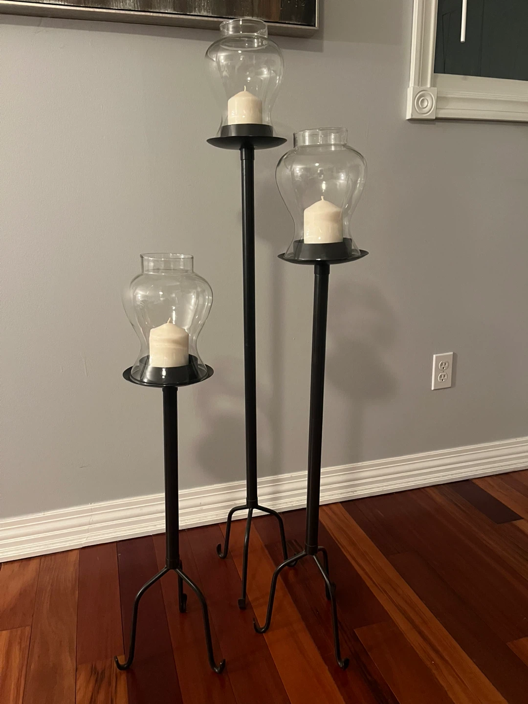 Selling a set of three candle holders! They're in great shape and would look lovely in any room. The candle holders are black metal stands with clear glass hurricanes on top. Perfect for creating a cozy atmosphere