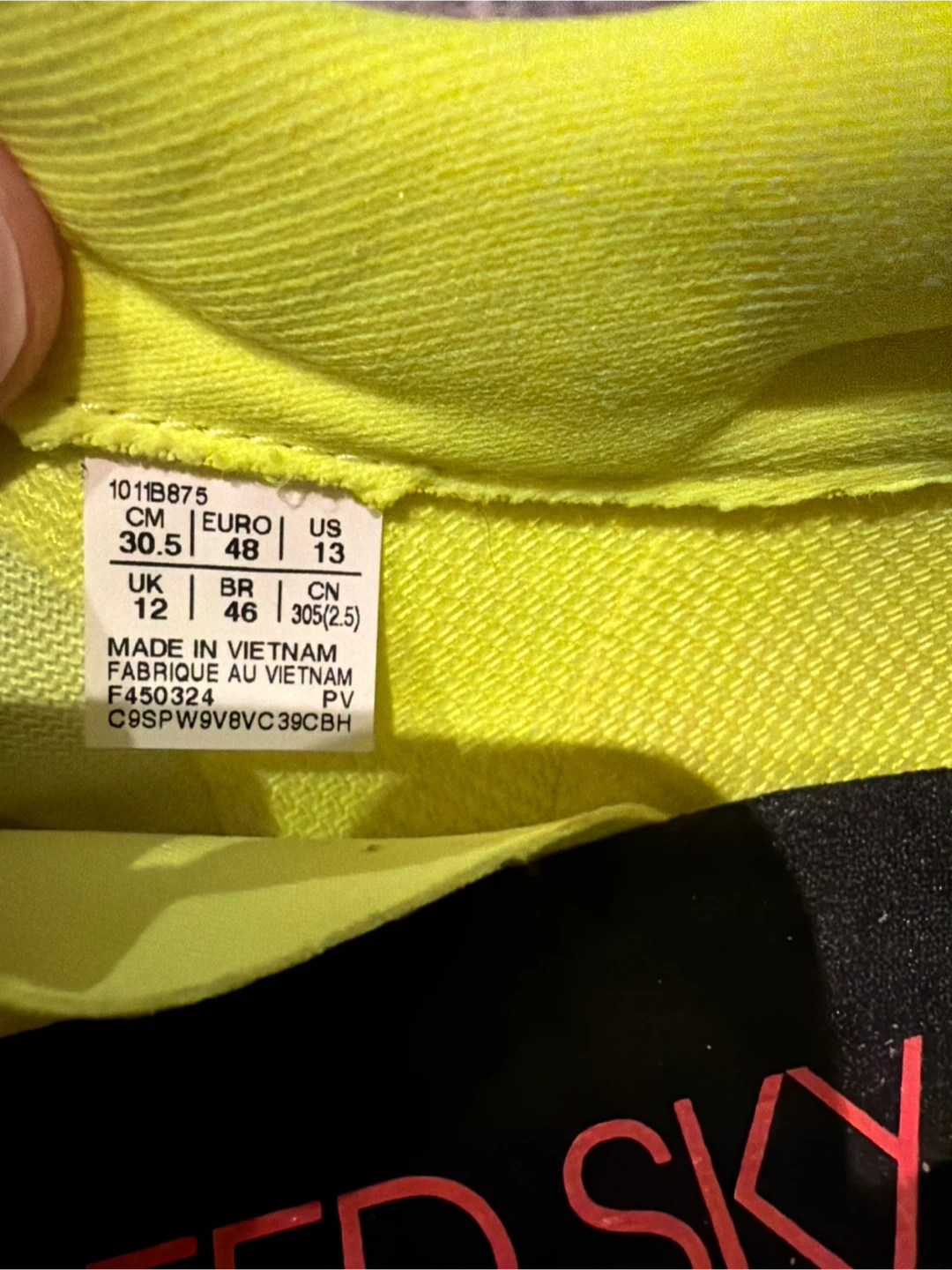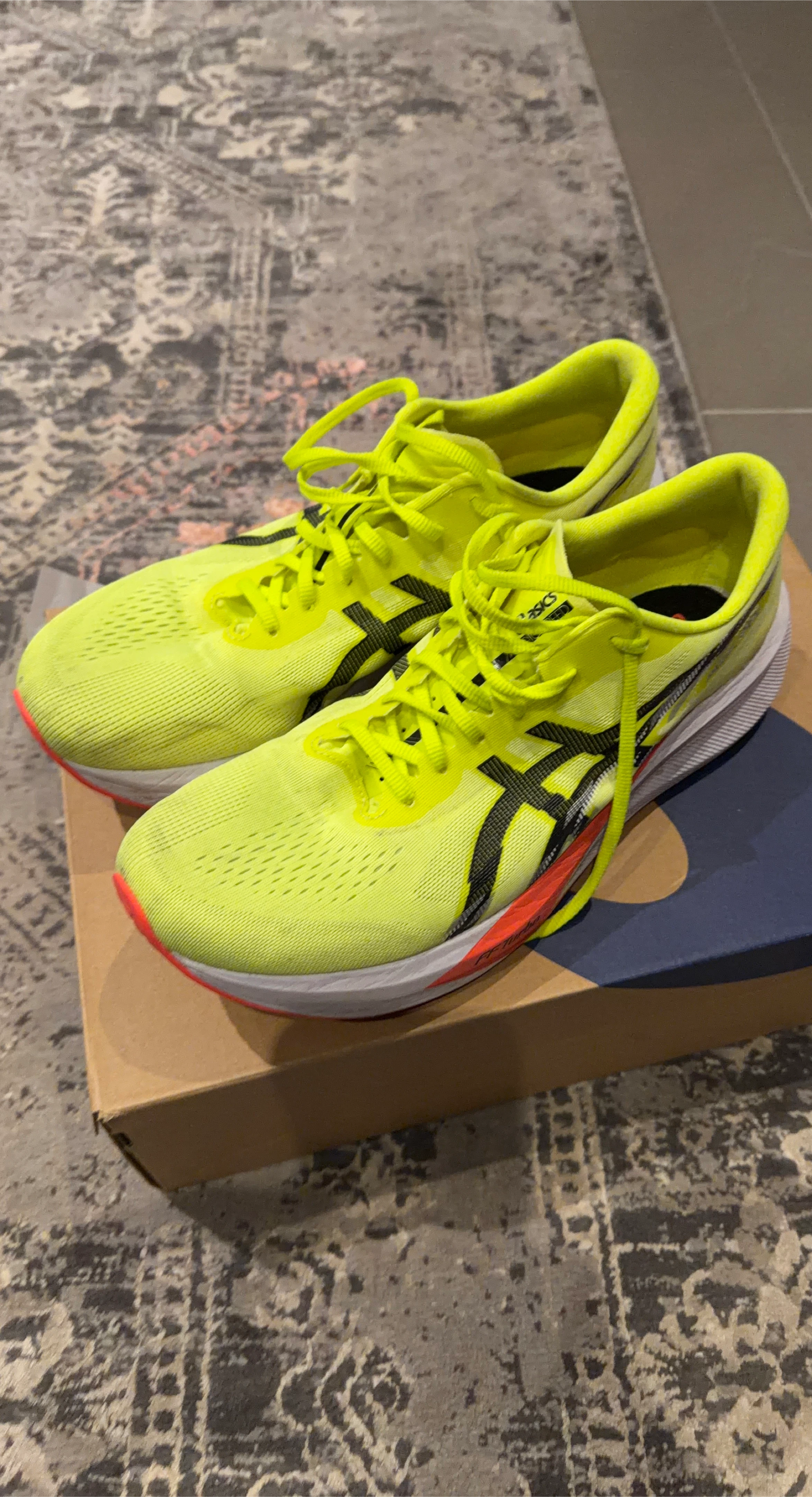 Selling a pair of Asics Magic Speed 3 running shoes in a vibrant yellow colour. Very good condition. Metaspeed Sky replacement insoles. These are a US size 13, EU size 48.