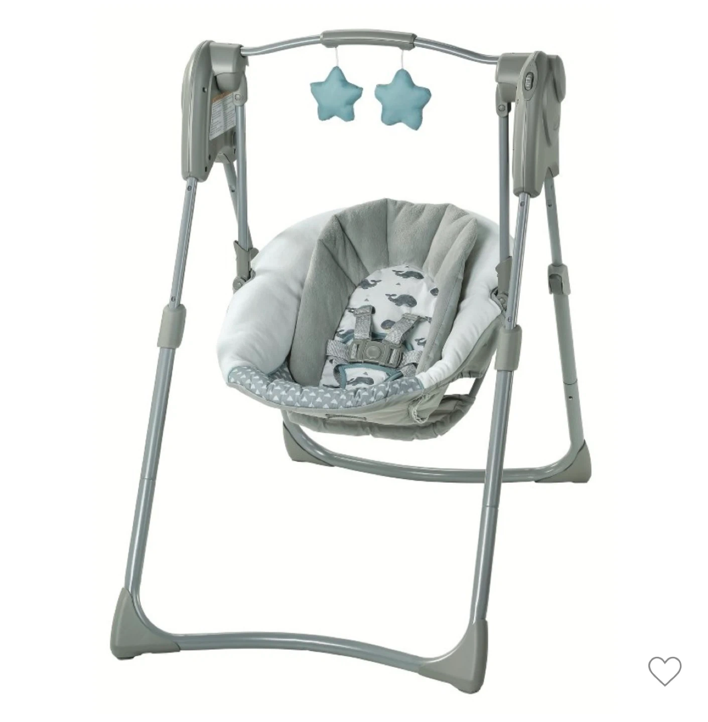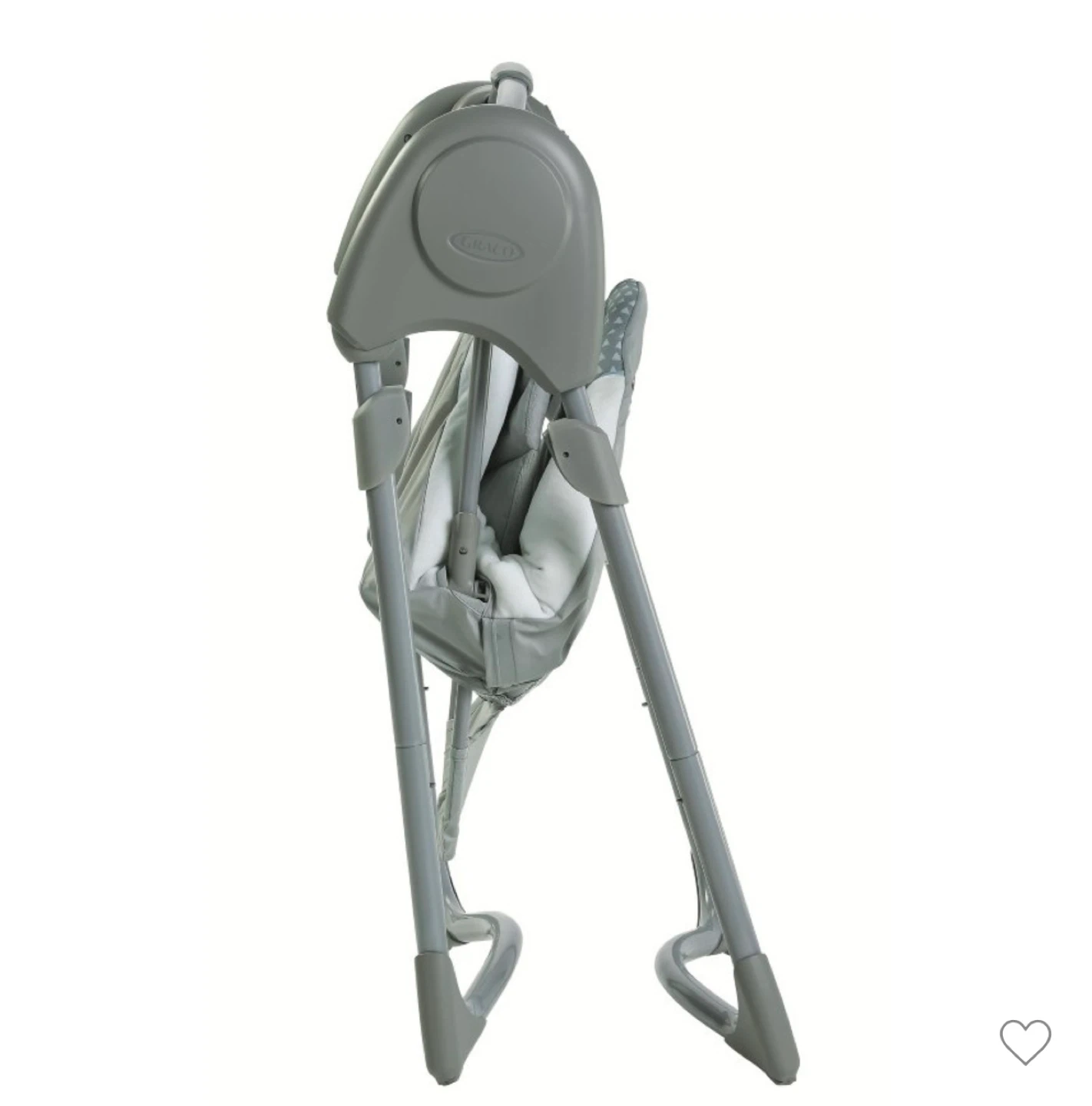 Selling a gently used Graco baby swing in great condition! It's perfect for soothing your little one with its gentle motion and cozy seat. The swing is grey and features a comfortable, plush seat with cute star attachments. It's lightweight and portable, making it easy to move from room to room