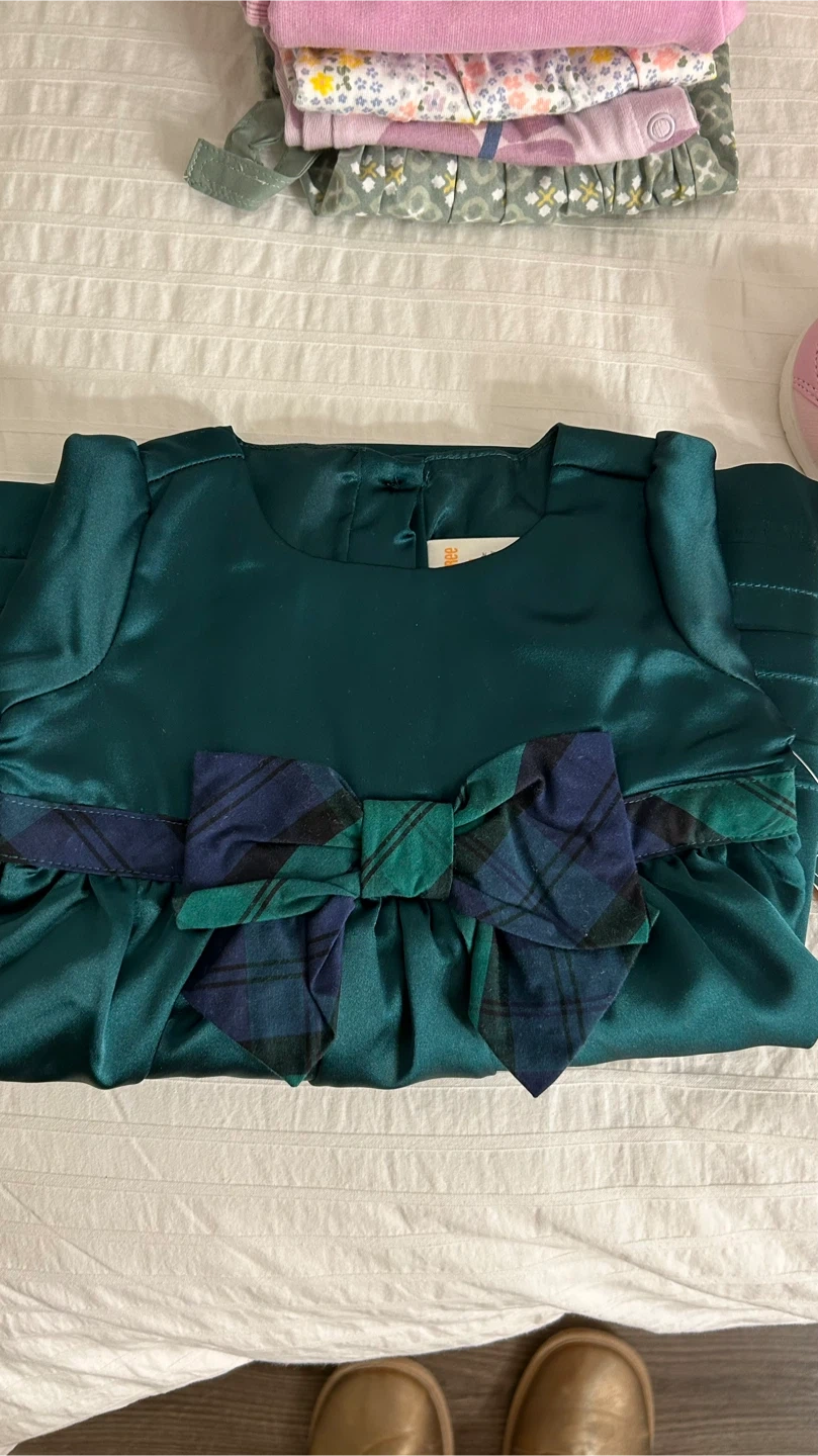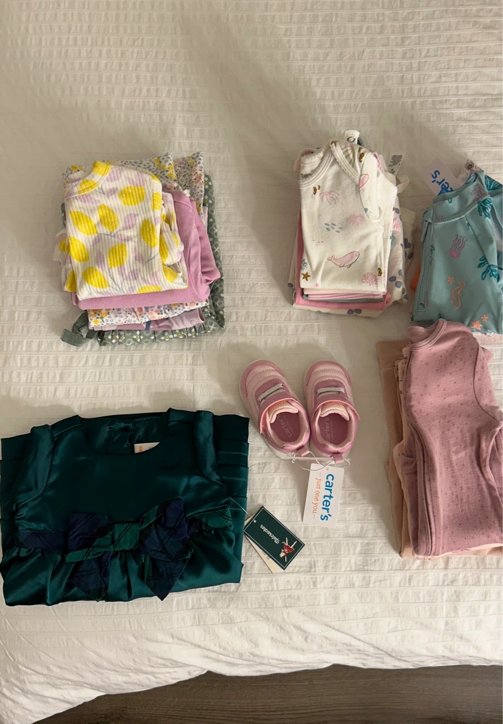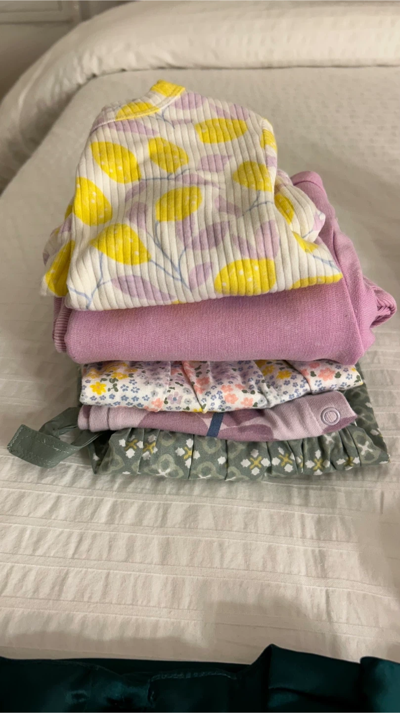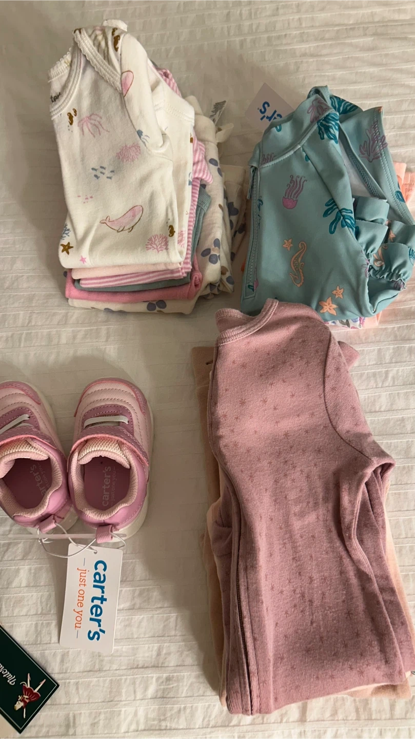 Selling a bundle of baby clothes, including items from Carter's! There's a variety of outfits and pieces included, like onesies, tops, and a dress. Perfect for a little one's wardrobe!