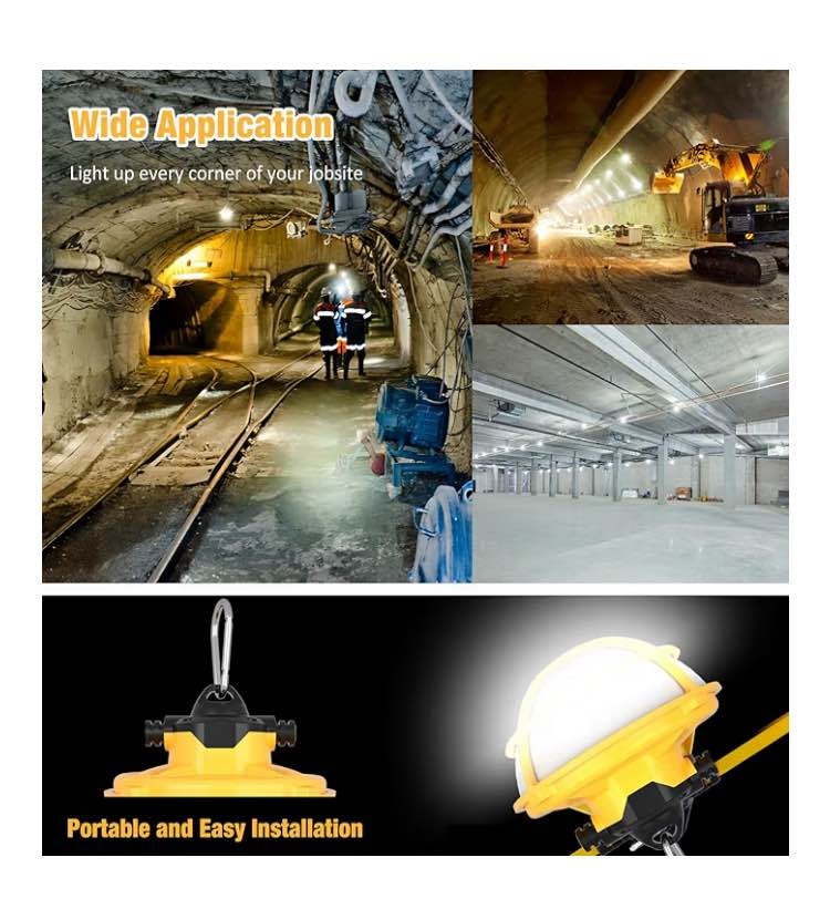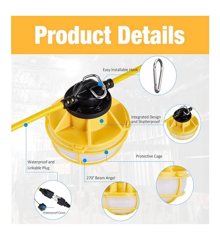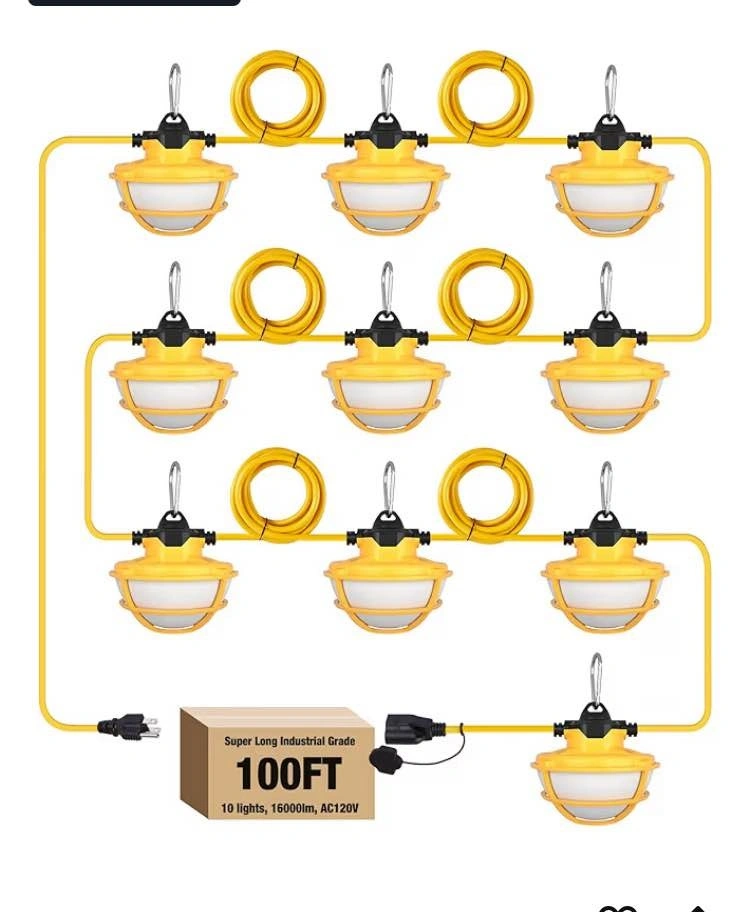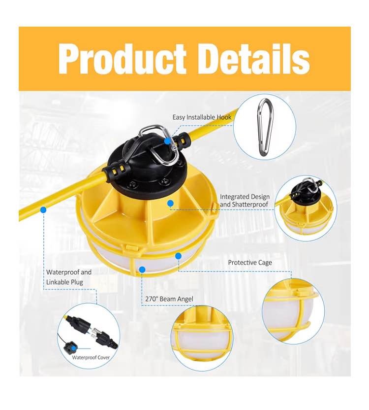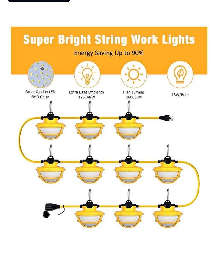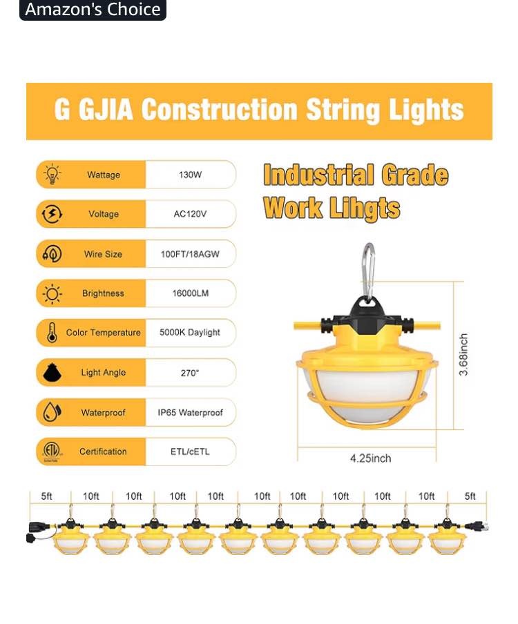 100FT Construction String Lights, 130W 16000LM Industrial Grade 3 Prong LED String Work Lights for Construction Sites, Temporary Work, Jobsite, Outdoor Lighting with Protective Cages, Hooks
