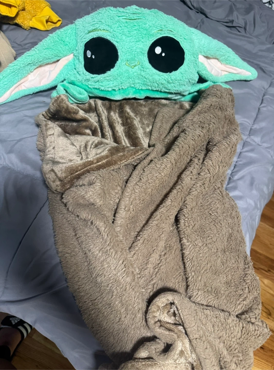 Snuggle up with this cozy Star Wars The Mandalorian Grogu hooded blanket! It features a soft, plush Grogu hood and a warm, brown blanket. Perfect for any Star Wars fan!