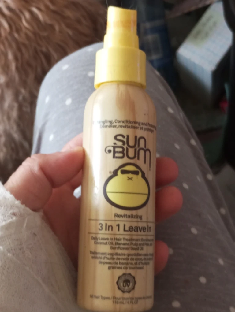 Selling a bottle of Sun Bum's Revitalizing 3 In 1 Leave In hair treatment. It's great for detangling, conditioning, and protecting your hair. It contains coconut oil, banana pulp, and sunflower seed oil. The bottle is 118 mL and new