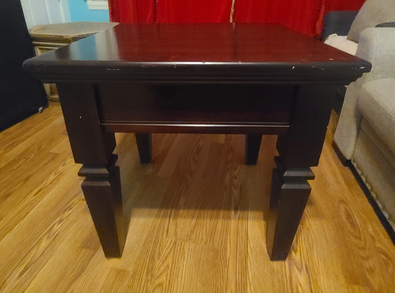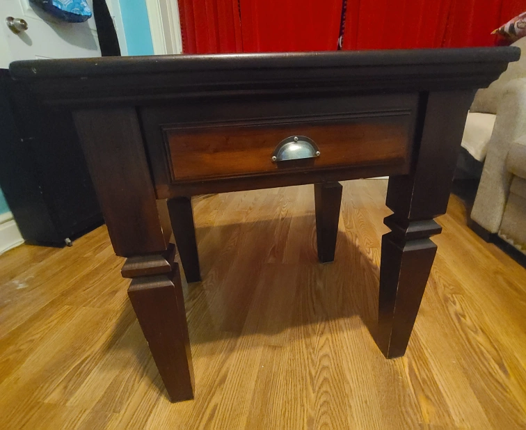 Selling a dark wood end table. It has a drawer with a silver colored pull. The table has a classic design that would fit well in a living room or bedroom. It's in good condition but has some scruff marks on the top.