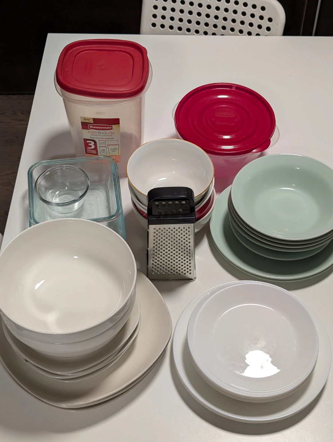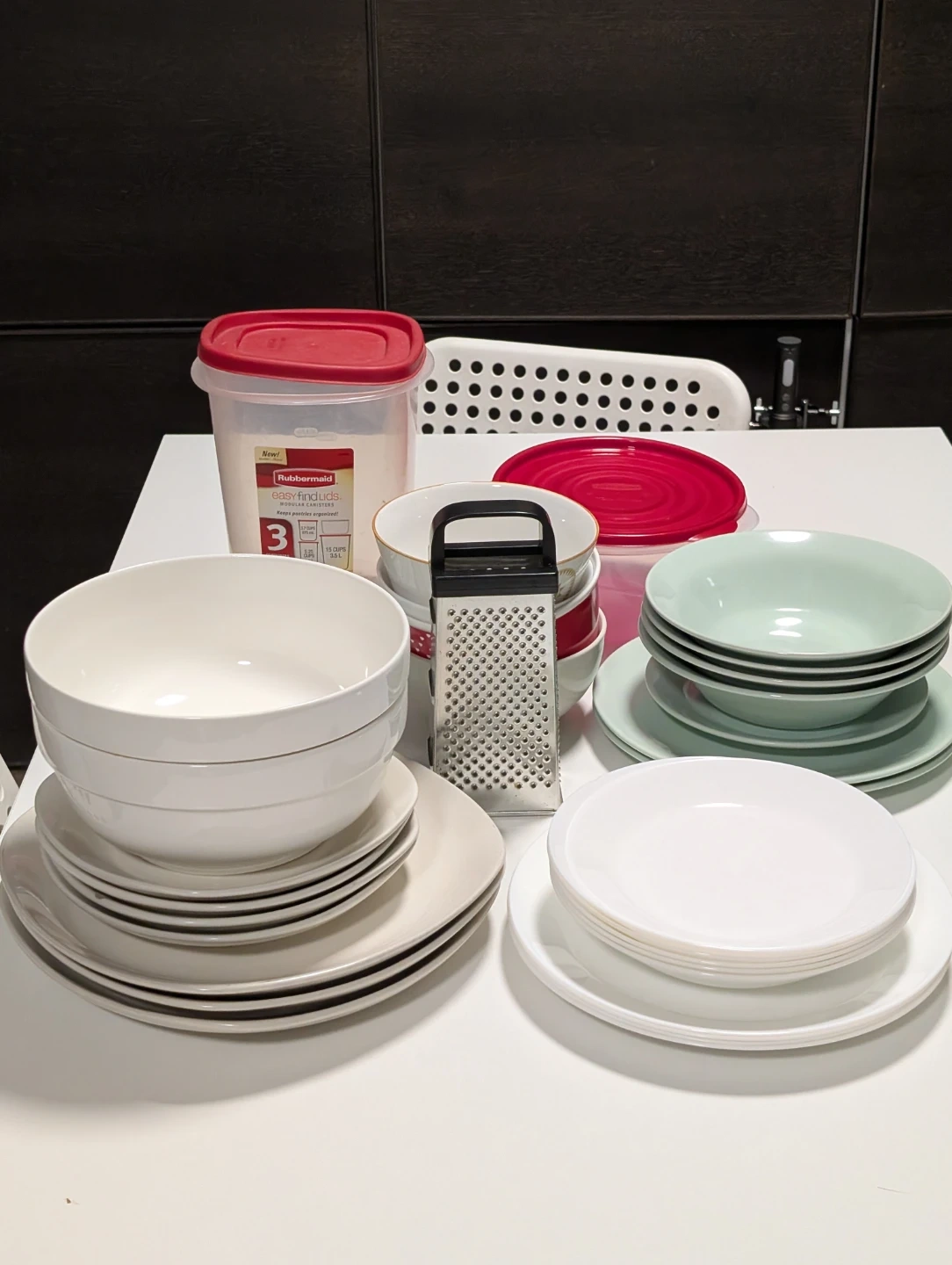 Selling a mixed set of kitchenware including bowls, plates, and Rubbermaid containers. Great for stocking up a new kitchen or adding to your collection! Includes a variety of sizes and styles.