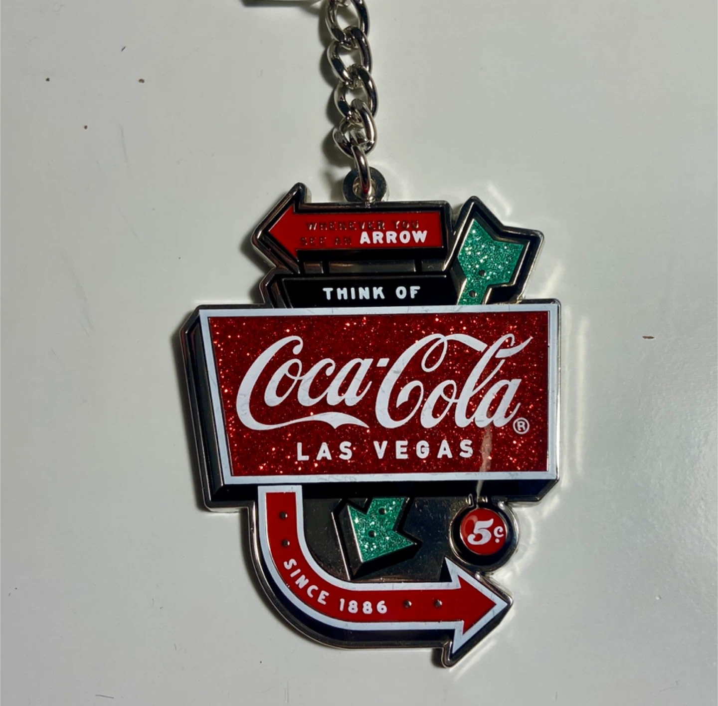 Here's a fun Coca-Cola keychain featuring a Las Vegas design! It has a retro sign look with glittery red and green accents. The keychain is in great condition and ready to add some sparkle to your keys or bag
