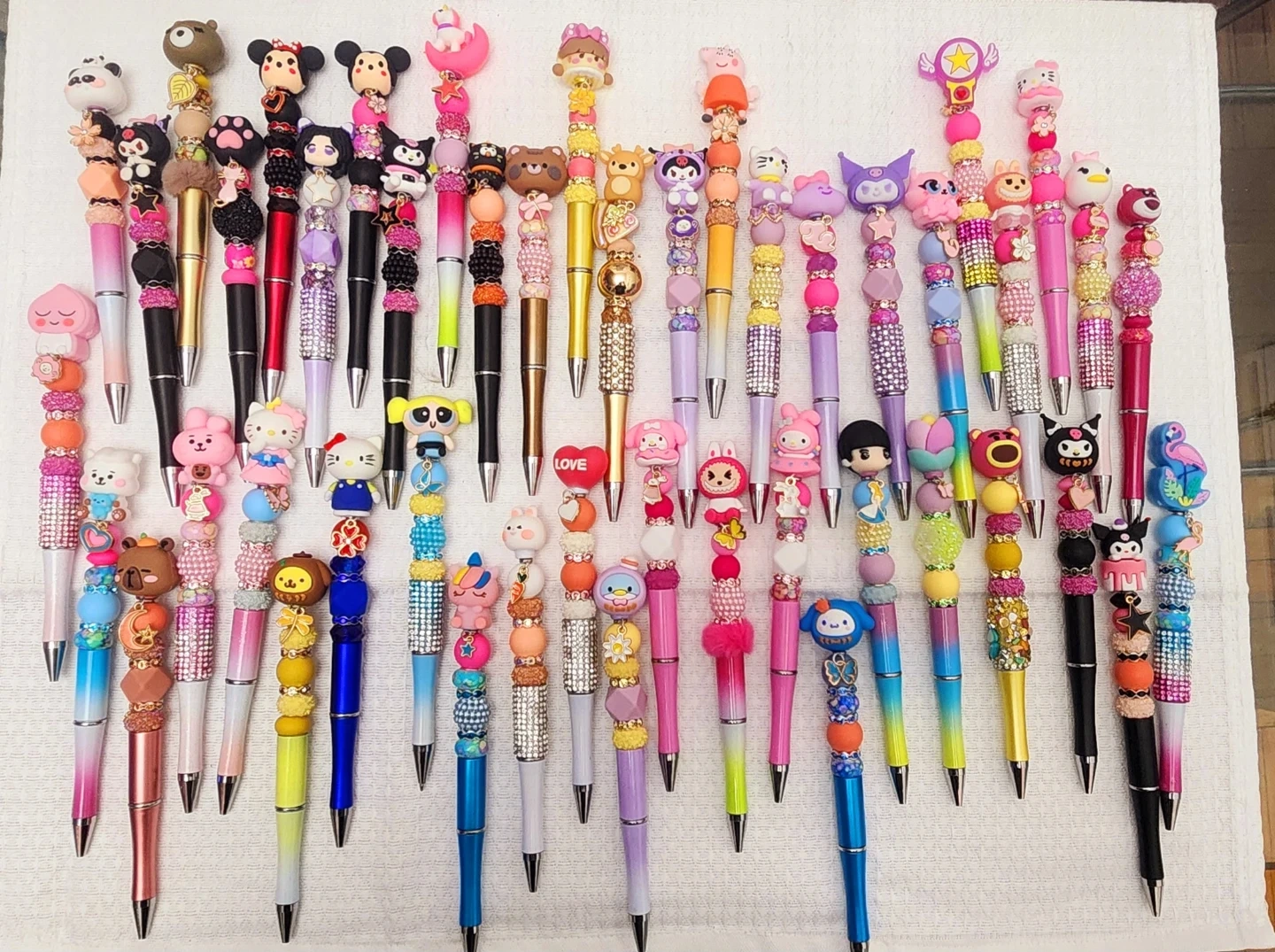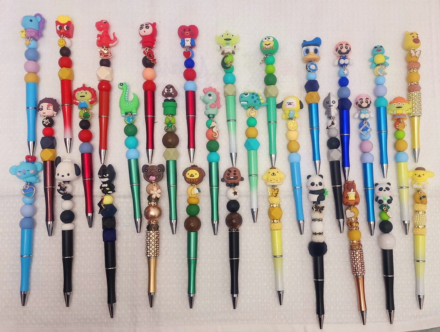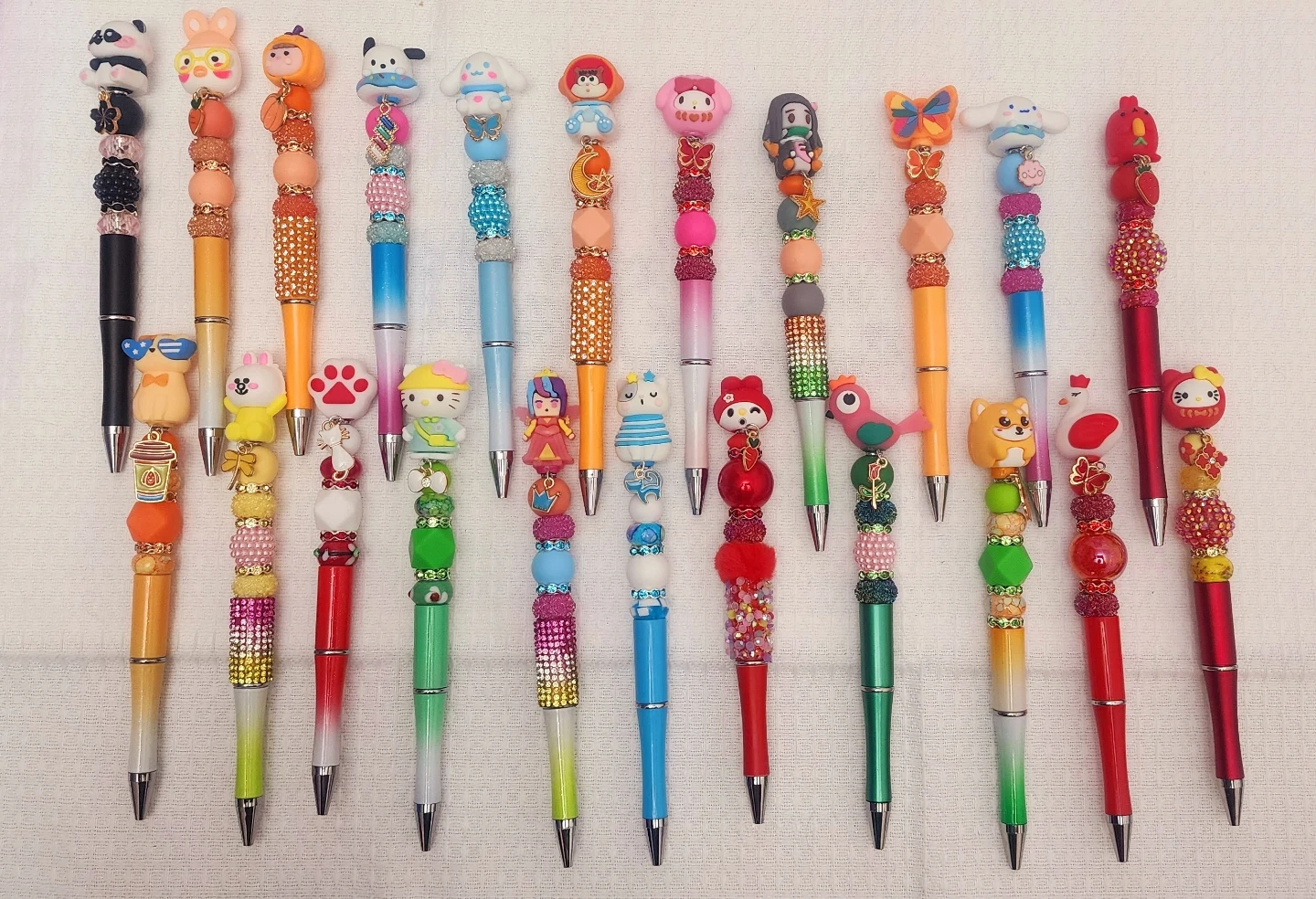 Check out these unique handmade pens! They're decorated with colourful beads and cute character toppers. A fun way to brighten up your desk or give as a gift!