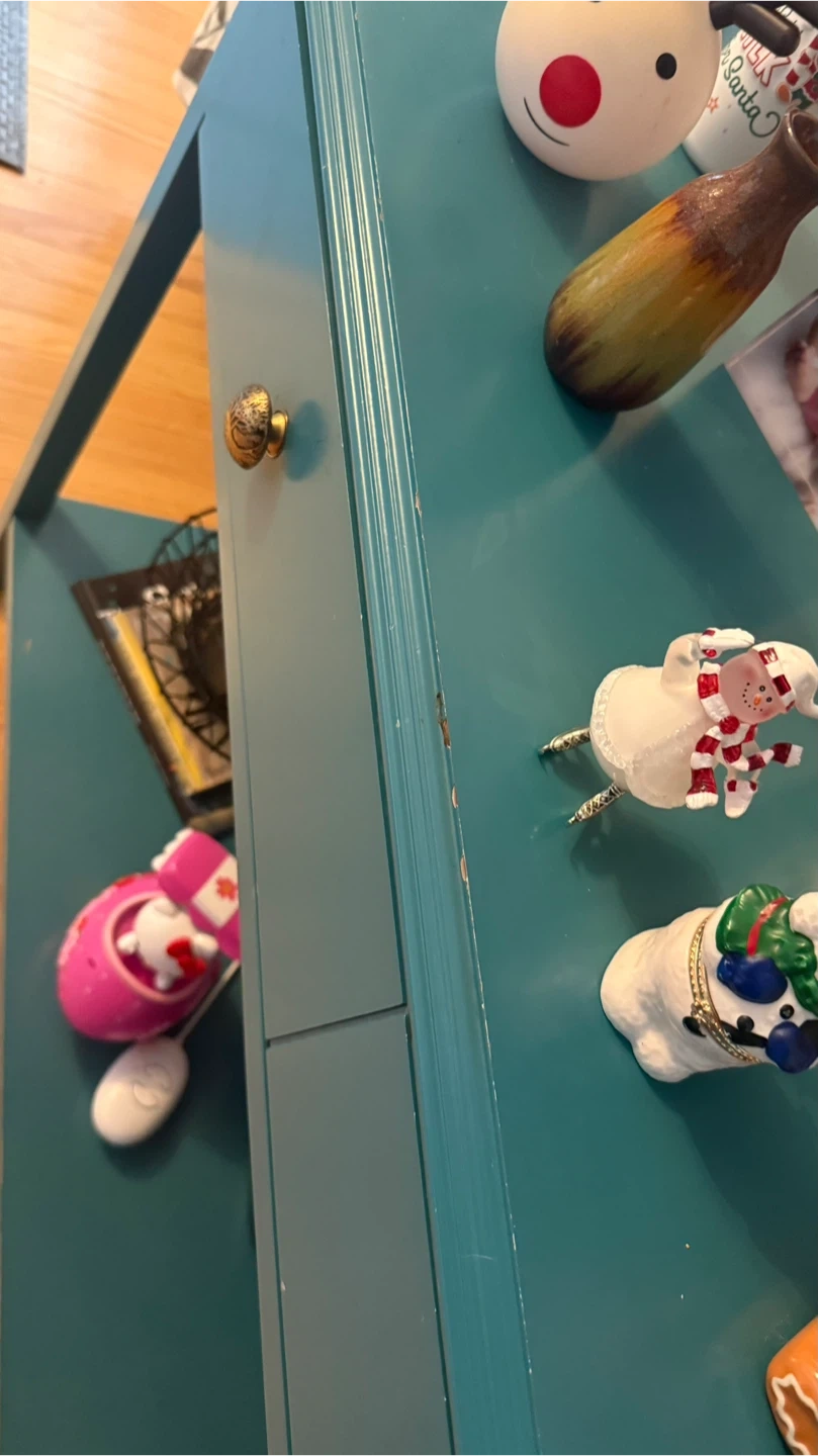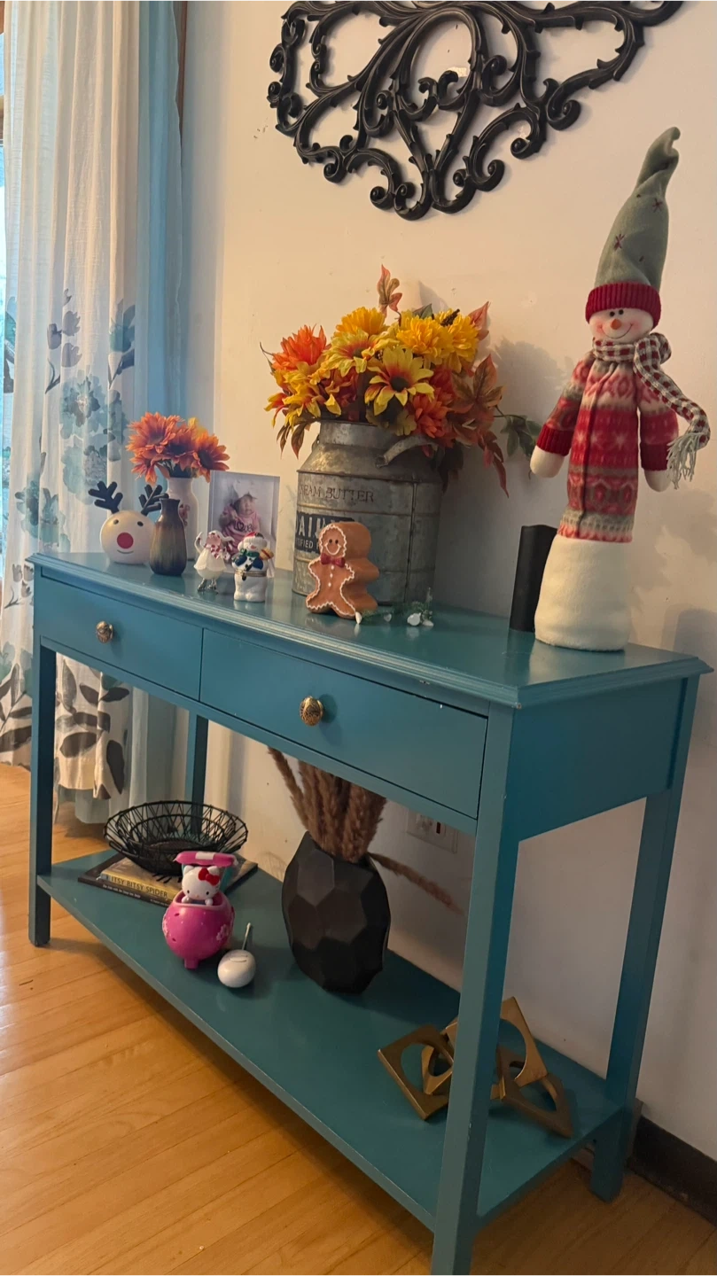 A lovely teal console table with drawers and a bottom shelf. It's perfect for entryways, living rooms, or anywhere you need a stylish surface for storage and decor