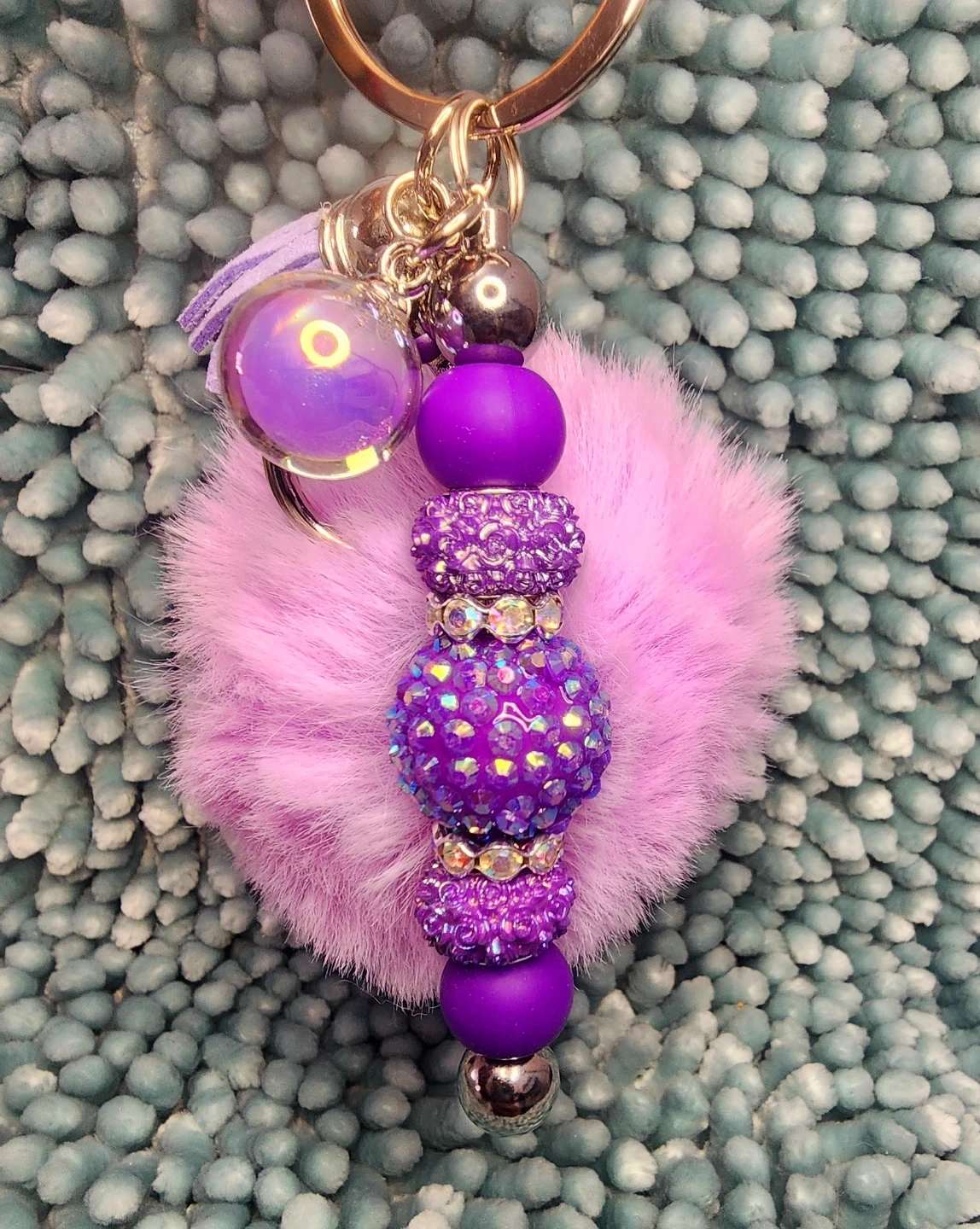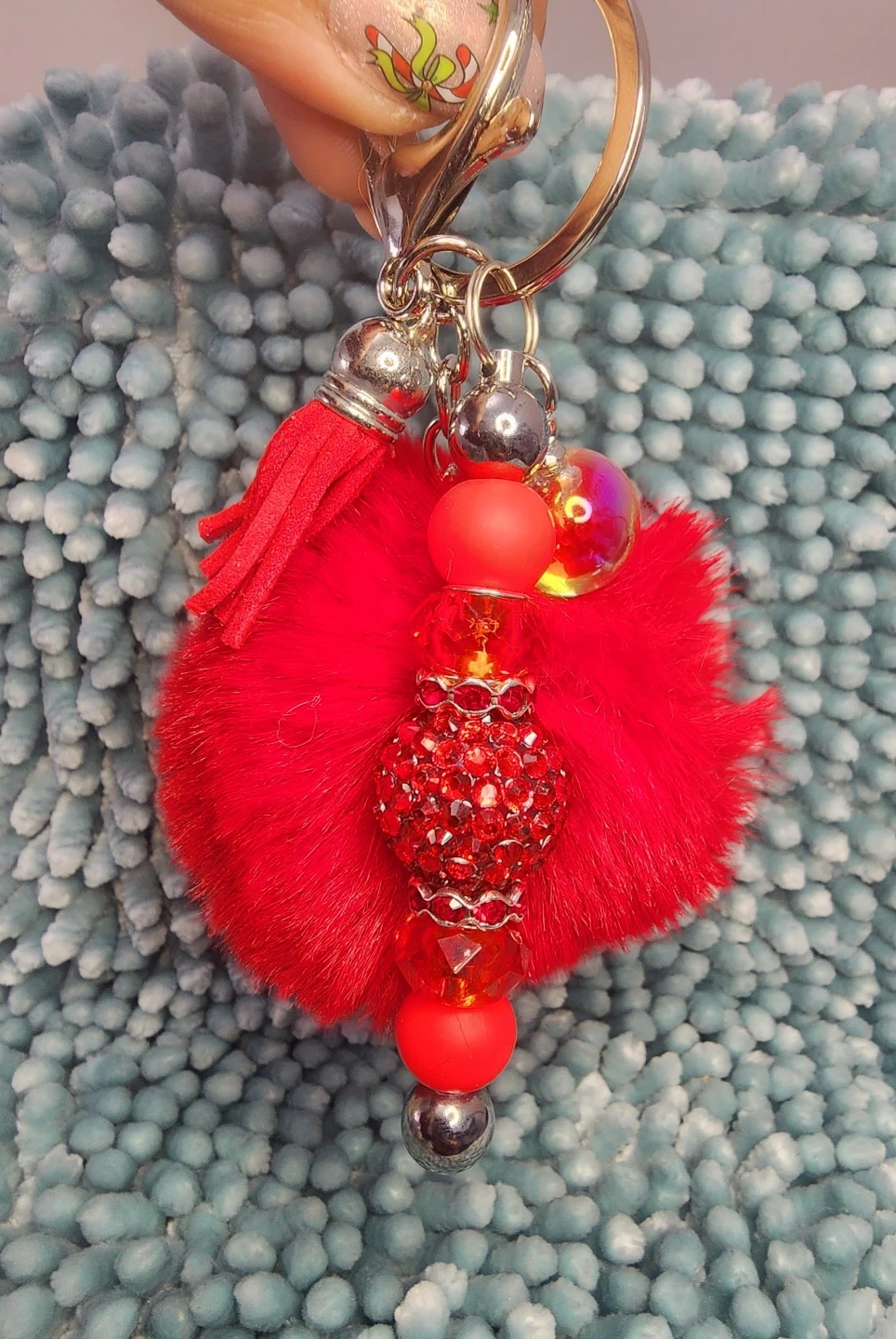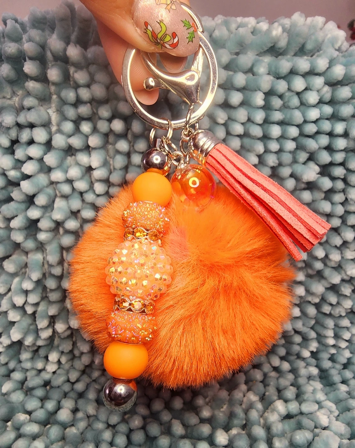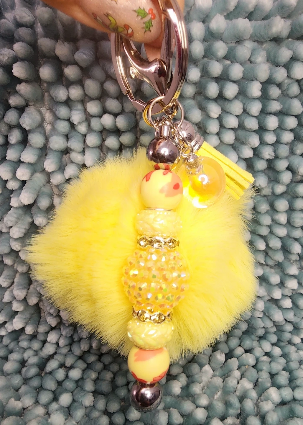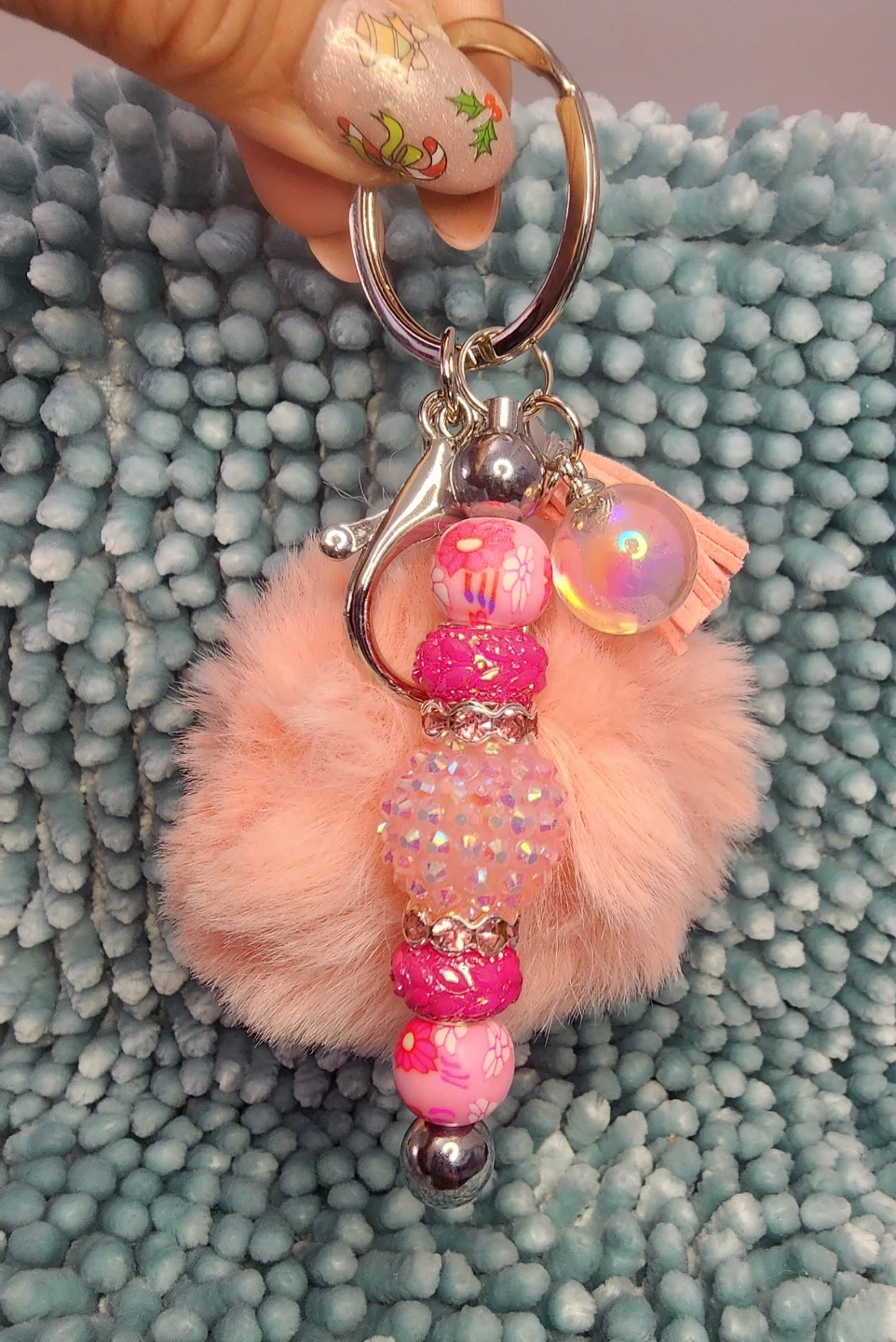 Check out these adorable handmade keychains! They feature a fluffy pom pom, decorative beads, a cute little charm, and a sturdy clip. Perfect for adding a touch of fun to your keys or bag!