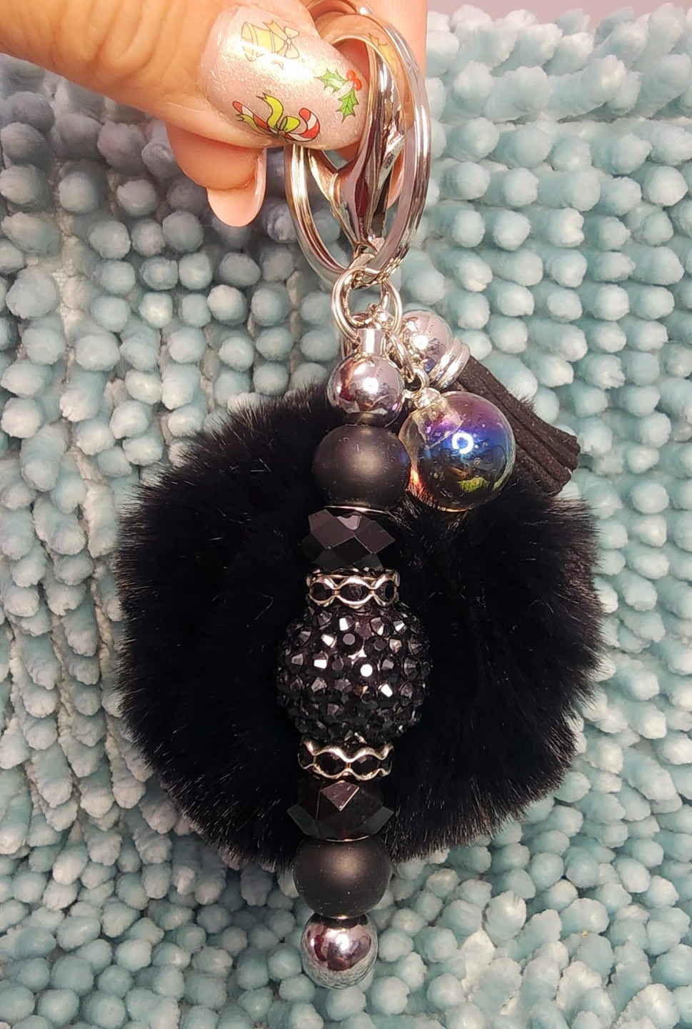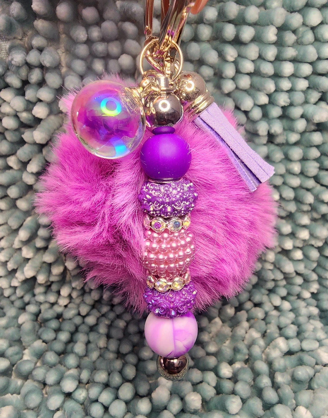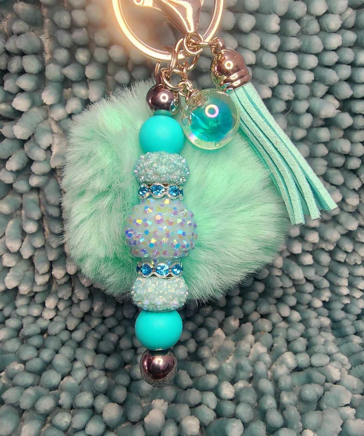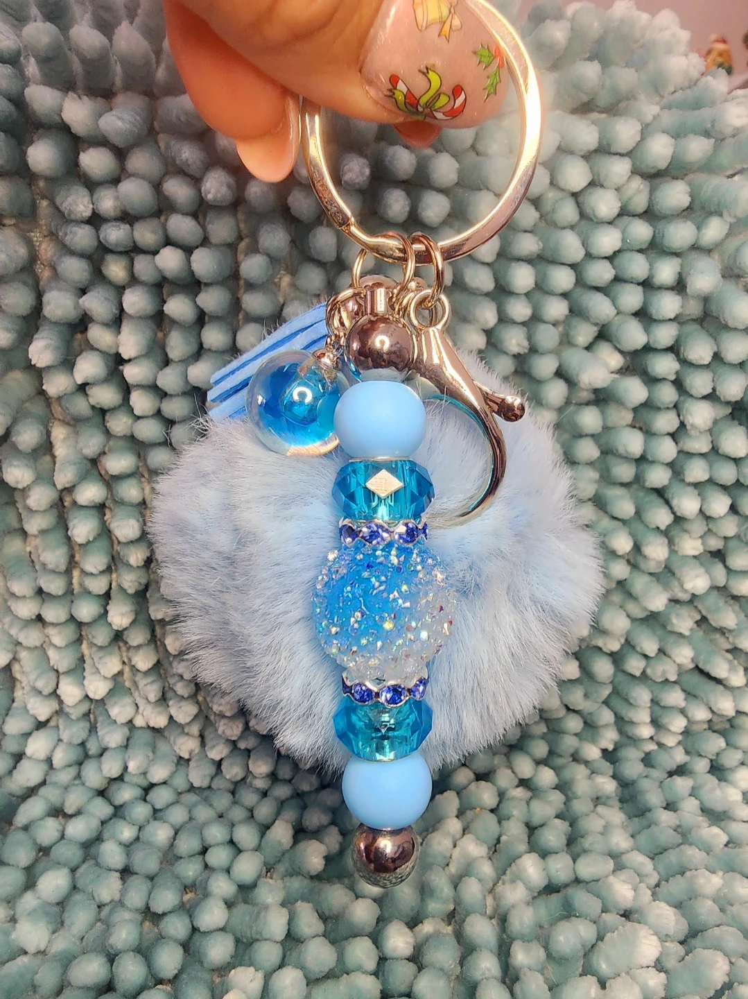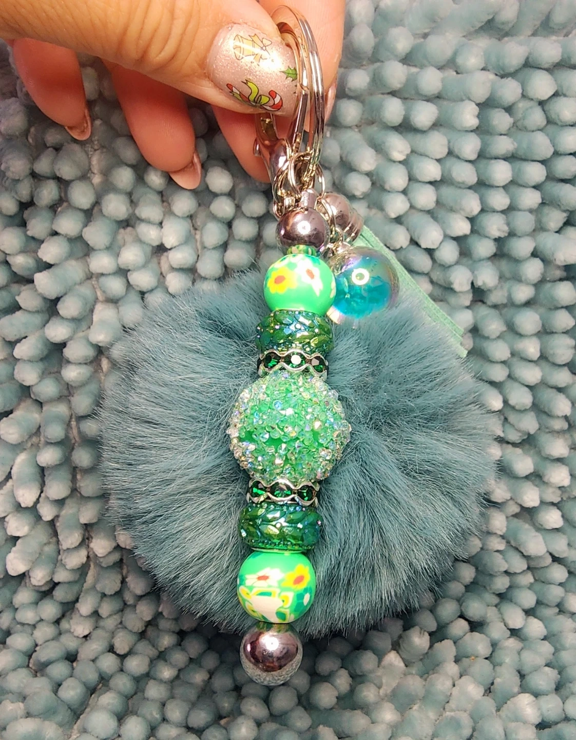 Check out these adorable handmade keychains! They feature a fluffy pom pom, decorative beads, a cute little charm, and a sturdy clip. Perfect for adding a touch of fun to your keys or bag!