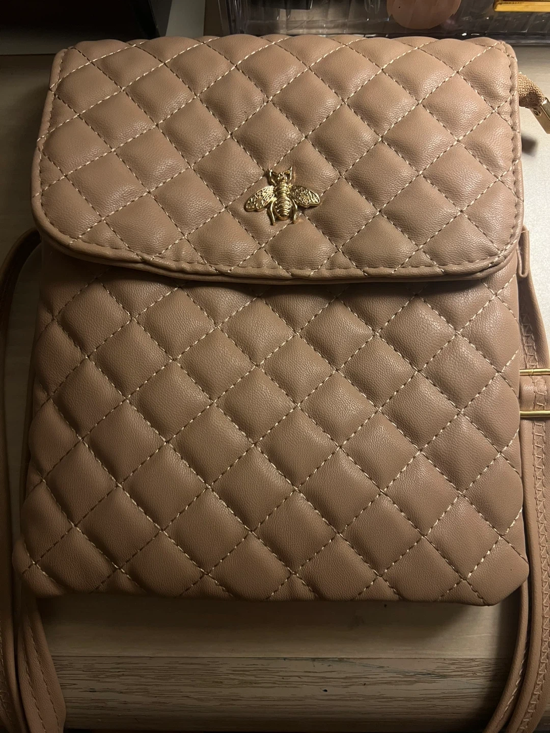 Check out this cute beige quilted crossbody bag! It features a stylish quilted pattern and a unique bee embellishment. Perfect for carrying your essentials in style!