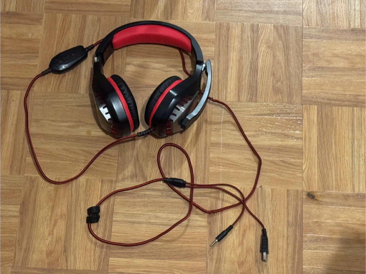 Auriculares (de color rojo, prenden en color rojo, tienen un pequeño control remoto para encender y apagar el micrófono)