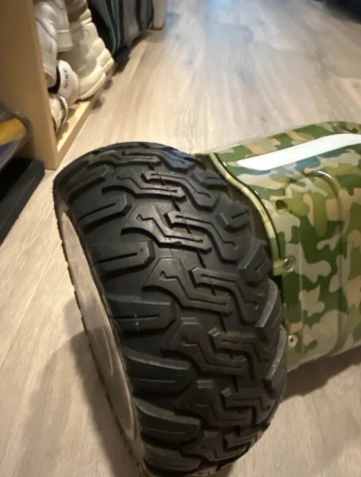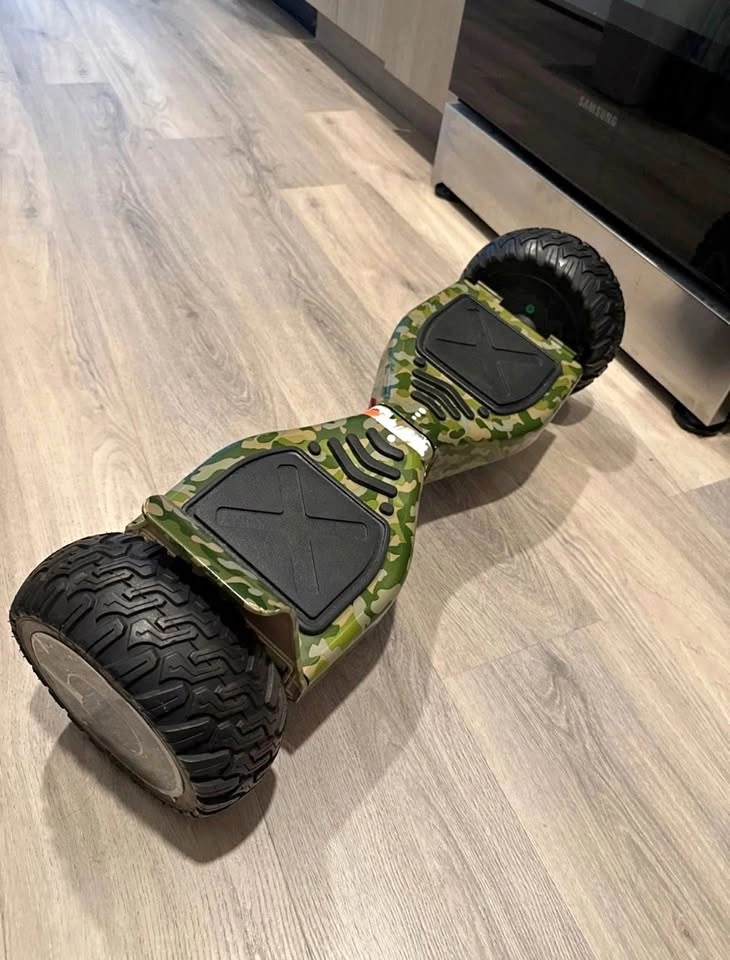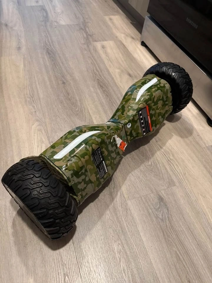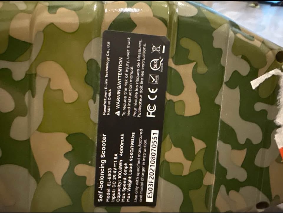 Selling an E-Link self-balancing scooter in a cool camouflage design! It's the EL-ES03 model and can handle a max weight load of 90kg or 198lbs. The scooter has a max speed of 6mph. Perfect for some fun outdoors!
