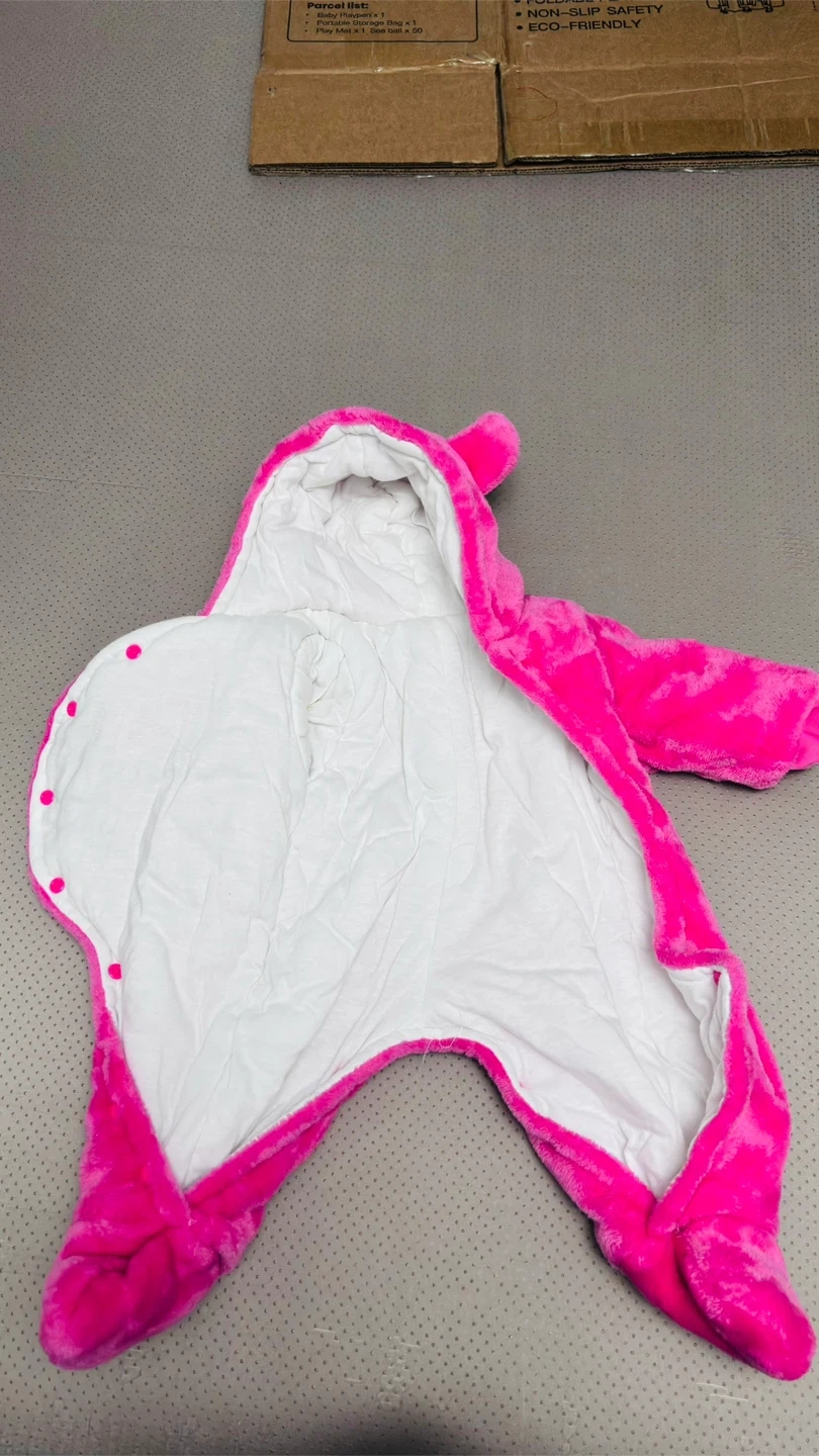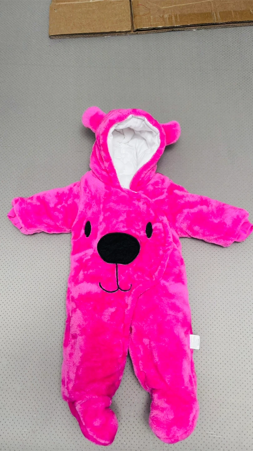 Check out this adorable pink bear snowsuit for your little one! It's super soft and cozy, perfect for keeping them warm during those chilly days. The hood even has cute little bear ears! It's in great condition and ready for a new home.