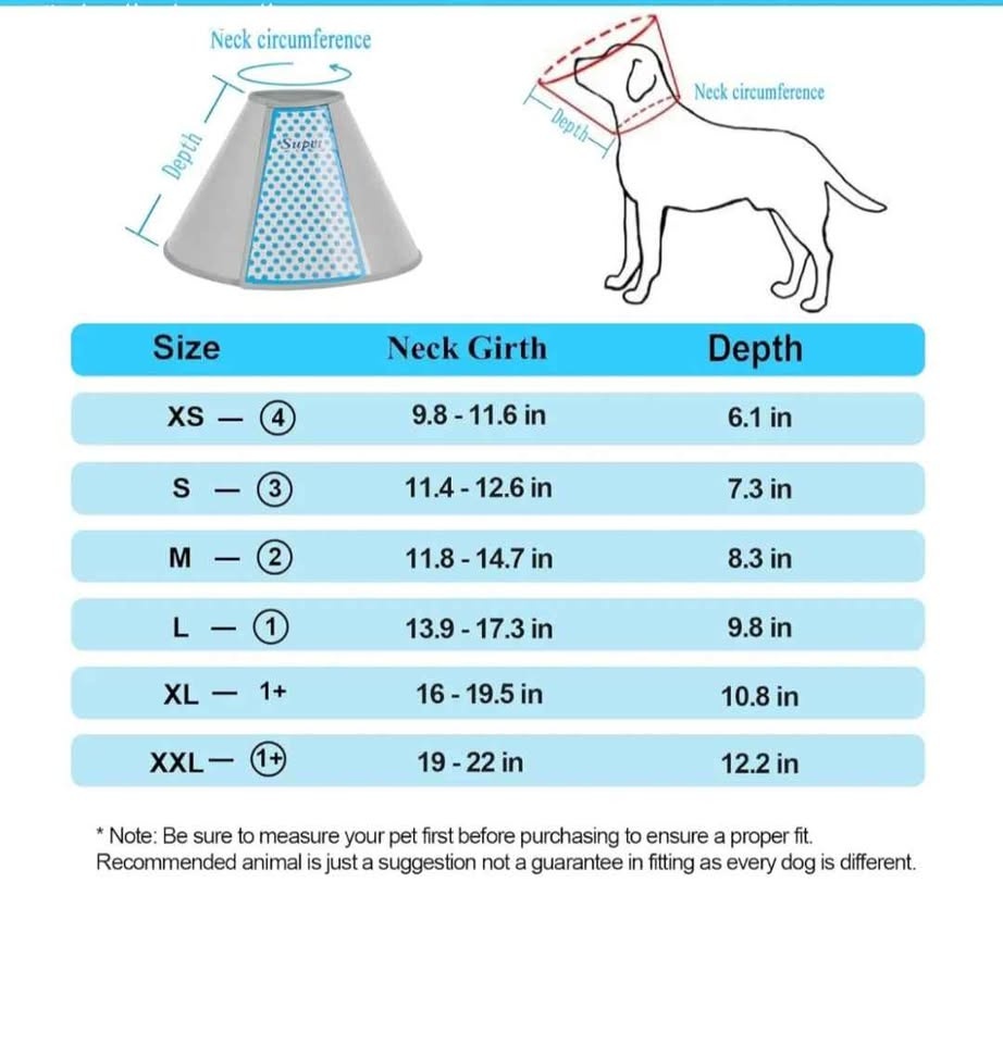Protective Designer Your pet after surgery, for wound treatment, skin conditions, or during personal care. Sizes available from Very Small (XS) to Very Large (XXL) to ensure the perfect size for your dog/cat (see table sizes in pictures).