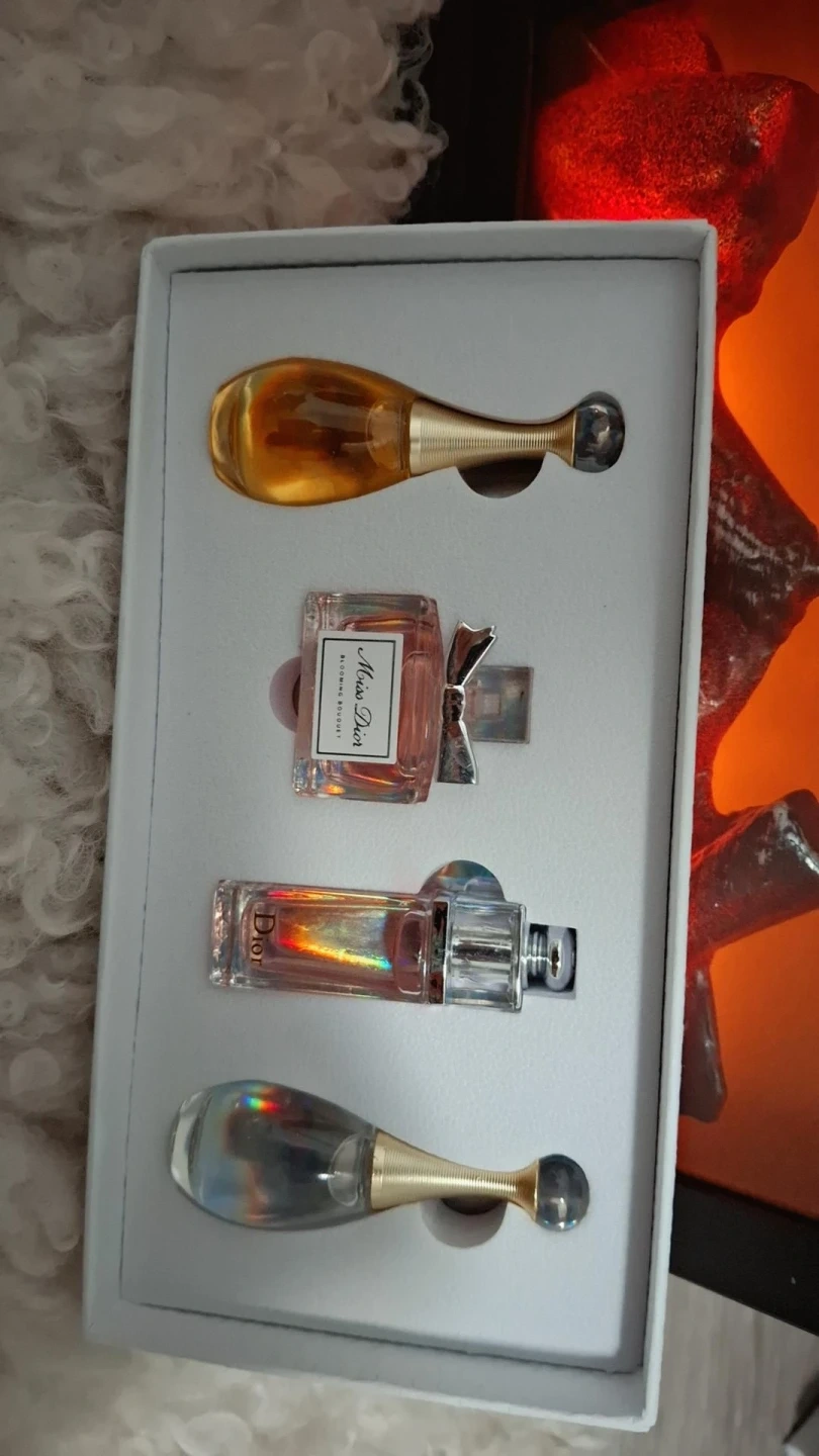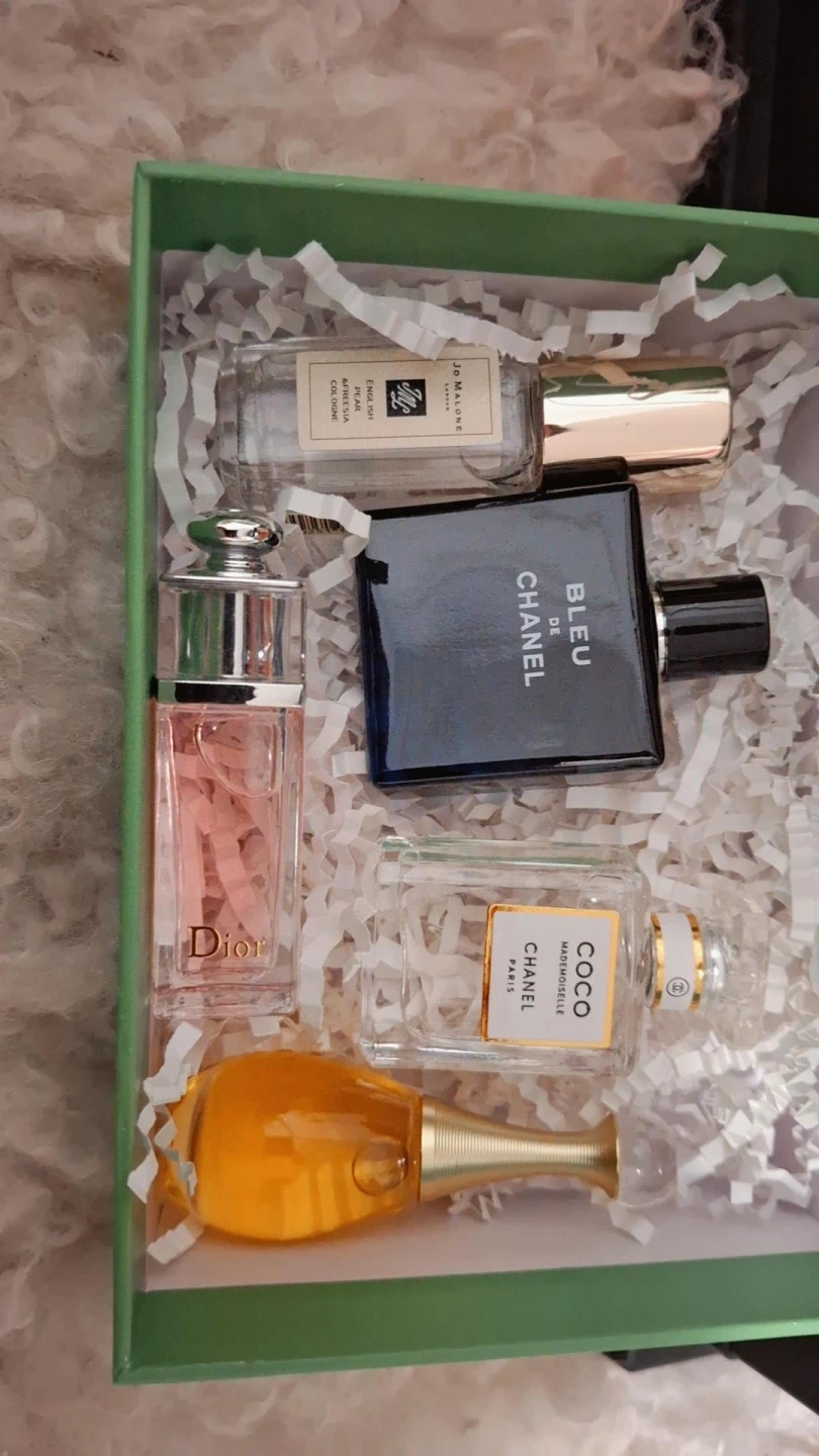 Selling a set of perfume miniatures from Dior and Chanel. Includes J'adore, Miss Dior, Bleu de Chanel, and Coco Mademoiselle fragrances. Great for travel or sampling different scents! Mix and match and get 5 bottles with a gift box for $60