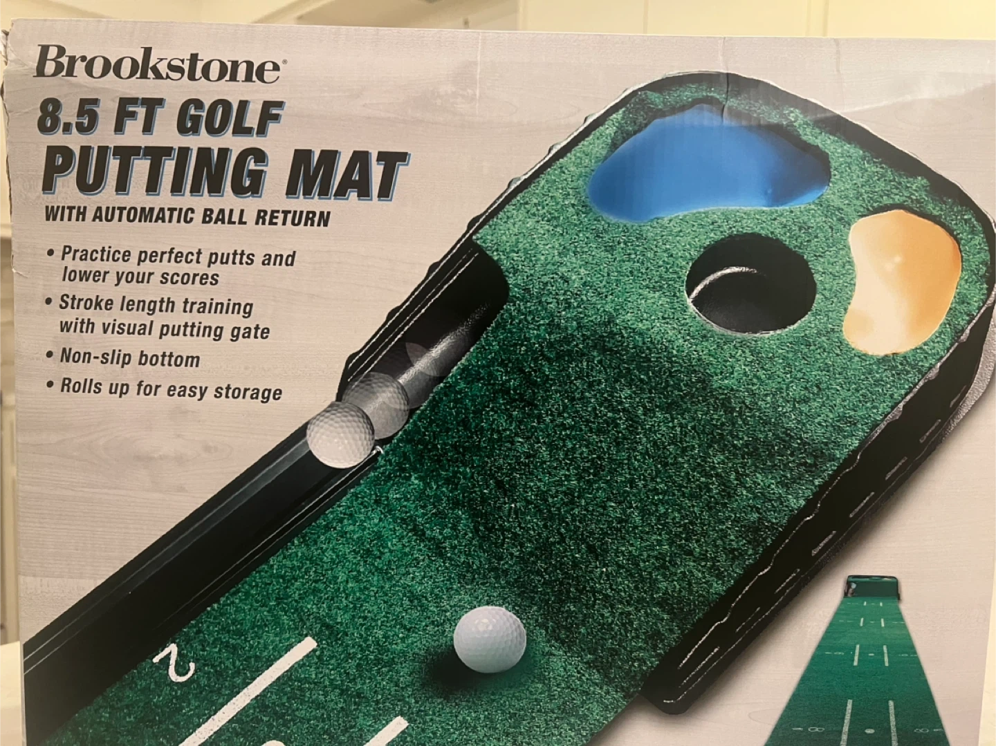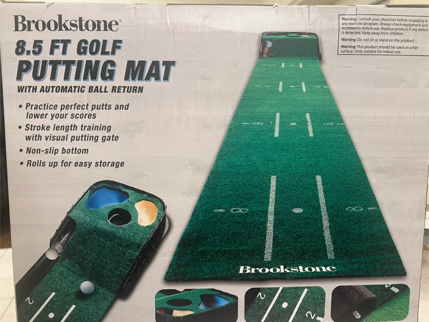 Get your golf game in shape with this Brookstone 8.5 FT Golf Putting Mat! It comes with automatic ball return, so you can practice perfect putts and lower your scores. It also has stroke length training with a visual putting gate and a non-slip bottom. Rolls up for easy storage and comes in the original box. Retails for $29.99.
