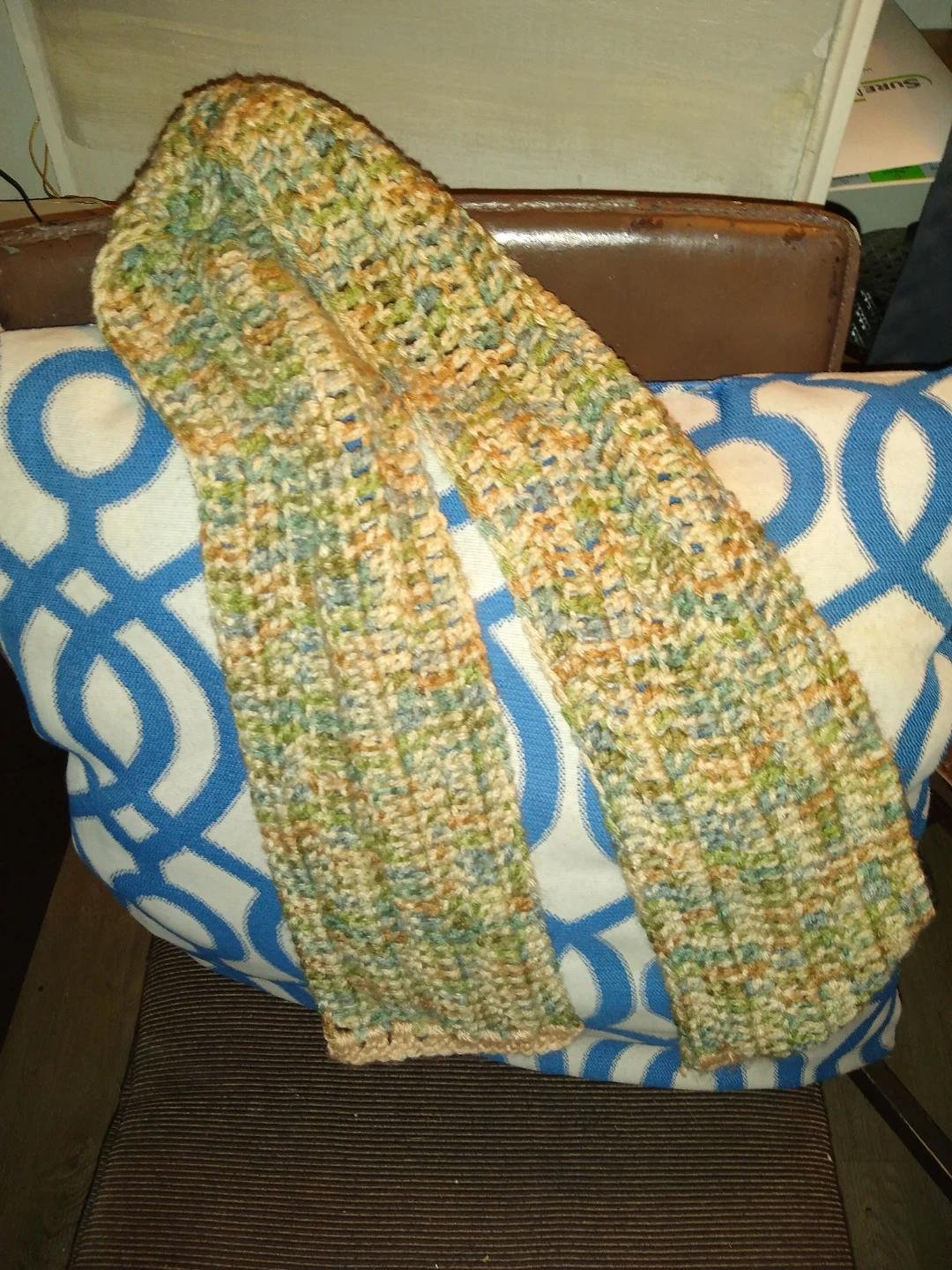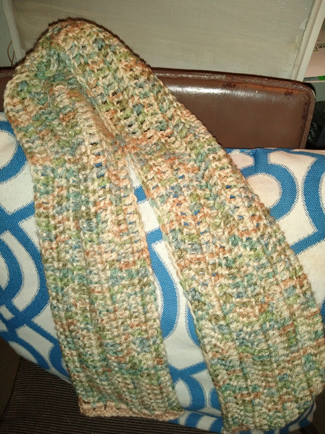 This is a pretty hand knit scarf of beige and kind of tan and a little bit of olive green very nice color palette. It's cozy and warm and perfect for somebody on your Christmas list.