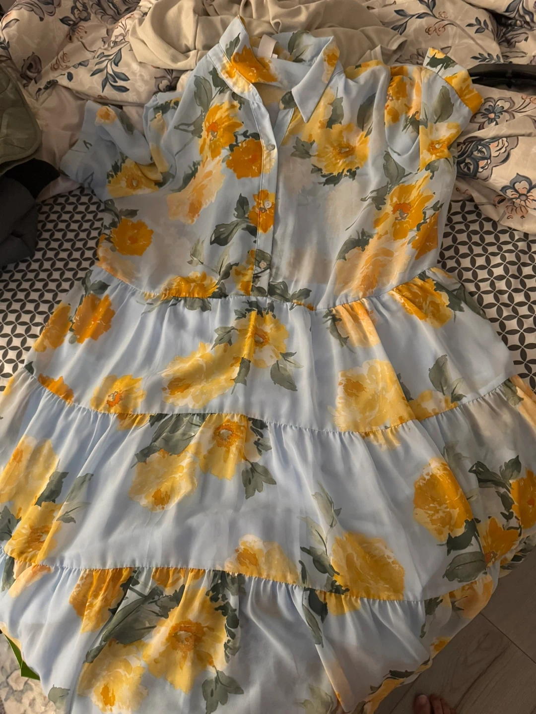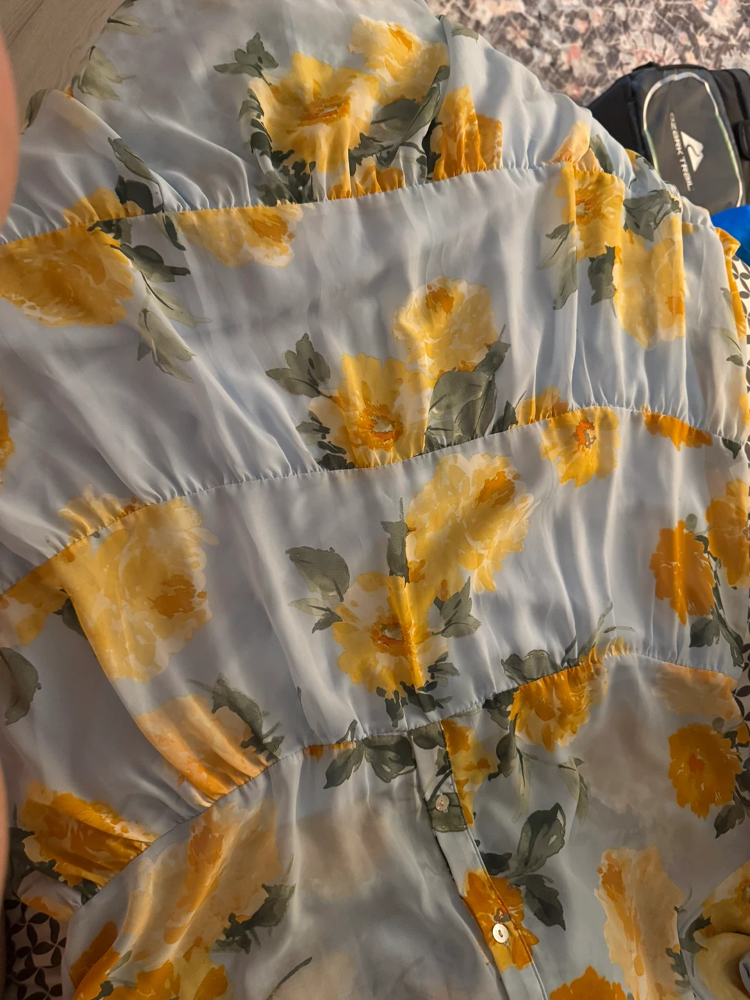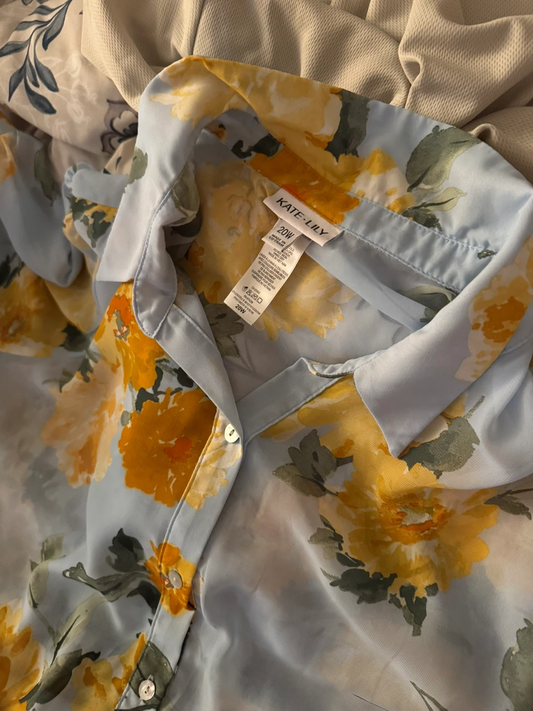 Beautiful Kate & Lily dress in a size 20W. It features a lovely floral pattern in shades of yellow and green on a light blue background. Perfect for a sunny day out!