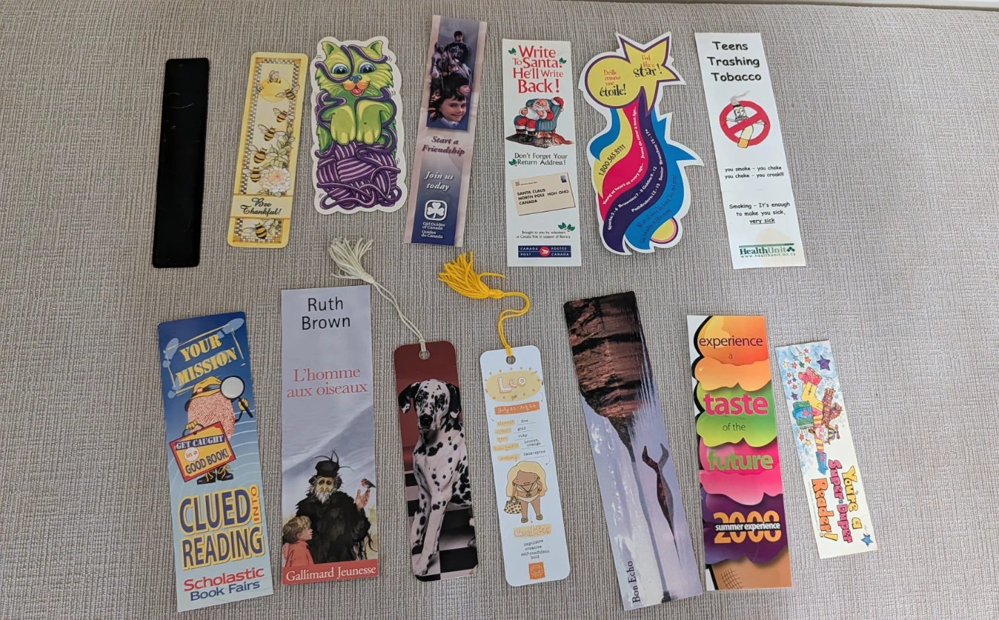 A collection of assorted bookmarks, including a 'Clued Reading' Scholastic Book Fairs bookmark, a 'Write To Santa He'll Write Back!' bookmark, and others with various designs and themes! Perfect for any book lover!