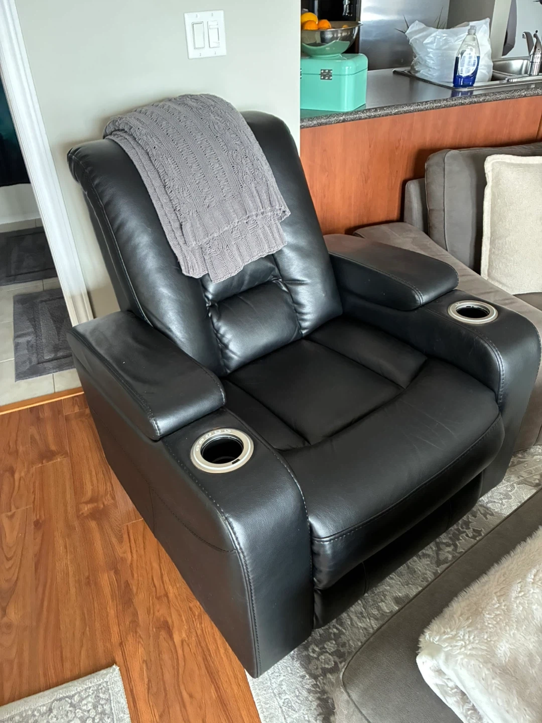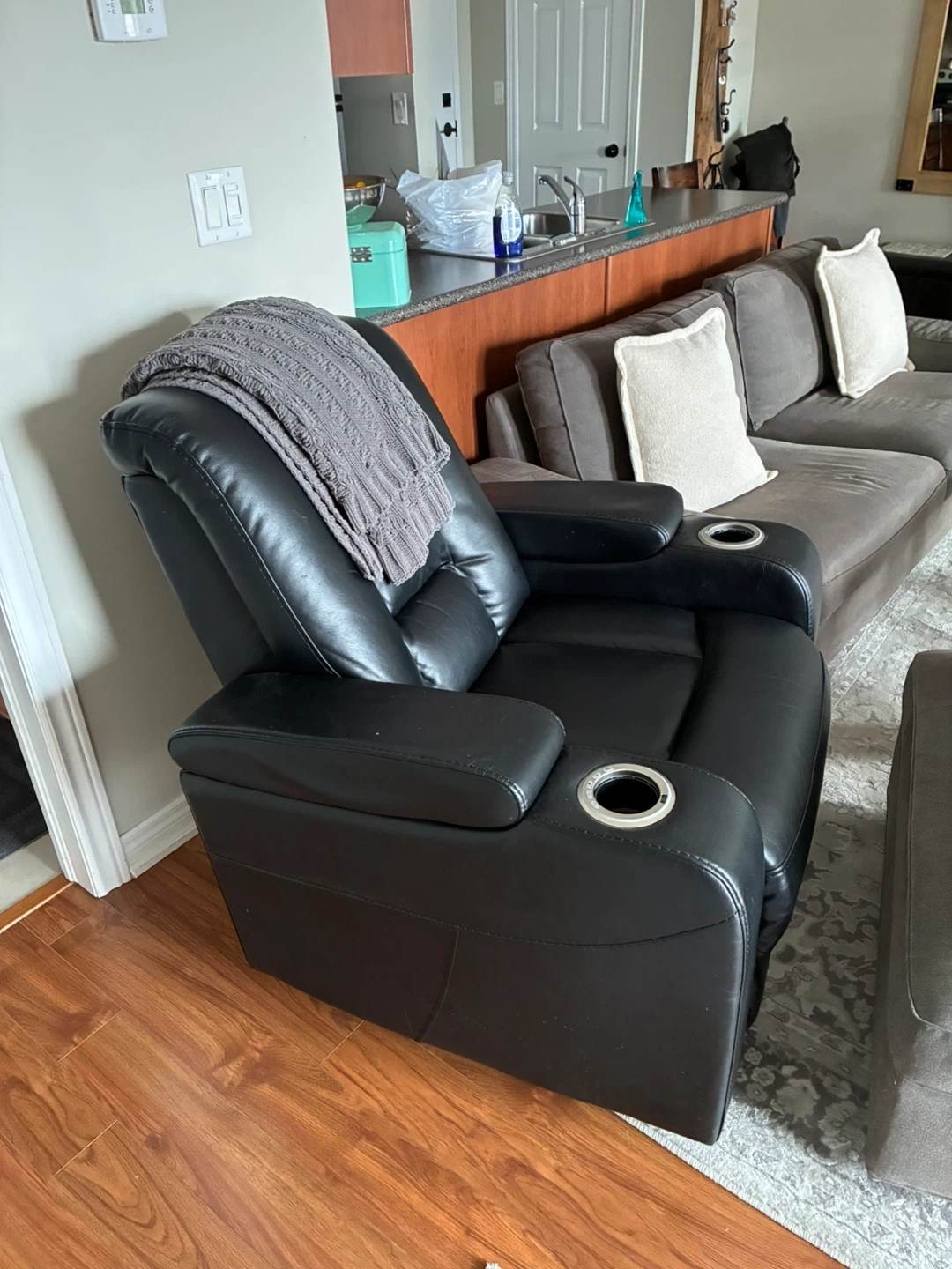 Selling a comfy black leather recliner chair! It's in great shape and has built-in cup holders. Perfect for relaxing and watching movies eh