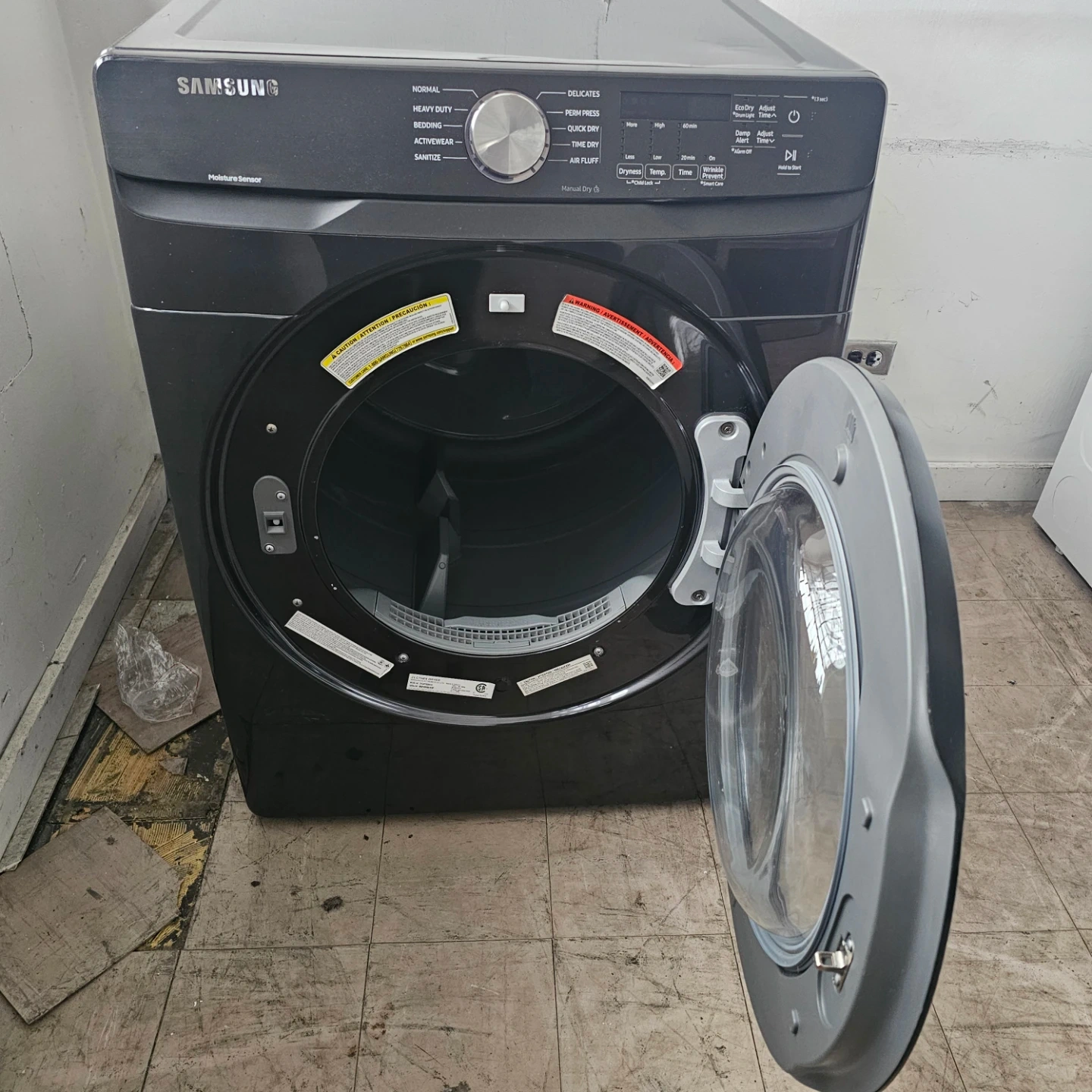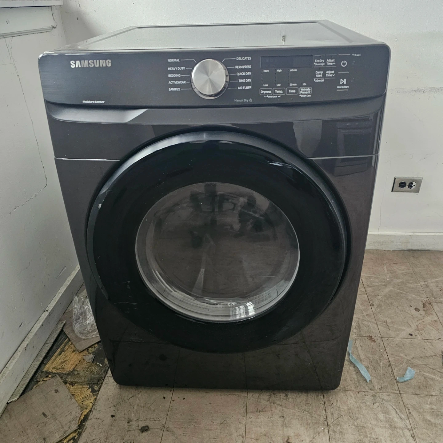 Selling a Samsung dryer in great condition! It has various settings like Normal, Heavy Duty, Bedding, Activewear, and Sanitize. There are also settings for Delicates, Perm Press, Time Dry, and Air Fluff. It has a moisture sensor as well!