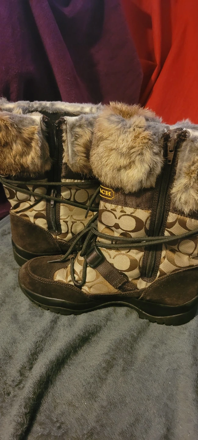 Coach Sahara winter boots in size 8.5M. They feature a stylish Coach logo pattern and a cozy fur trim.