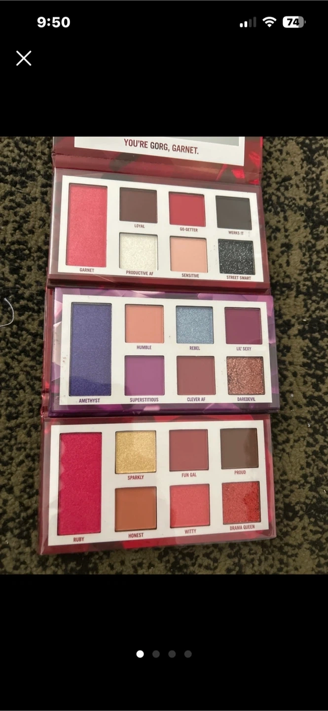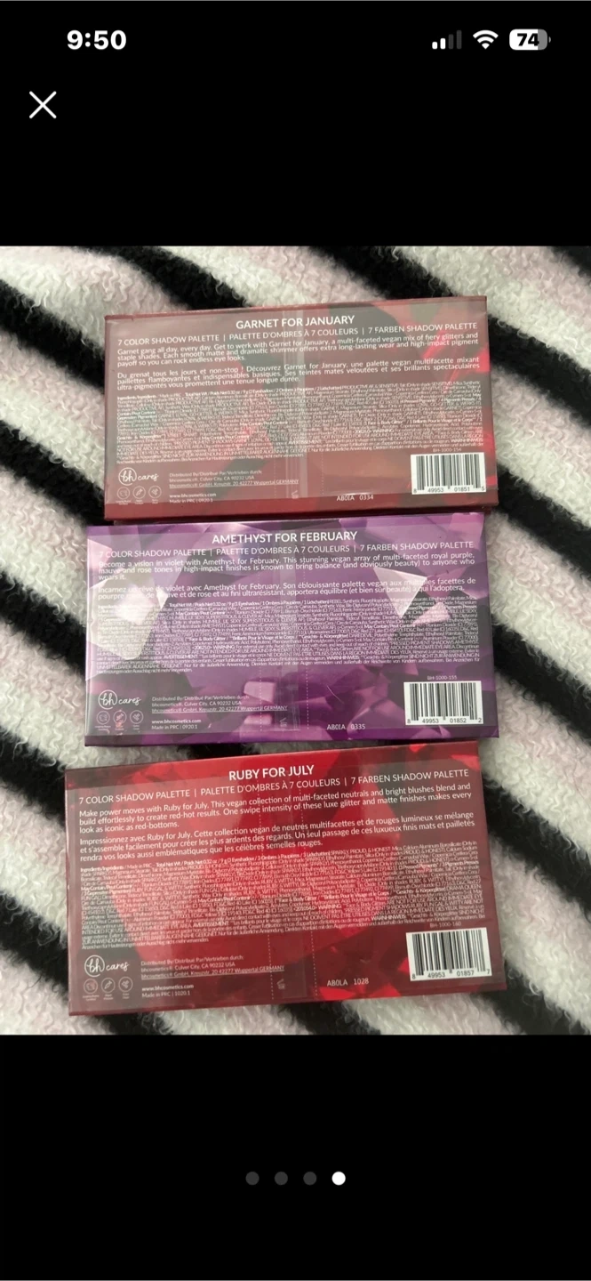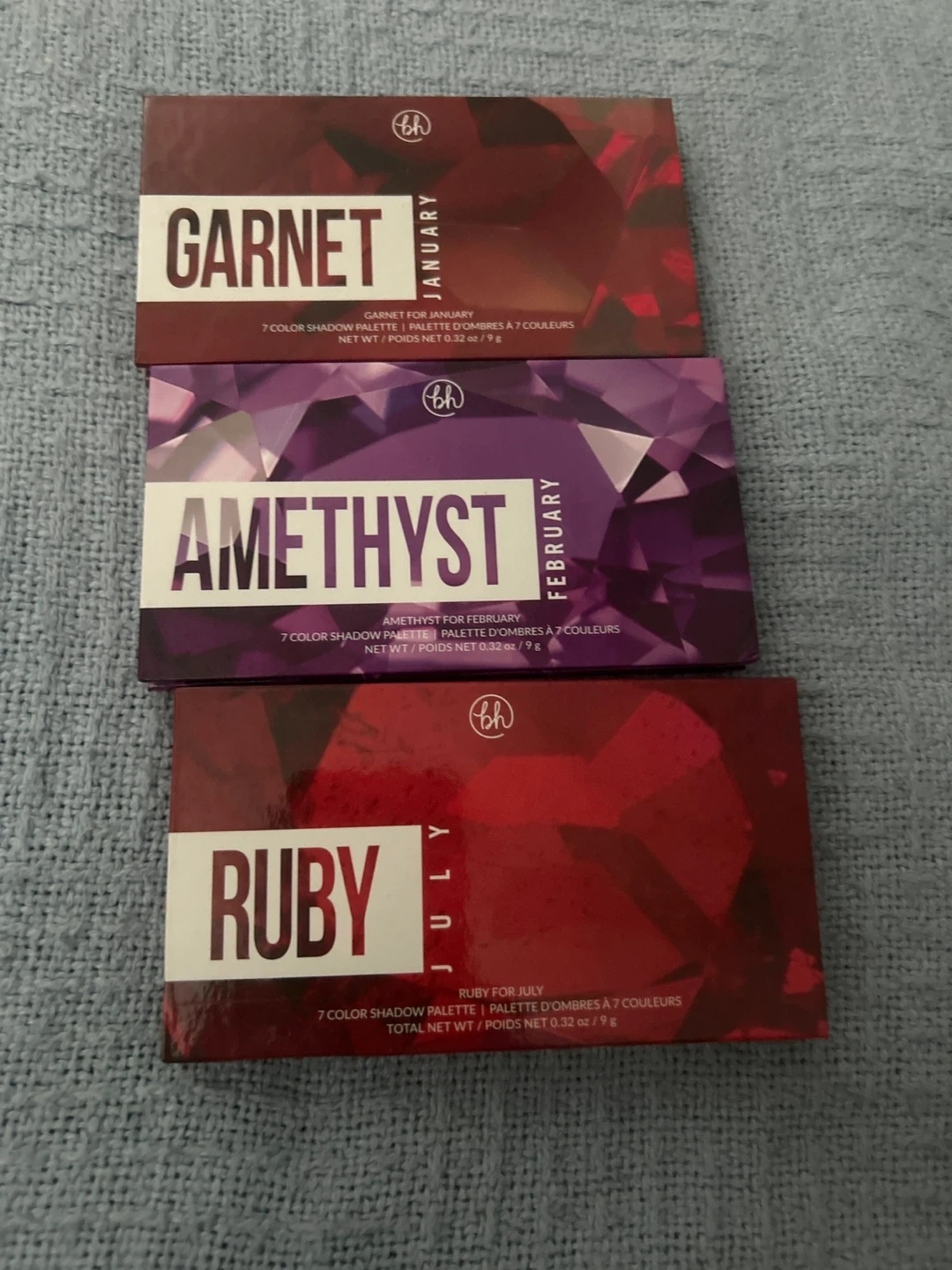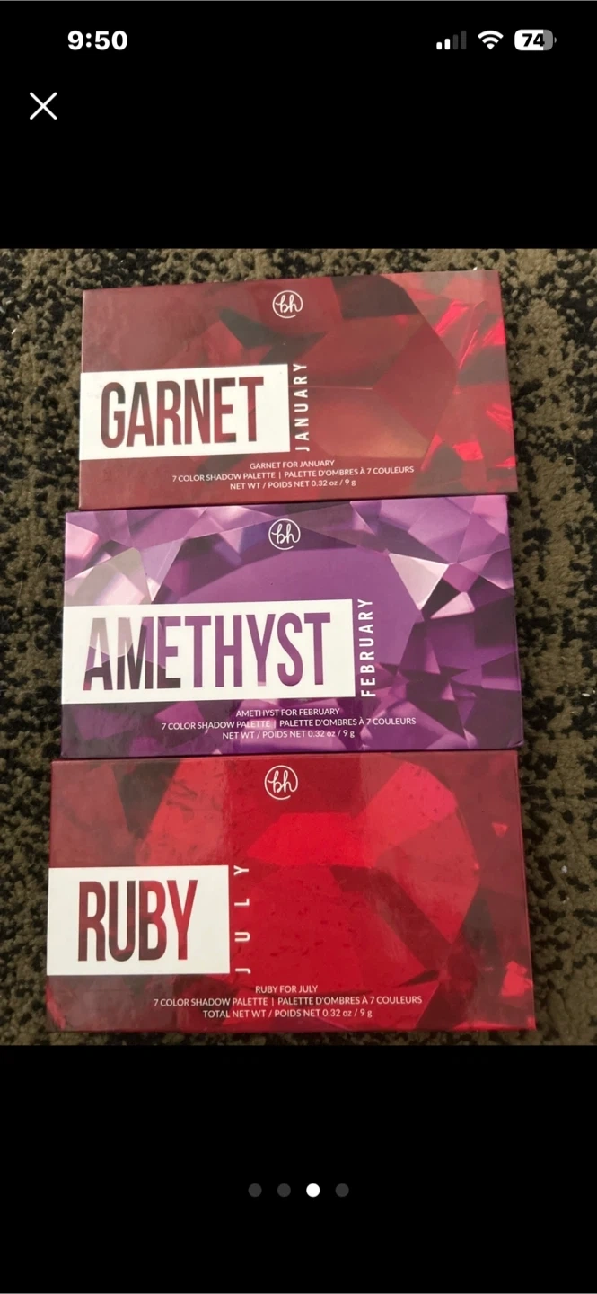 Selling a set of NEW BH Cosmetics eyeshadow palettes! This includes the Garnet (January), Amethyst (February), and Ruby (July) palettes. Still in silicone wrap!!