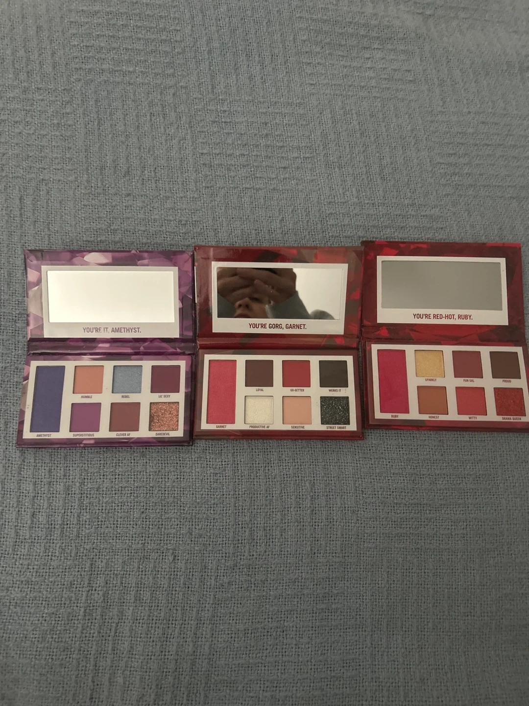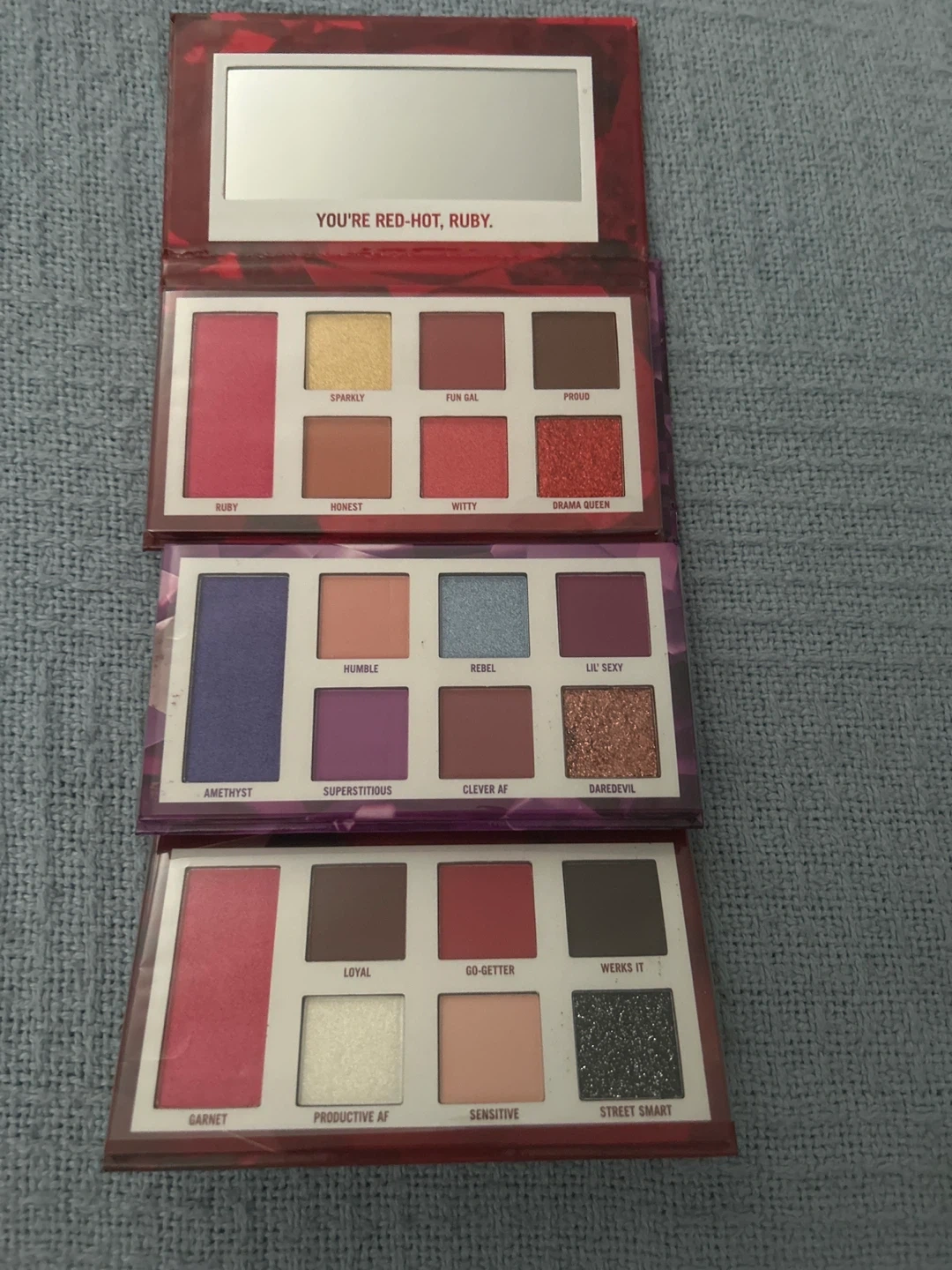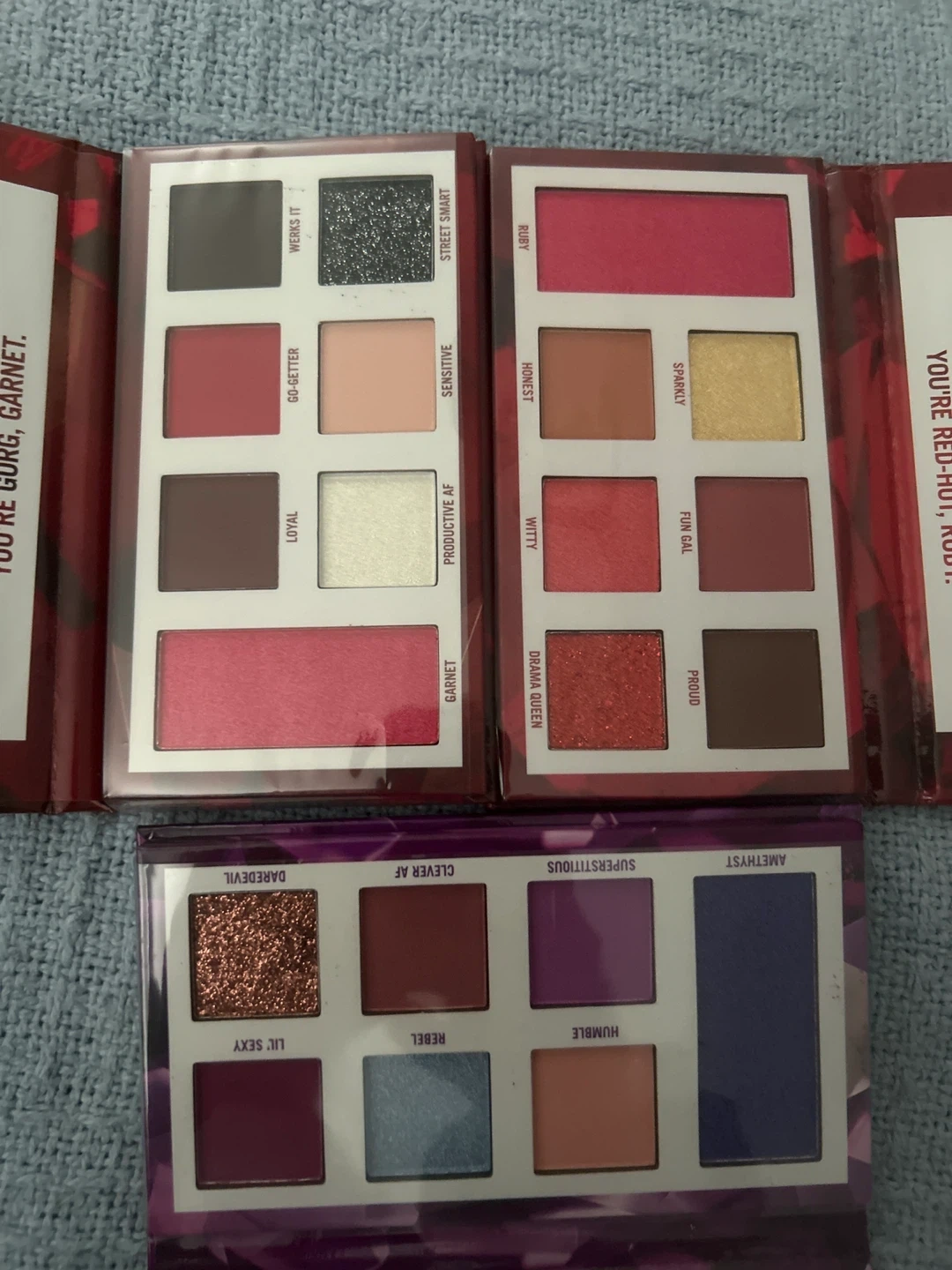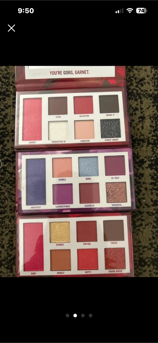 Selling a set of NEW BH Cosmetics eyeshadow palettes! This includes the Garnet (January), Amethyst (February), and Ruby (July) palettes. Still in silicone wrap!!