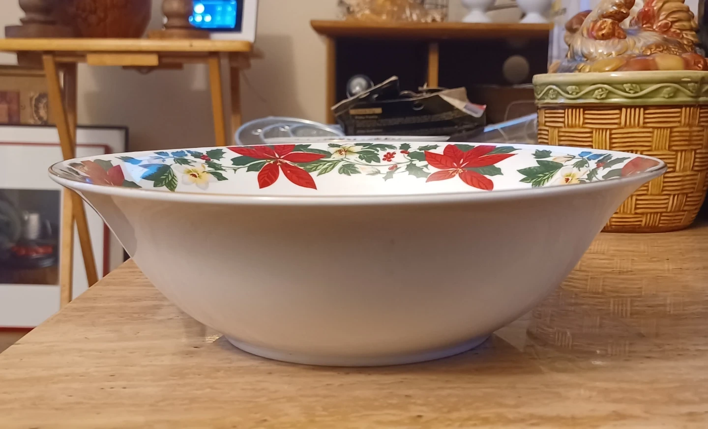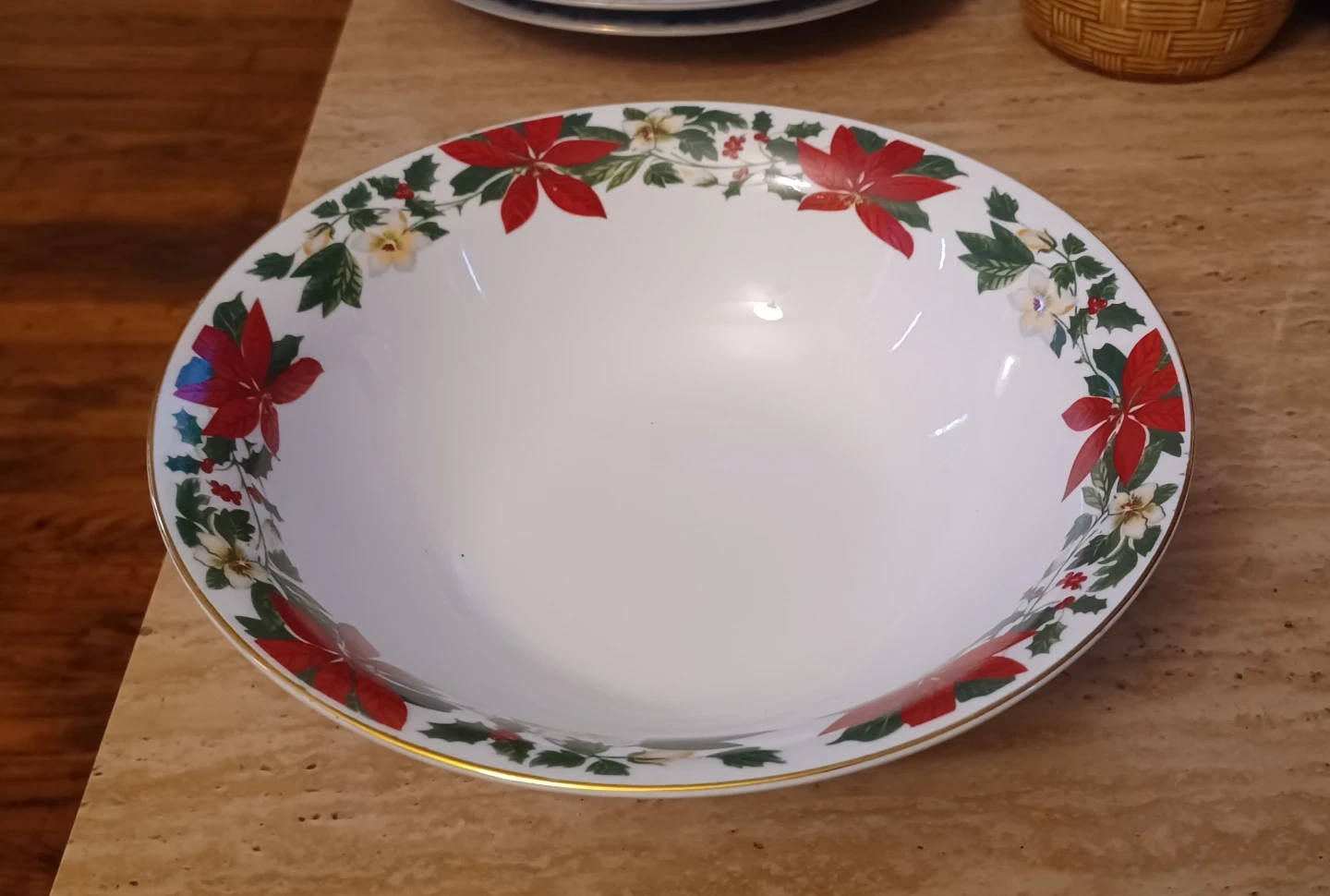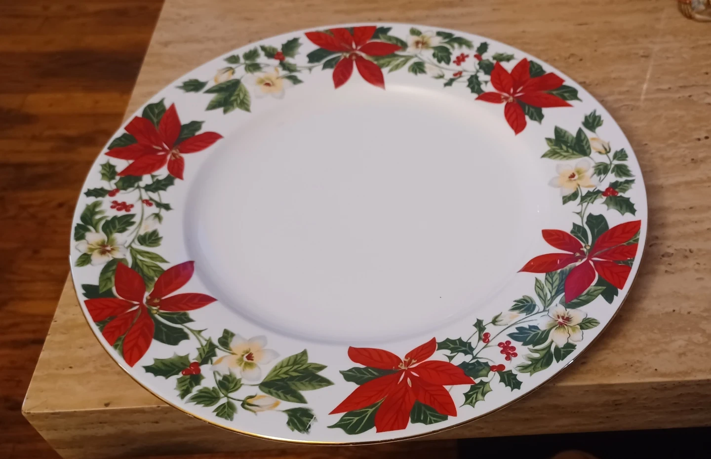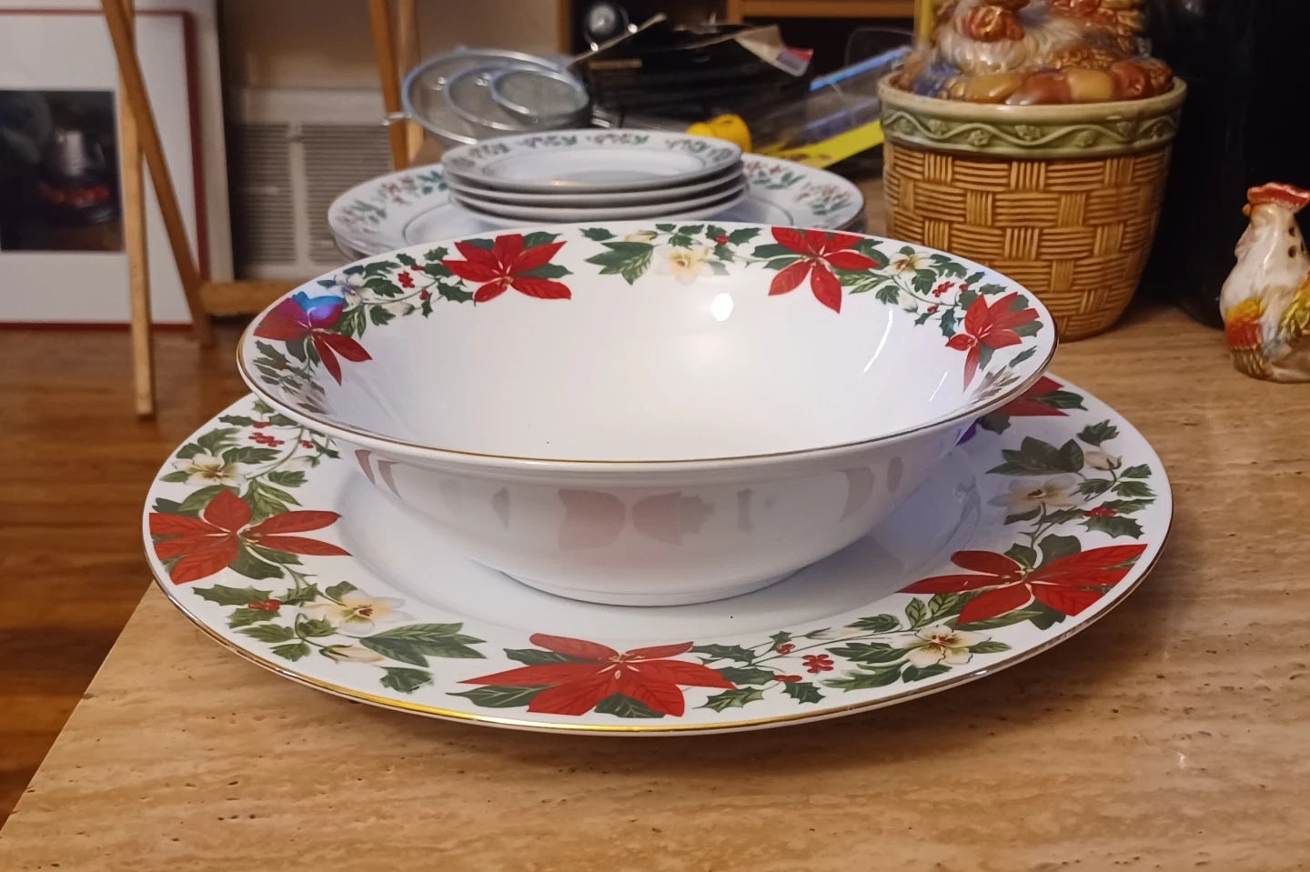 Selling a Gibson Everyday serving bowl and plate set. The set features a festive Christmas poinsettia design. Hand wash is recommended. Perfect for holiday gatherings!