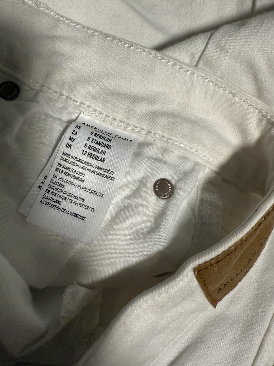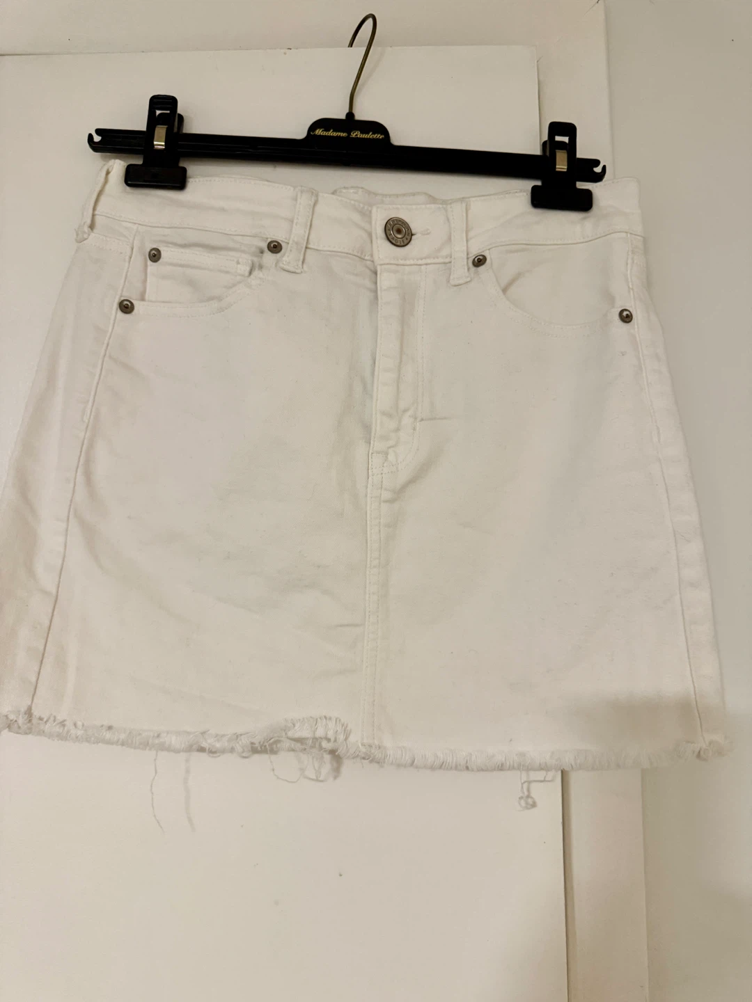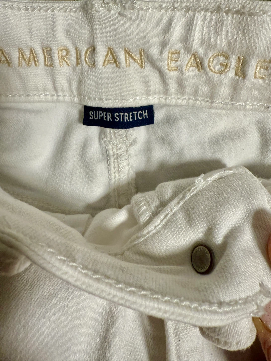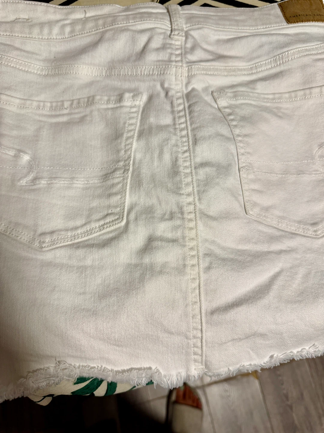 Selling a cute American Eagle white denim skirt! It's a size 8 regular and has a super stretch. The material is 90% cotton, 7% polyester, and 3% elastane. It's in great condition and ready for a new wardrobe!
