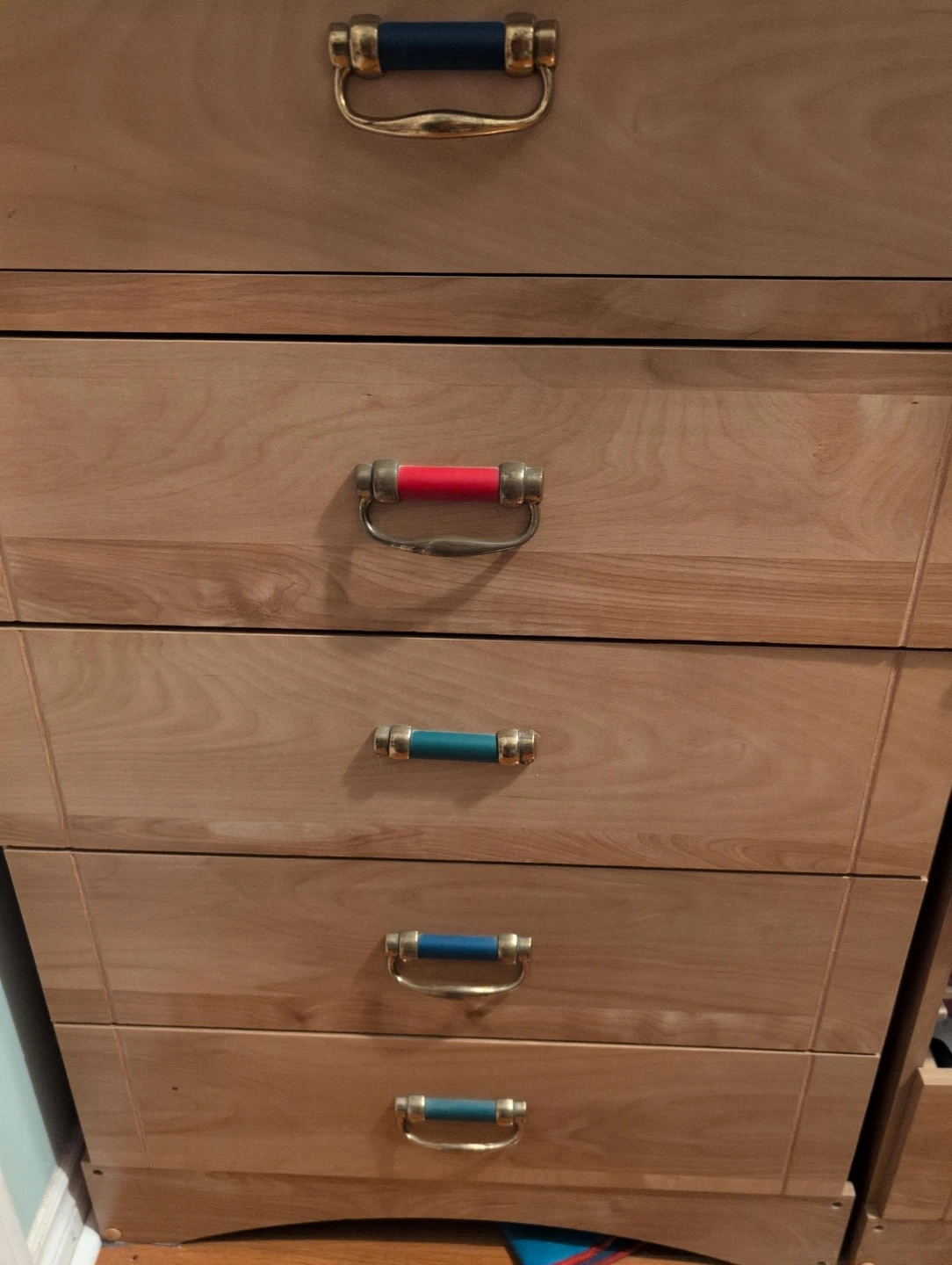 Here's a wooden dresser with some unique colourful handles! It has a classic look with a fun twist. Pick up only as it is