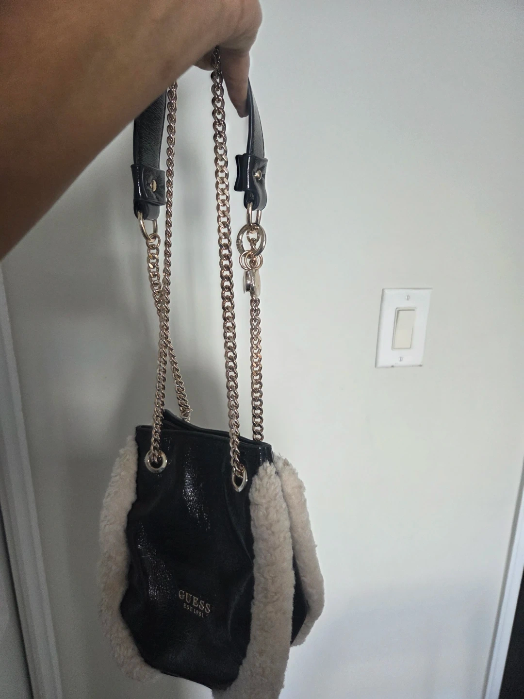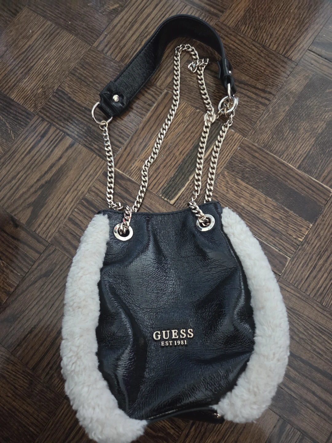 Check out this stylish Guess purse! It features a black body with a faux fur trim, giving it a unique and fashionable look. The chain strap adds a touch of elegance, making it perfect for any occasion. It's in great condition and ready for a new home!