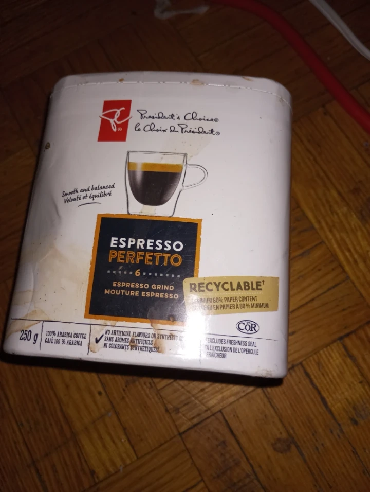 Selling a 250g container of President's Choice Espresso Perfetto espresso grind coffee