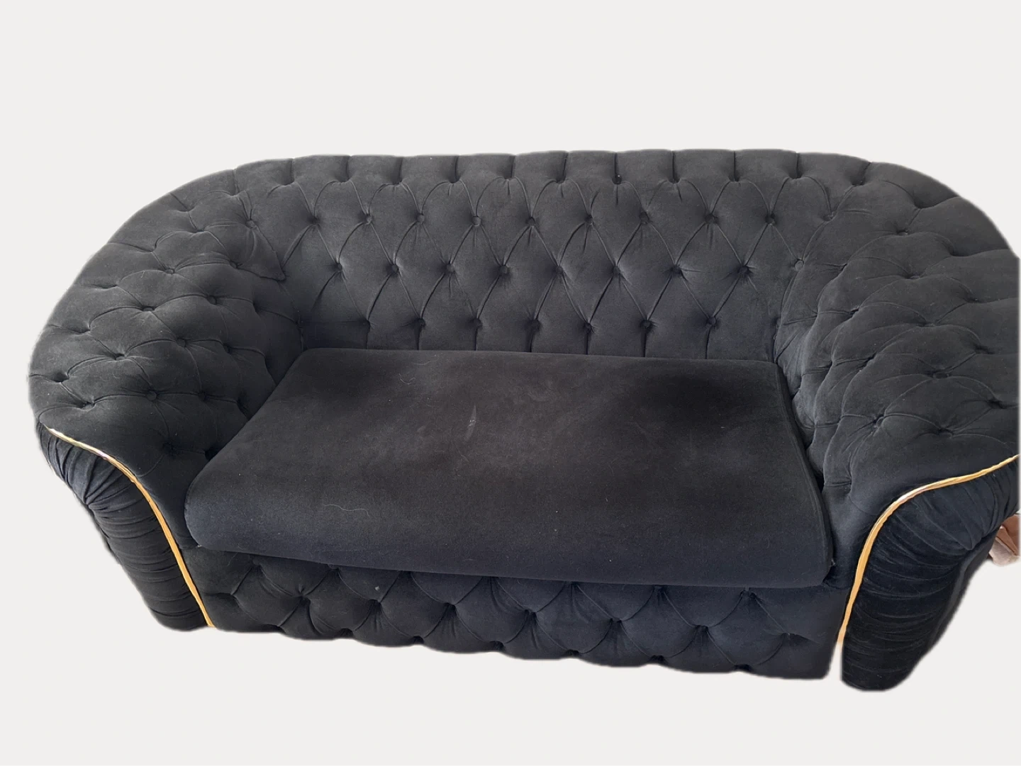 Selling a stylish black loveseat featuring a tufted design and elegant gold trim. It's a beautiful piece that could add a touch of sophistication to any living space. The material is soft and comfortable, perfect for relaxing!