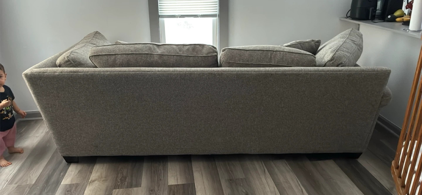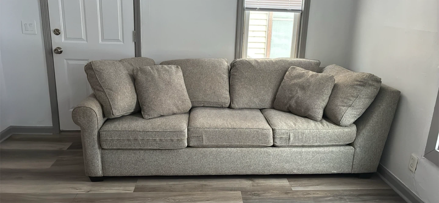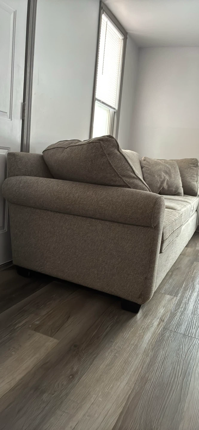 Selling a comfortable beige sofa that's perfect for any living room! It features a neutral color that can easily match any decor. This sofa offers a cozy spot for relaxing or entertaining guests. It's in great condition and ready for a new home!