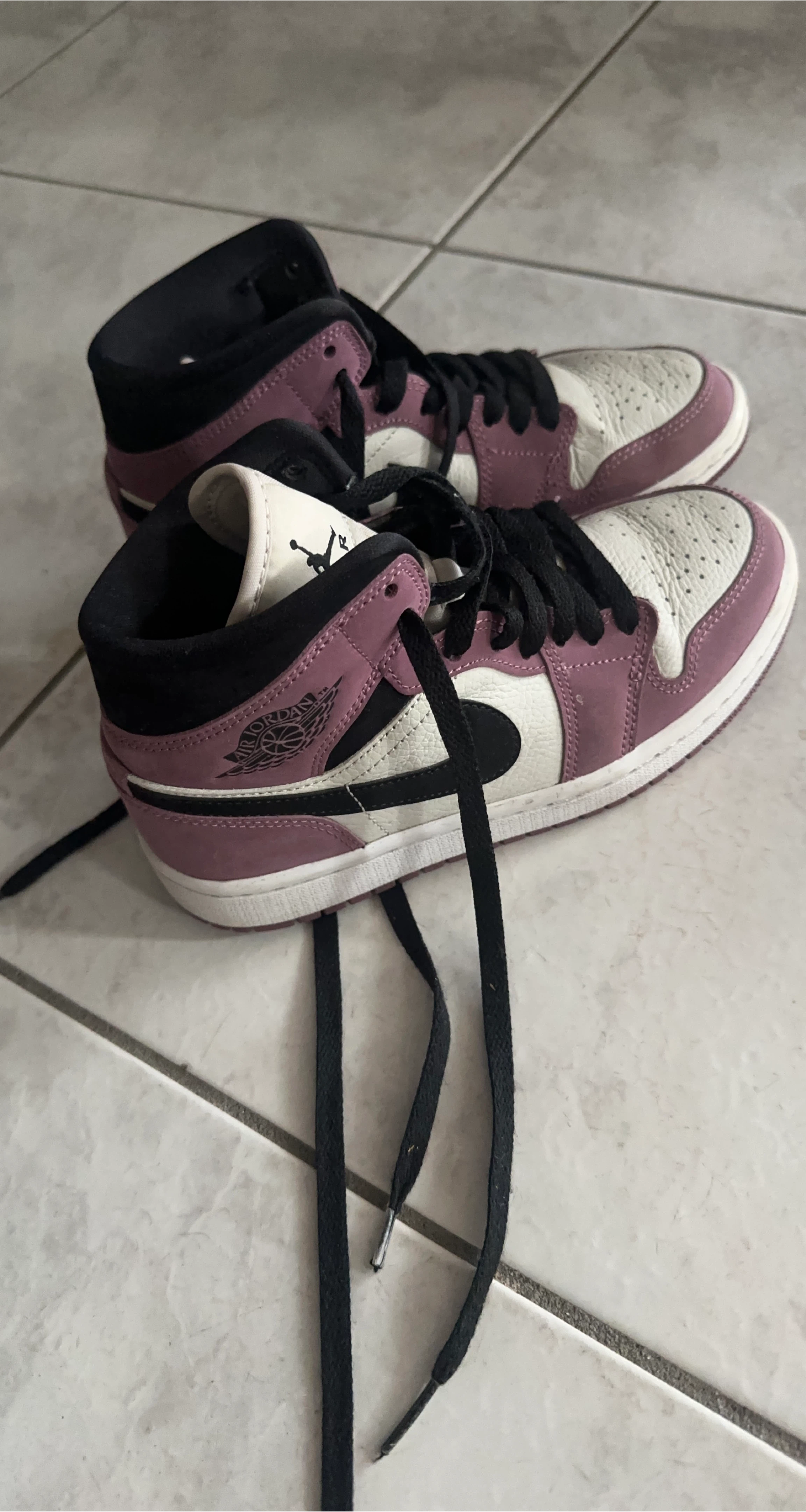 Selling a pair of Nike Air Jordan 1 Mid sneakers in the Plum Fog colorway. These are in great condition and ready for a new owner! They feature the classic Air Jordan design with a stylish color combination.